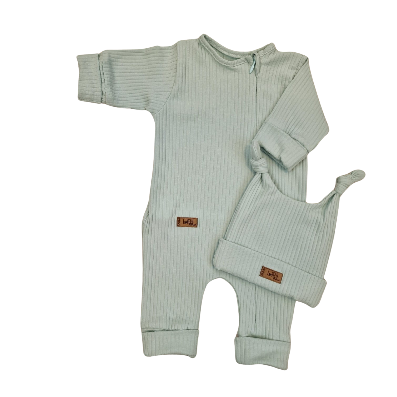 Uroczy 2 częściowy bawełniany, prążkowany komplet na lato - pajacyk niemowlęcy i czapeczka . Rampers rozsuwany jest na zamek do samego dołu i dodatkowo posiada ściągacze, dzięki czemu rośnie wraz z dzieckiem.