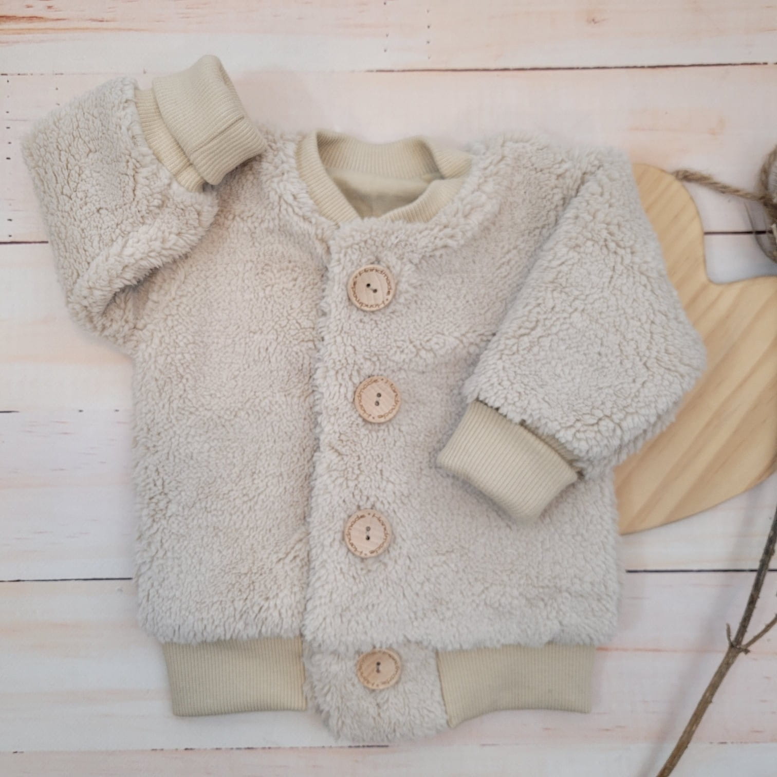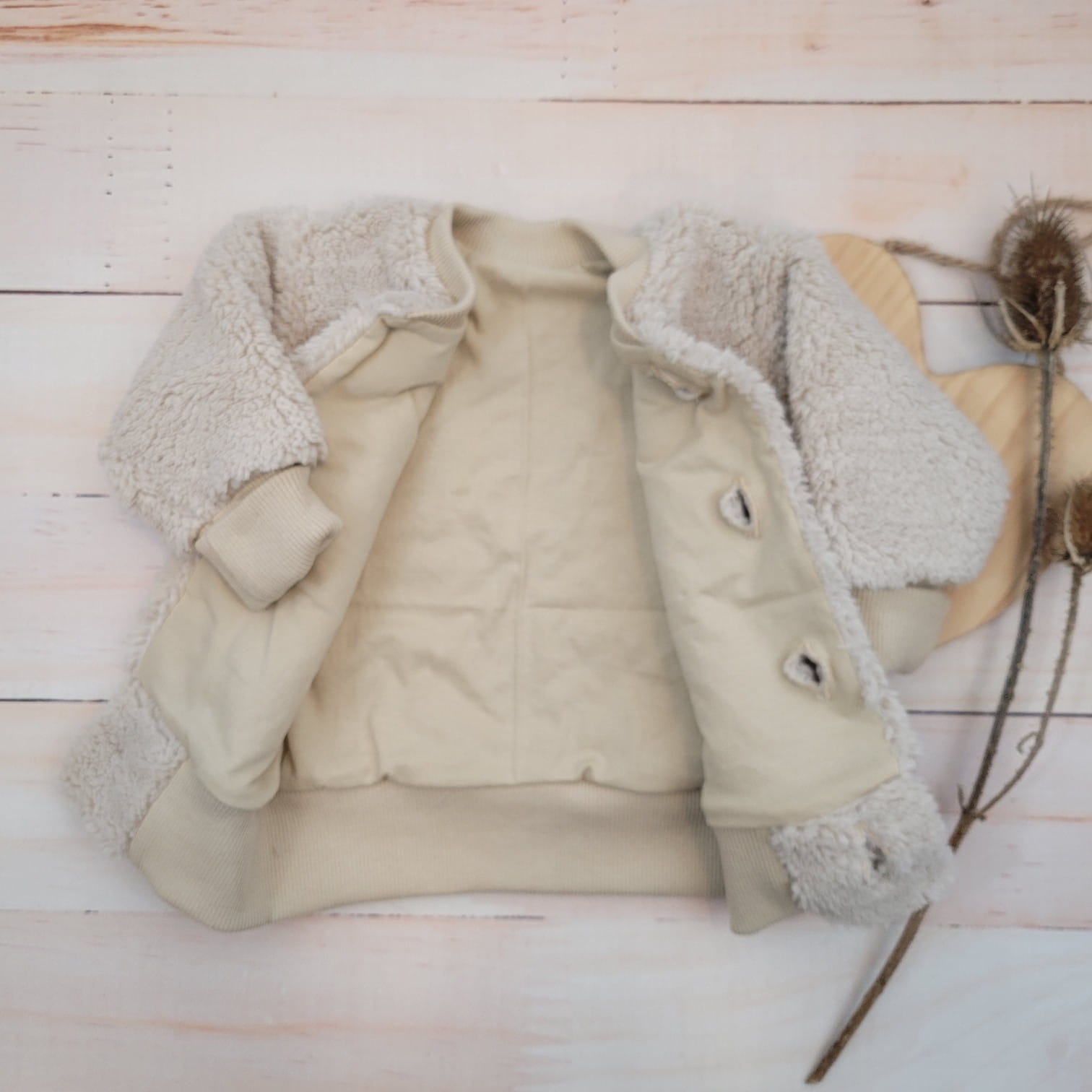 Kurteczka z zewnątrz wykonana jest z misiowego materiału, w środku ma bawełnianą podszewkę.