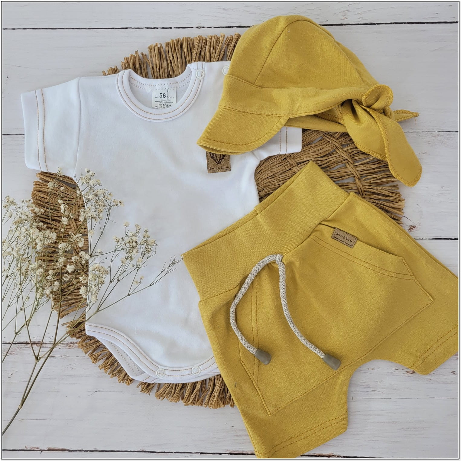2 cz bawełniany komplet na lato body+spodenki biało-musztardowy ostatnie sztuki 56-80