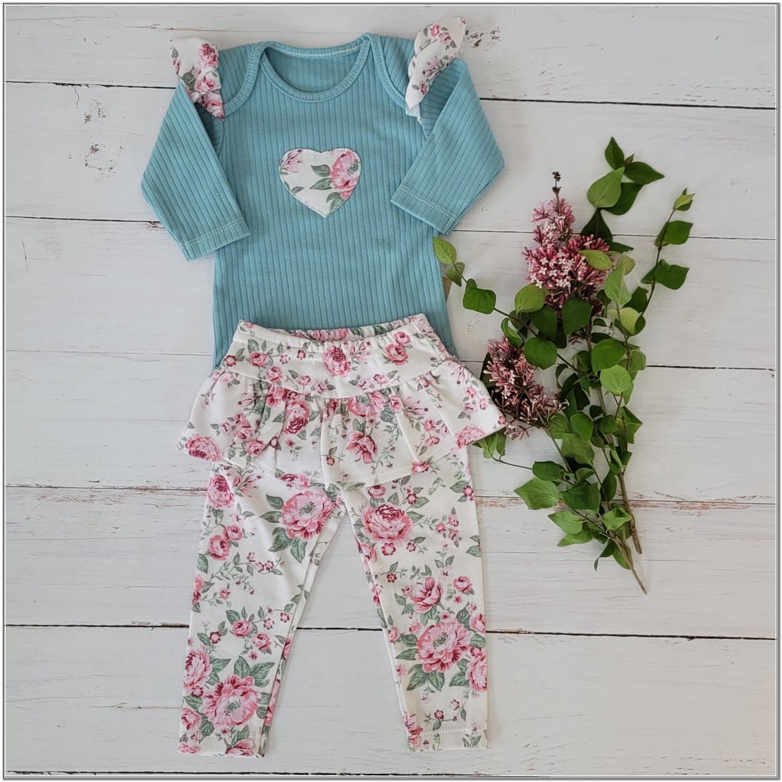 2 cz komplet body + legginsy ze spódniczką w kwiaty mięta 56-86