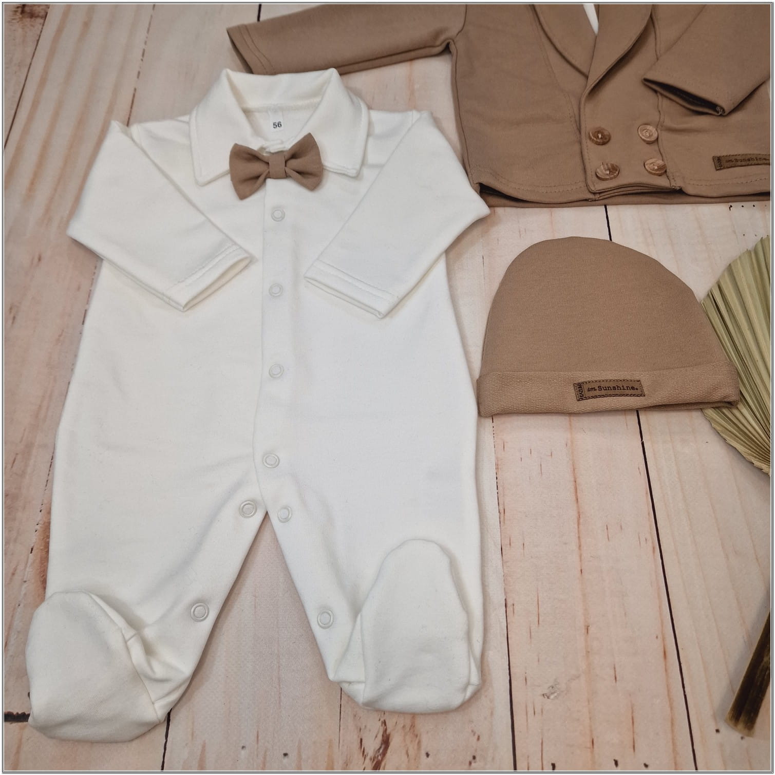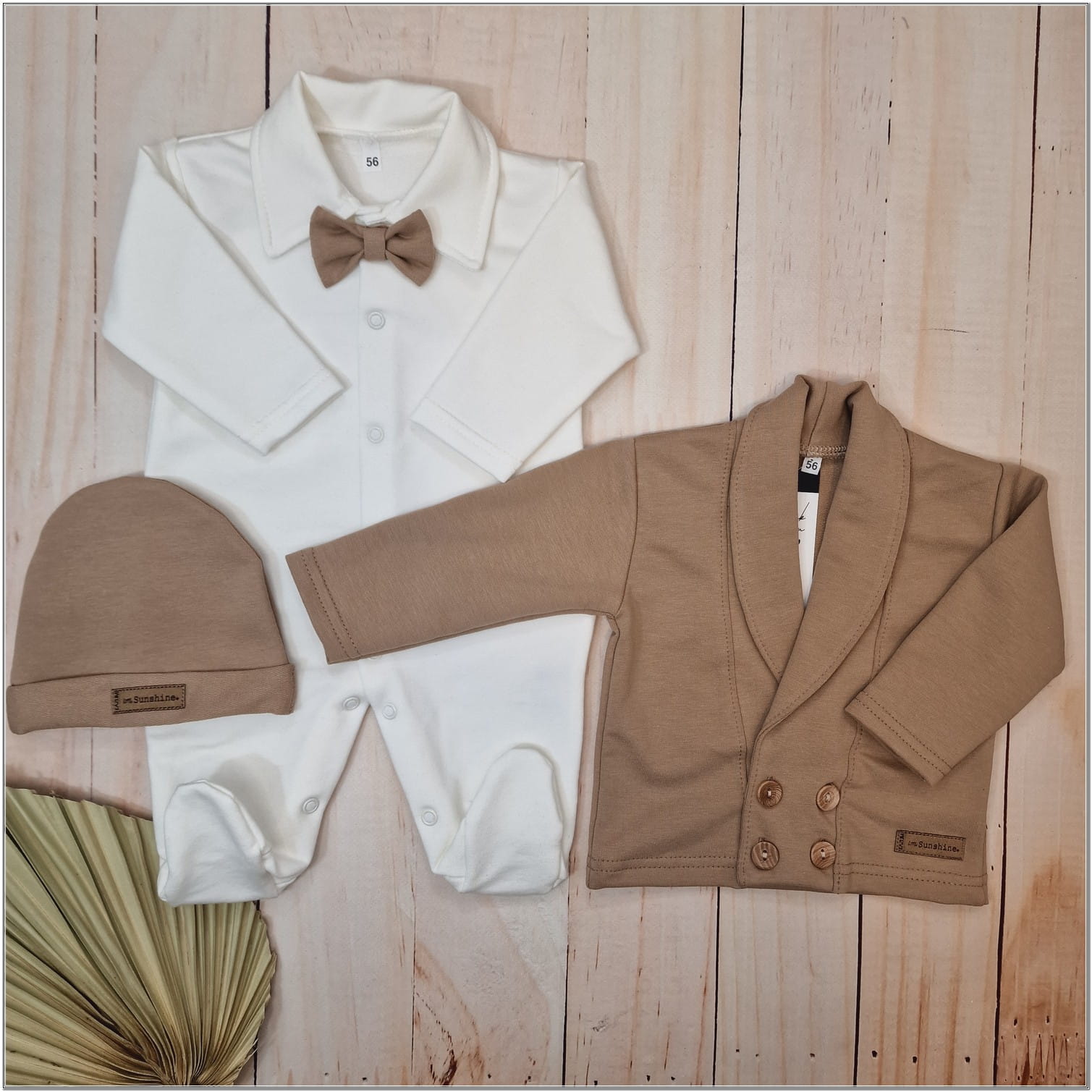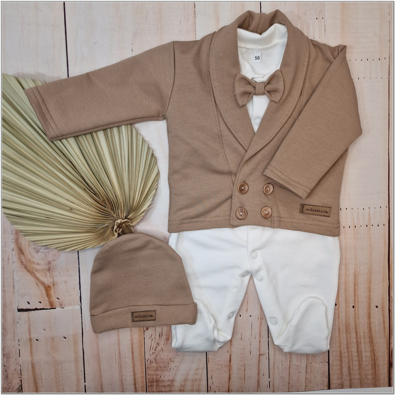 3 cz nowoczesny garniturek do chrztu, komplet z pajacykiem elegancki 50-68 caffe mokka