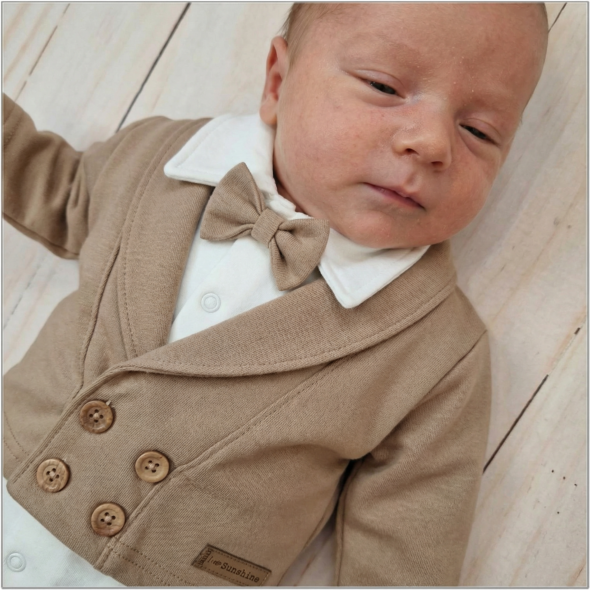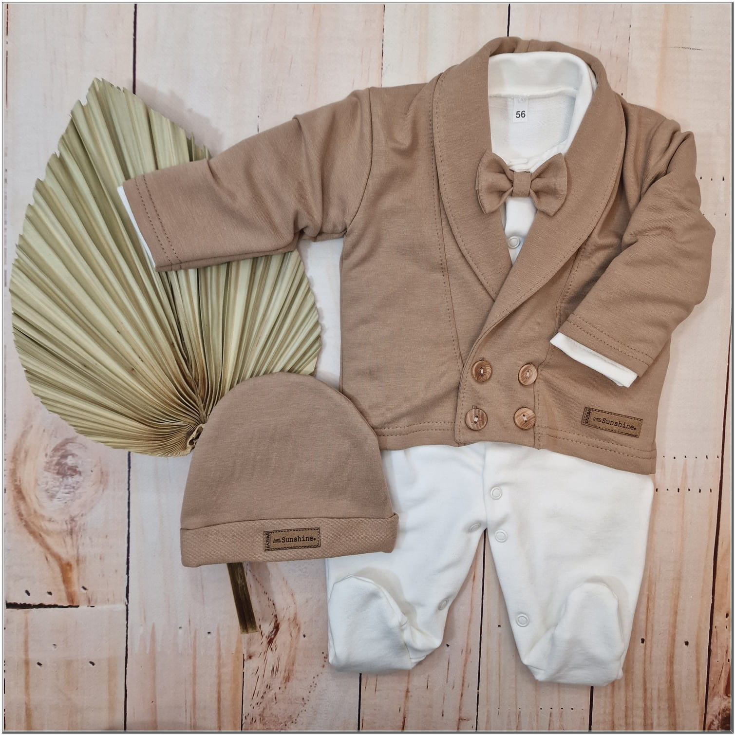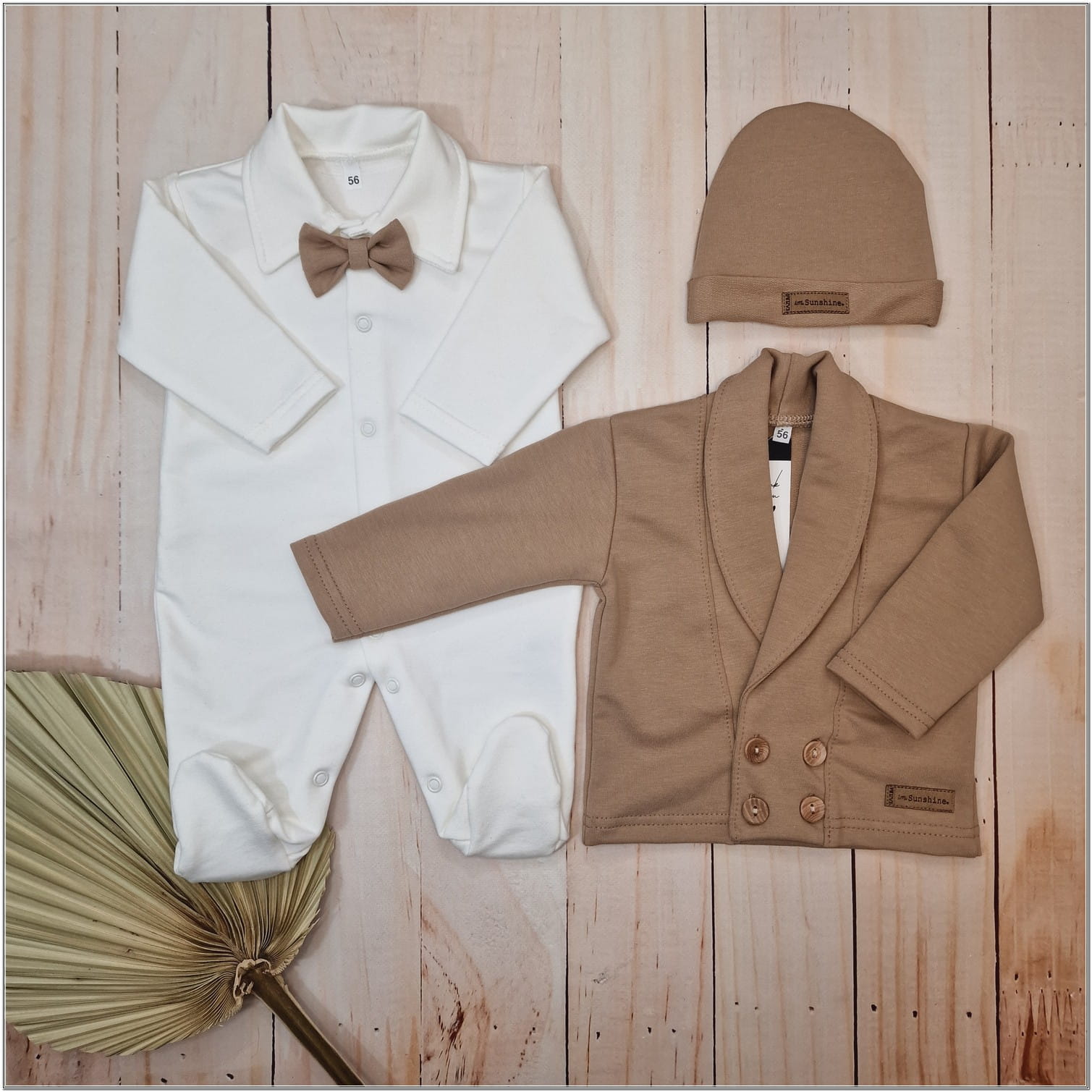 3 cz nowoczesny garniturek do chrztu, komplet z pajacykiem elegancki 50-68 caffe mokka