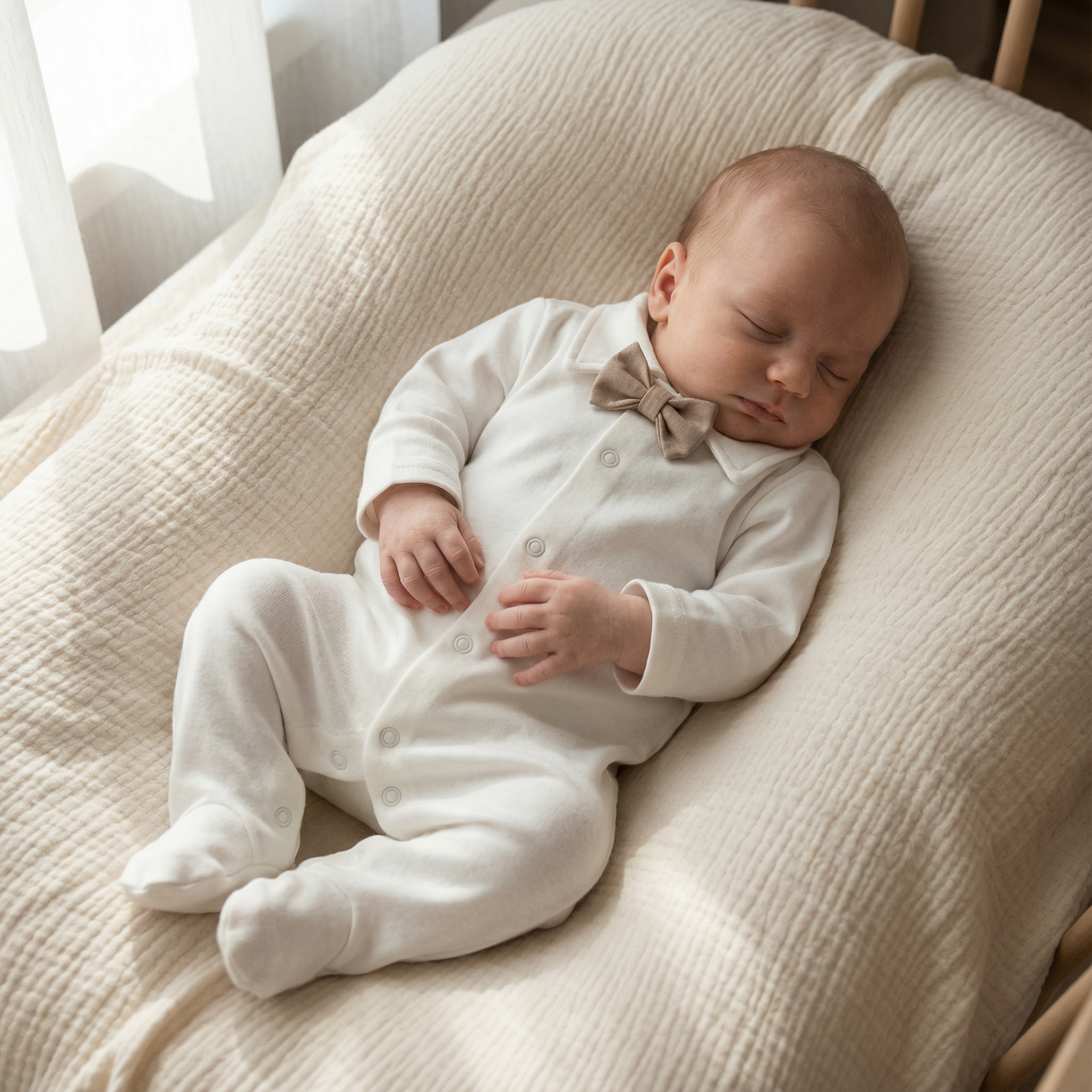 -bawełniany, wygodny, rozpinany na całej długości pajacyk z przyszytą muszką