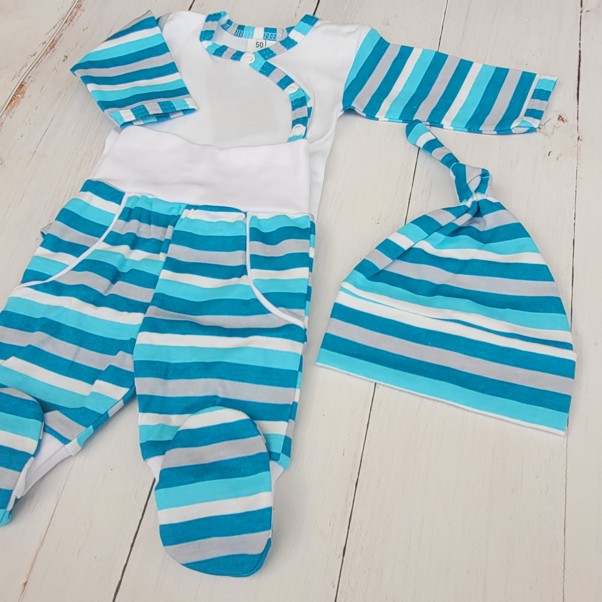Body rozpinane na całej długości gwarantują komfort i wygodę zakładania. Idealnie sprawdzą się w wyprawce do szpitala. Półśpiochy posiadają szeroki ściągacz w pasie, który ochroni delikatny pępuszek. Dopasowana do kompletu czapeczka może być wykorzystywana po kąpieli, czy też na spacer .