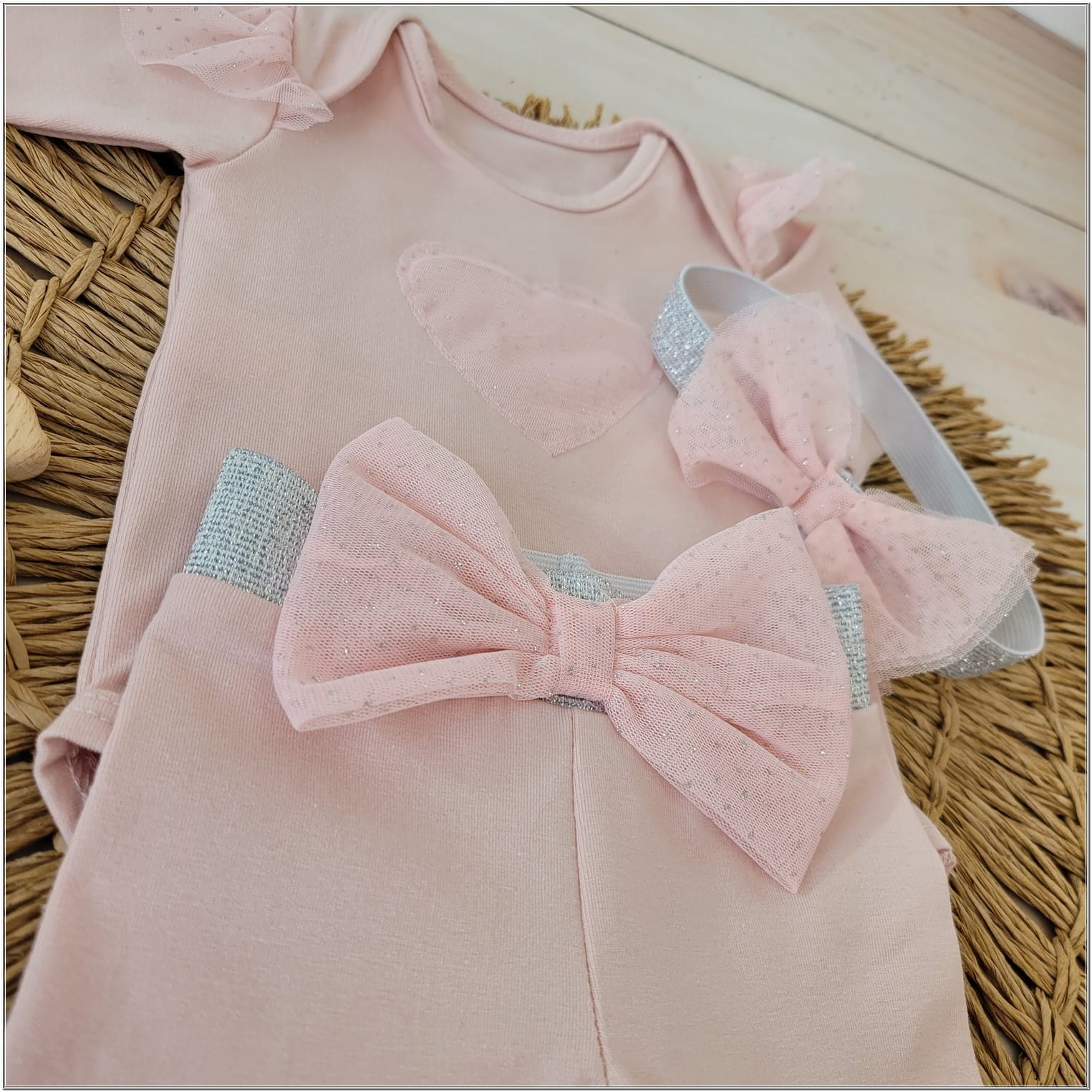 3cz komplet z tiulem Body+spodnie+opaska 56-86 różowy