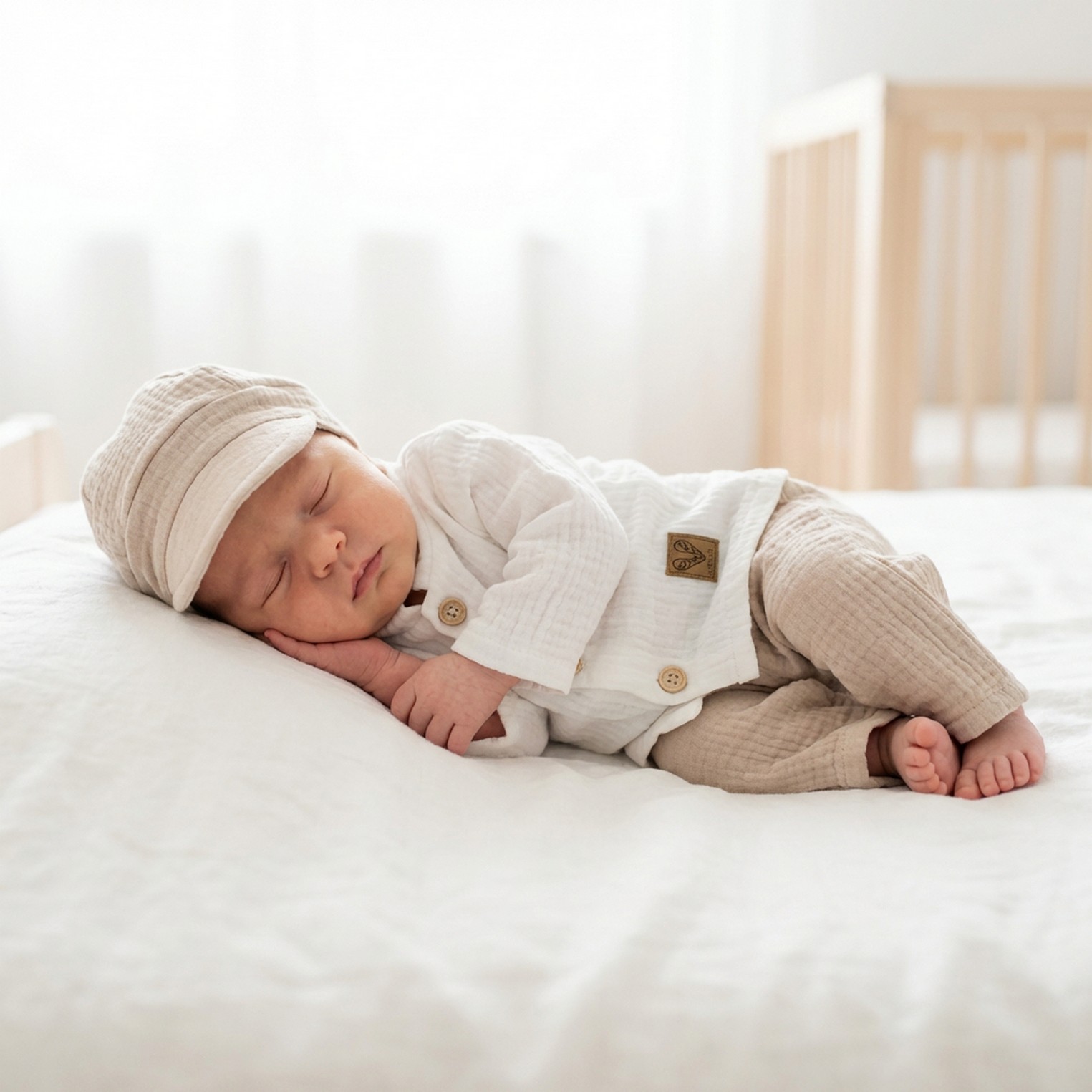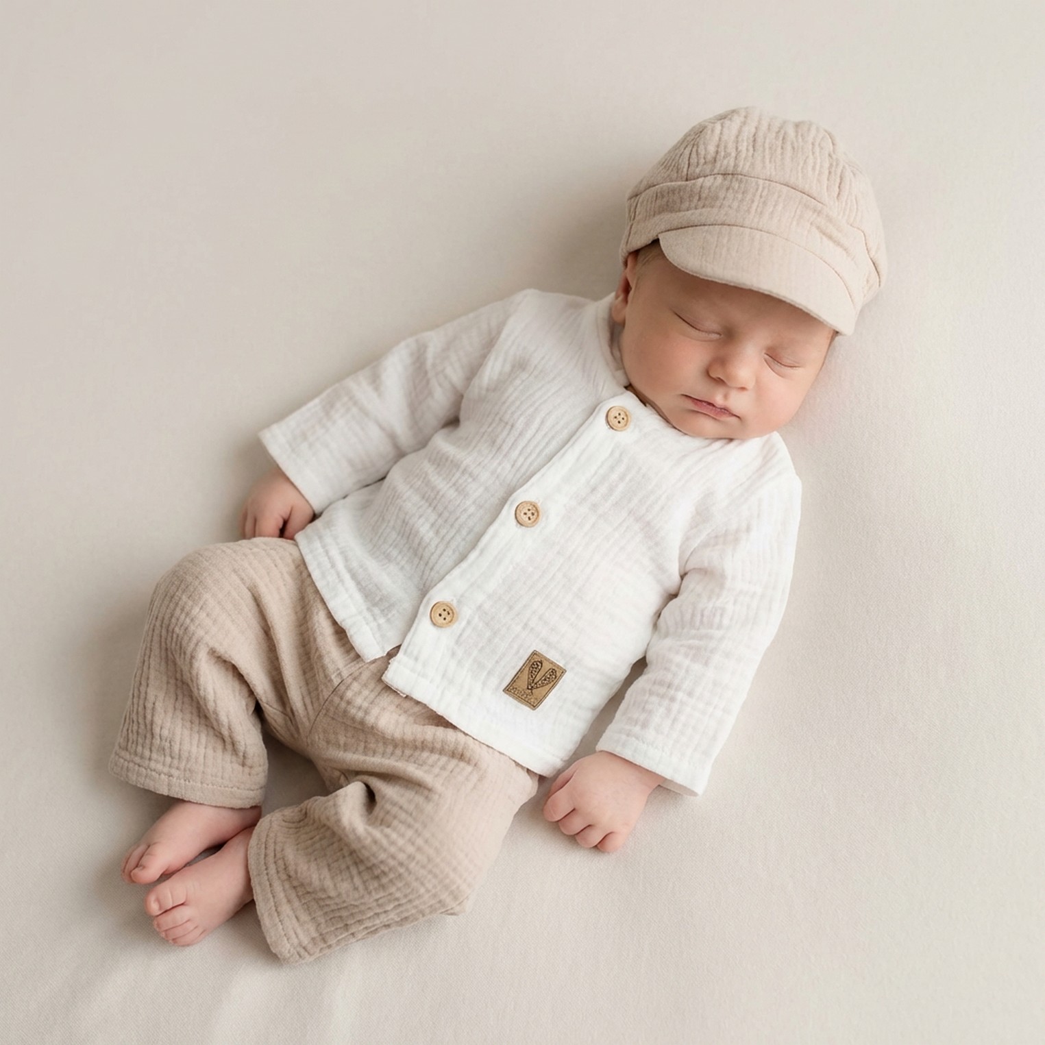 3cz muślinowy komplet elegancki z kaszkietem do chrztu 56-86 piaskowy