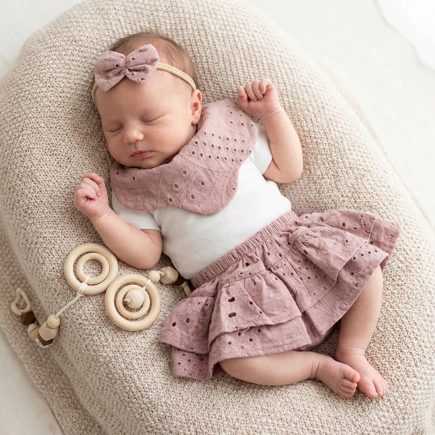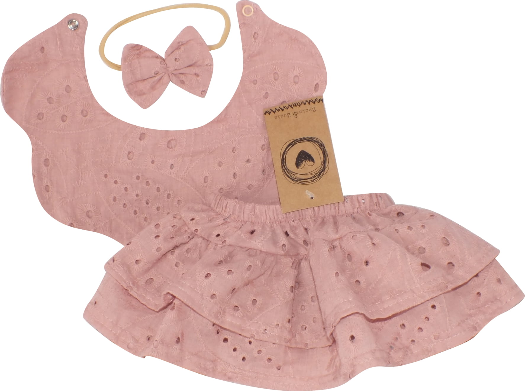 3cz zestaw komplet lato bloomersy + opaska + apaszka/kołnierzyk ażurowy 56-98 brudny róż