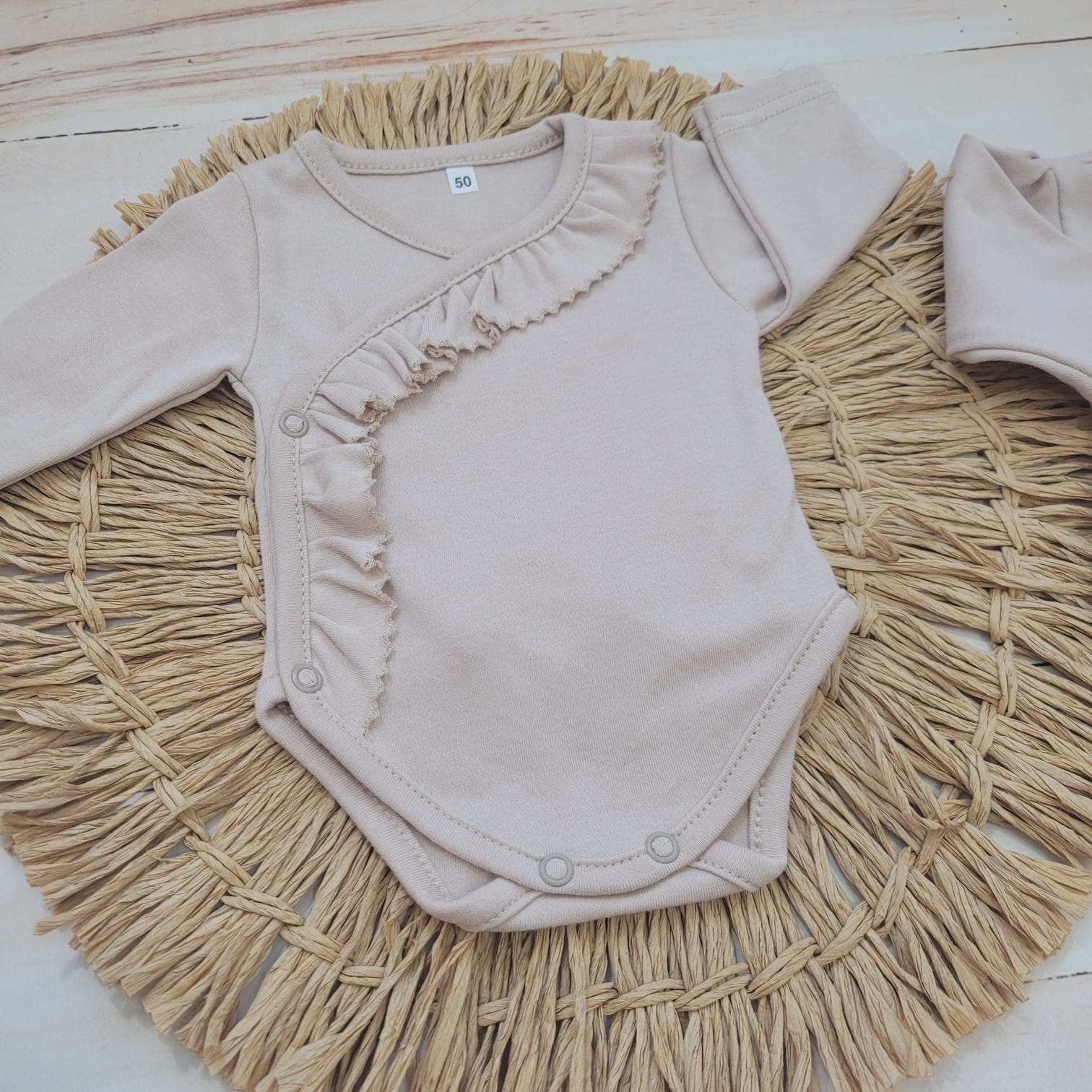 Zestaw zawiera body z długim rękawem, rozpinane na całej długości. Piękna falbanka przy zapięciu dodaje mu uroku i stylu.
