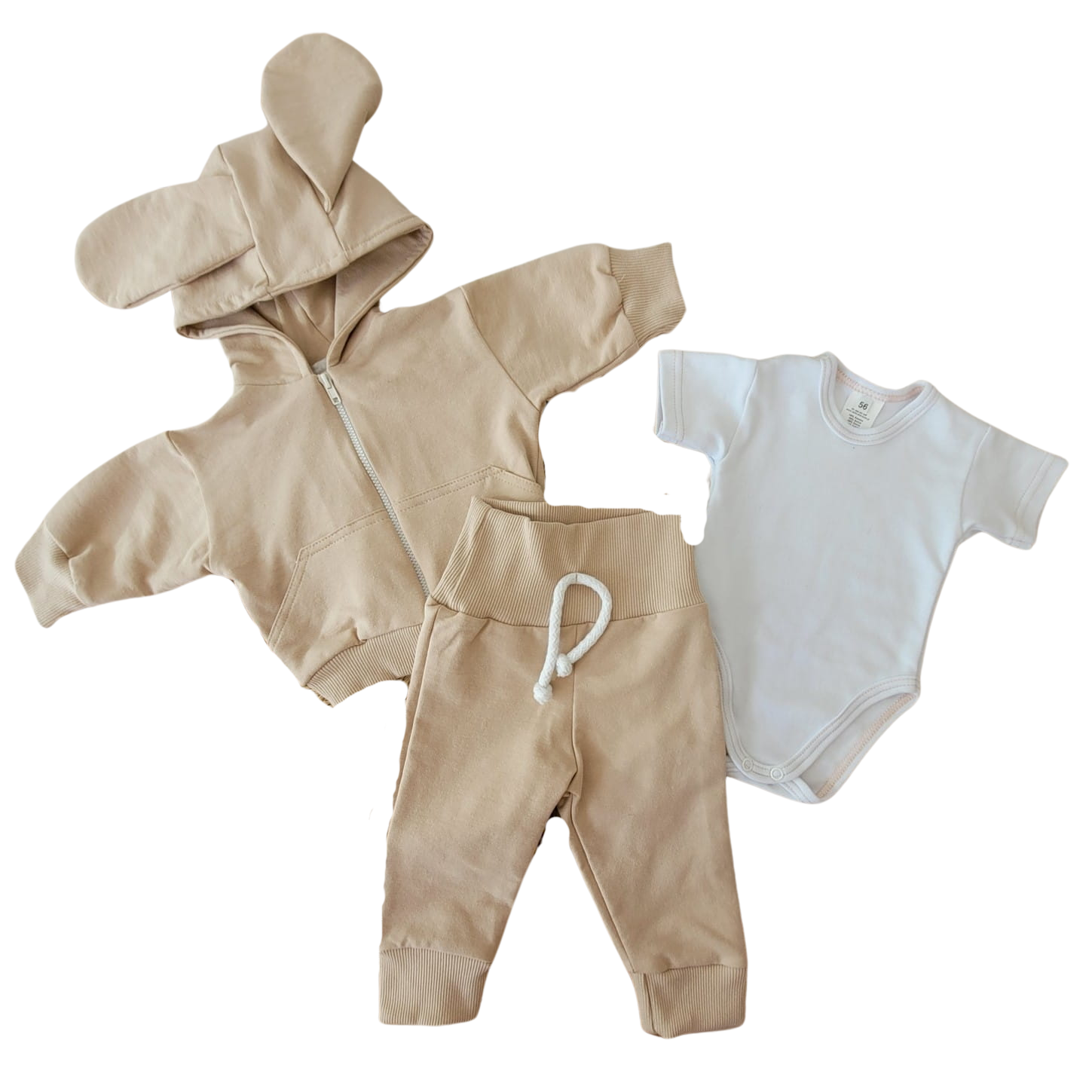 Bawełniany dresik dziecięcy 3 cz rozmiary 56- 86 beżowy z uszami