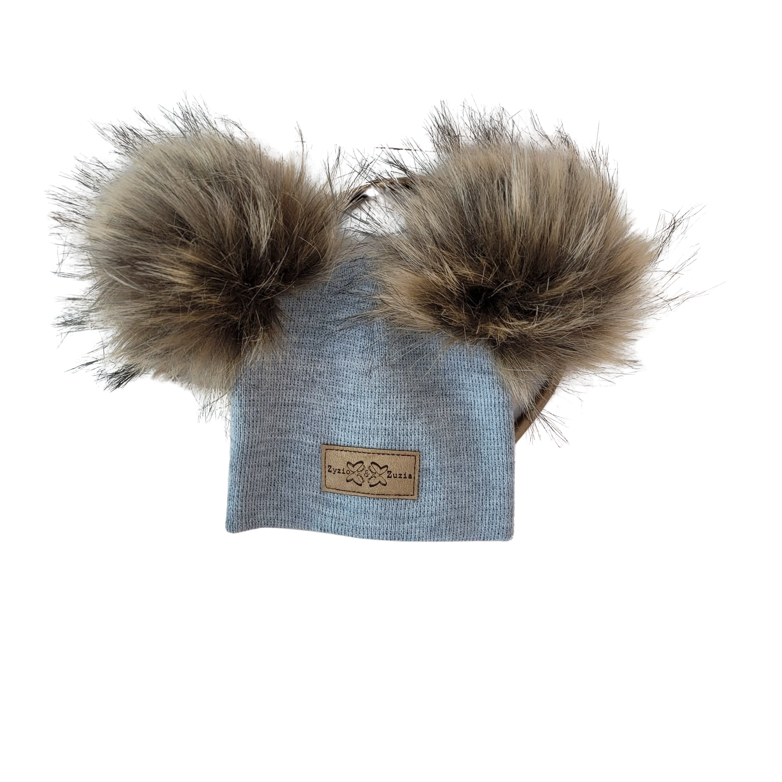 Piękna dziergana, włóczkowa, ciepła czapeczka jesienno-wiosenno-zimowa szara z 2 pomponami futerkowymi