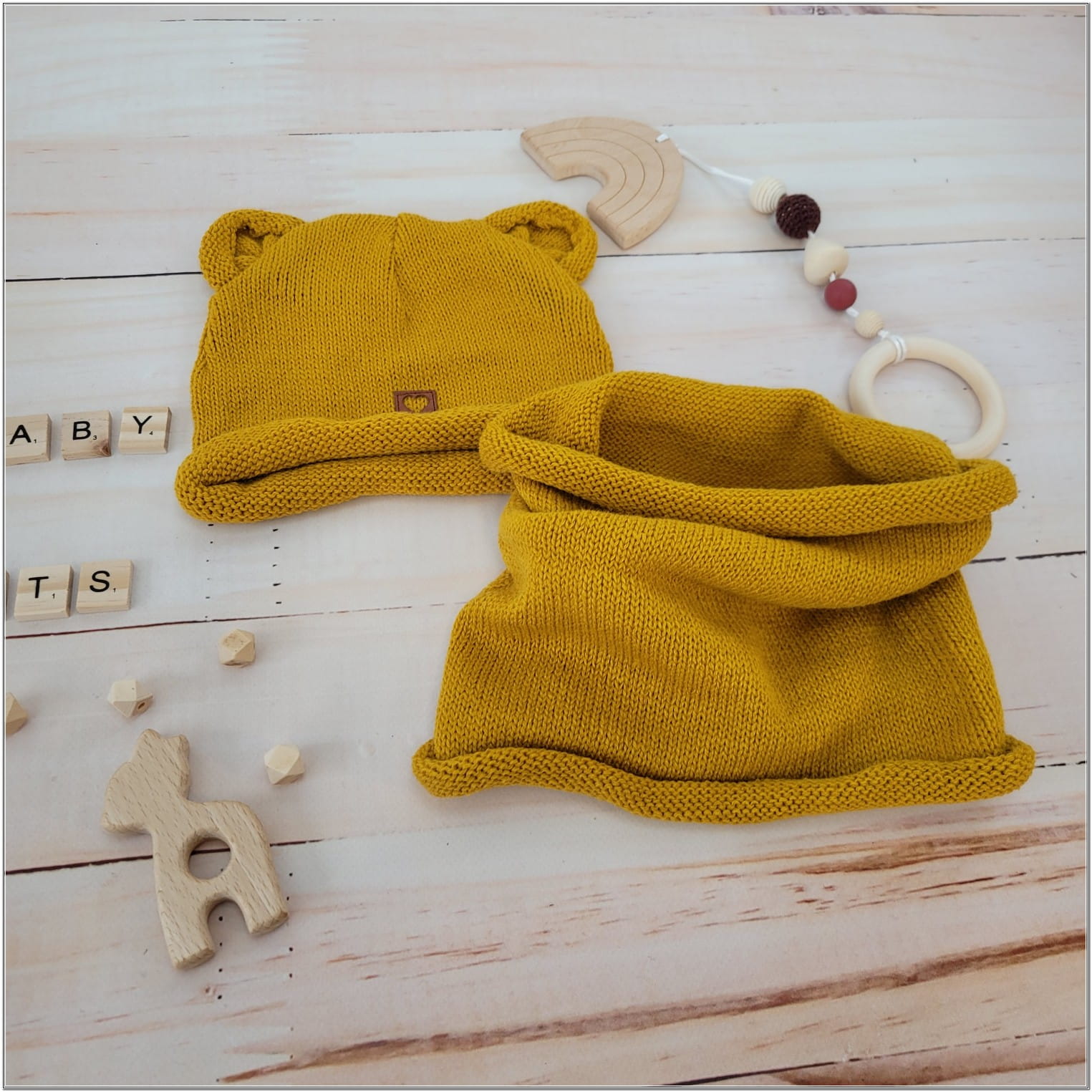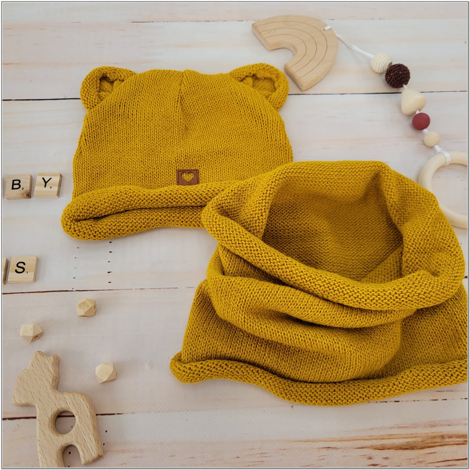 Czapka niemowlęca włóczkowa z uszkami + tuba musztardowa