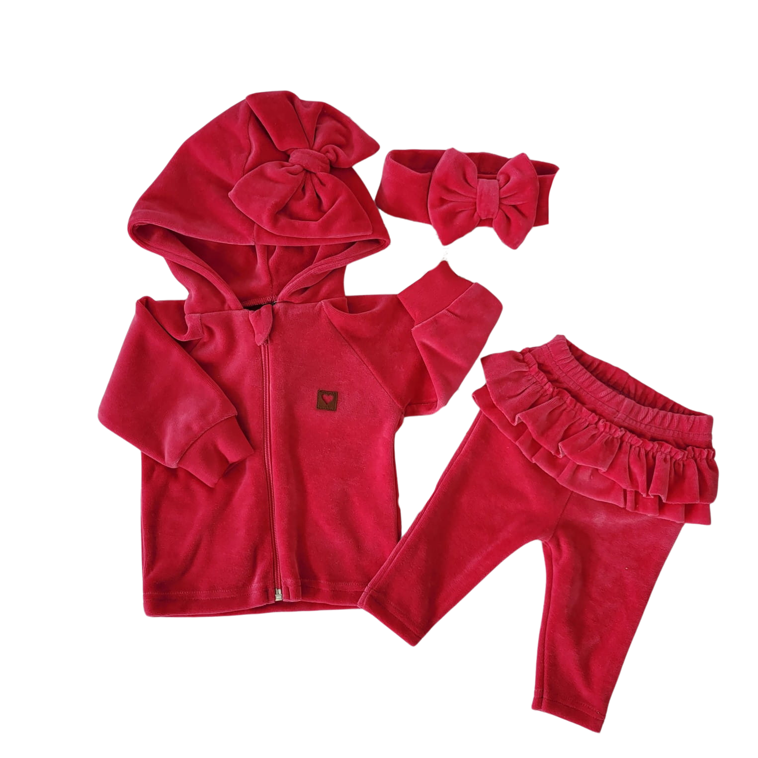 Welurowy niemowlęcy 3-częściowy dresik z falbankami i kokardą w rozmiarach 56,62,68,74,80,86