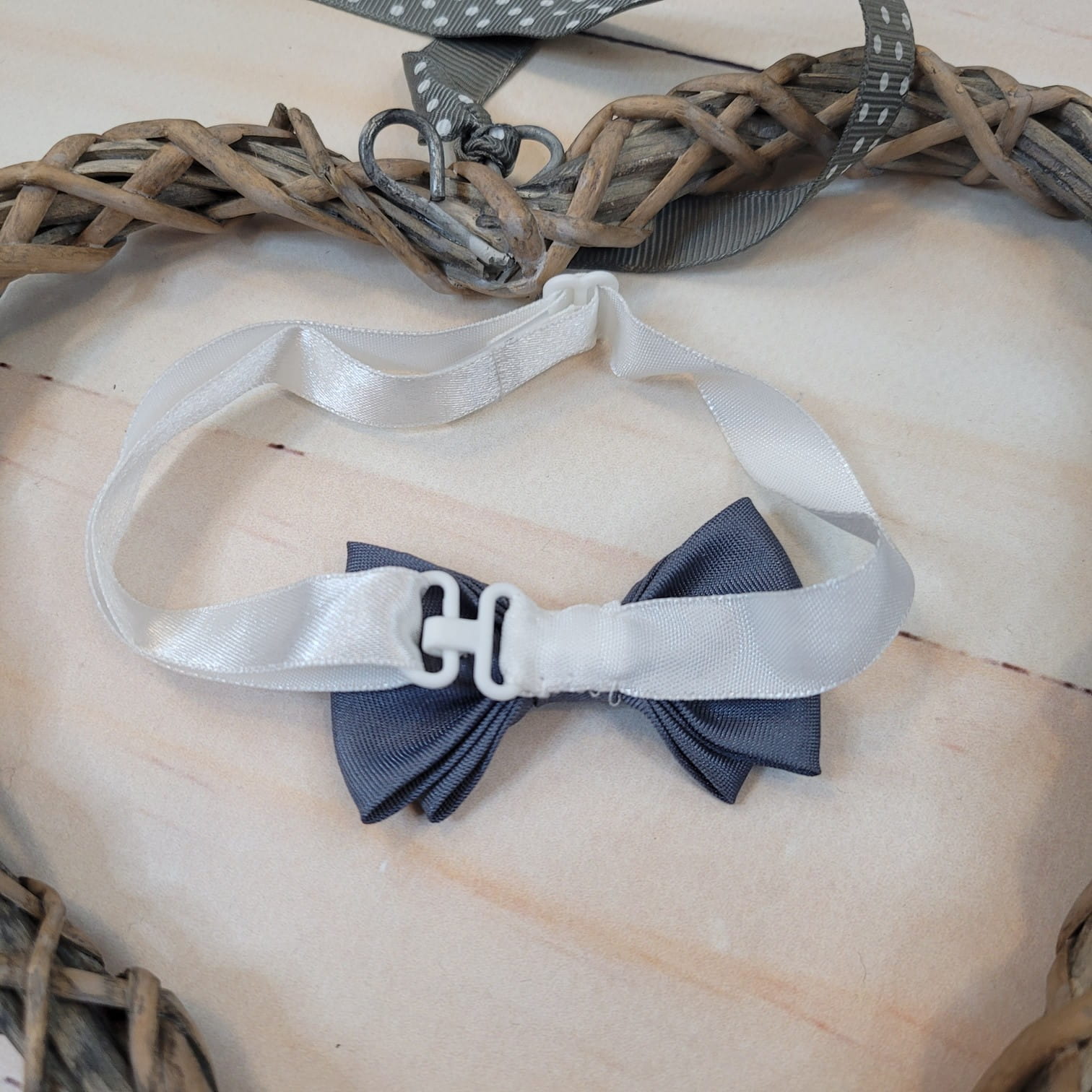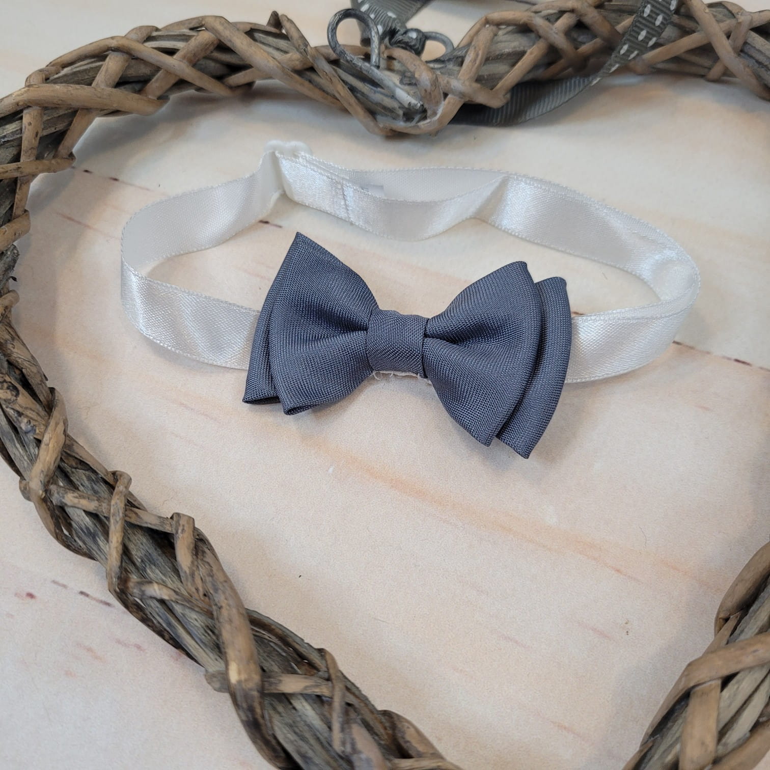 Elegancka muszka szara wykonana z pięknej tkaniny, wiązana na tasiemce