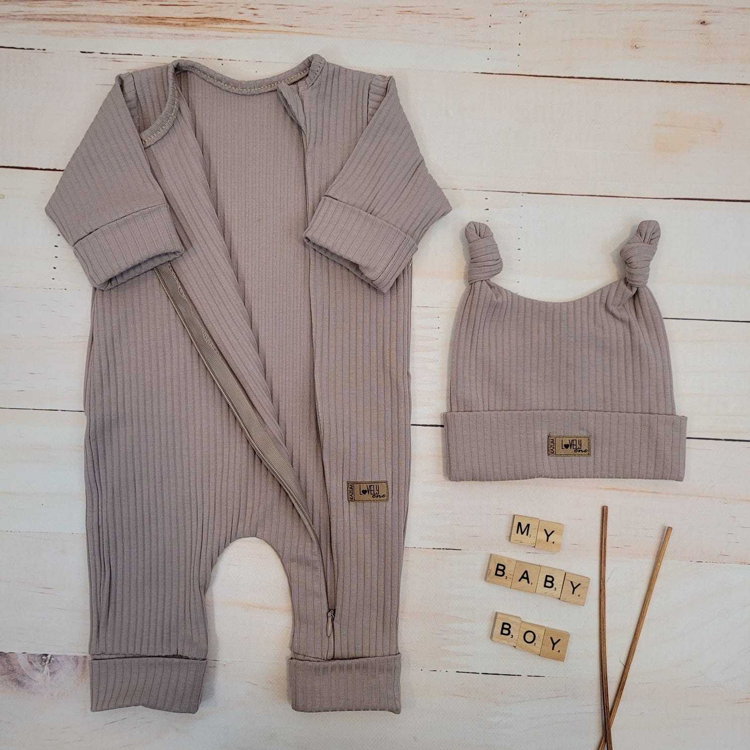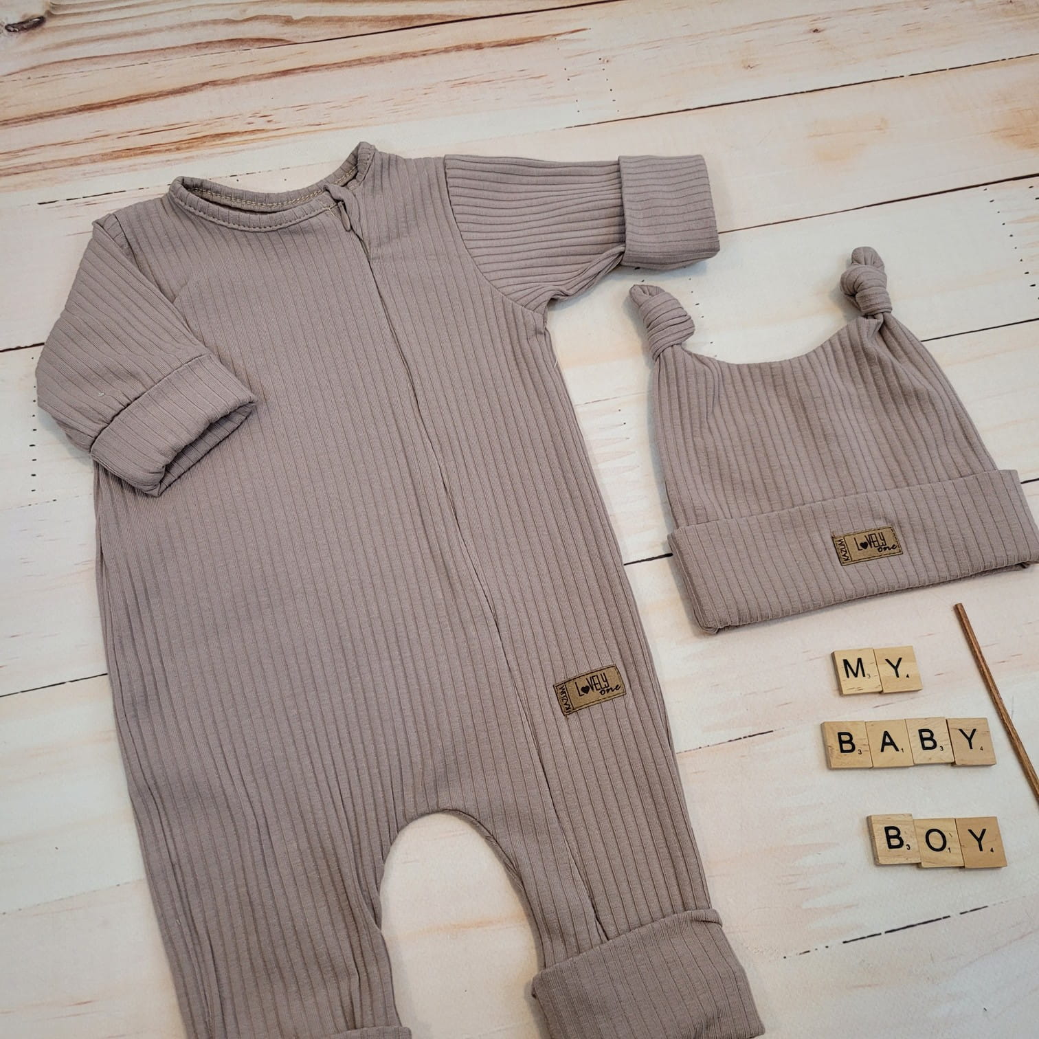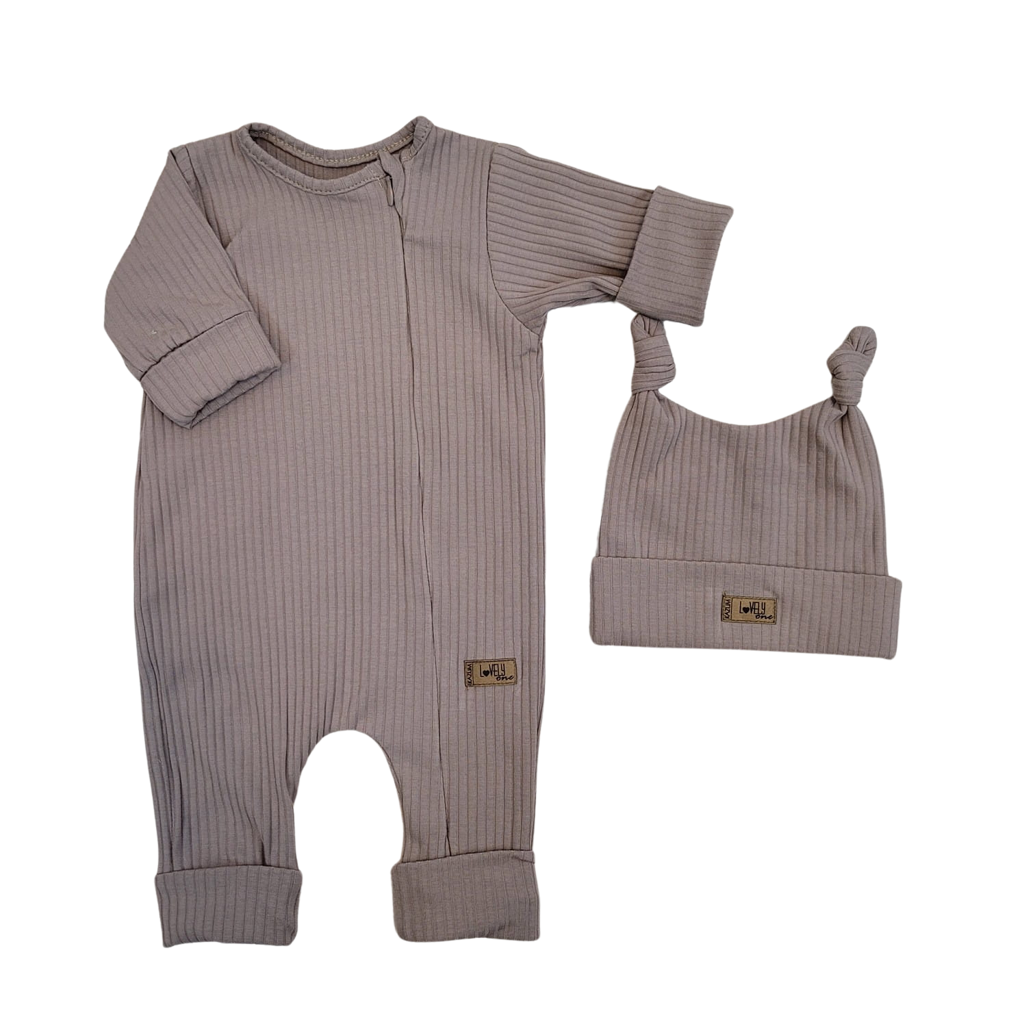 Uroczy 2 częściowy bawełniany, prążkowany komplet na lato - pajacyk niemowlęcy i czapeczka . Rampers rozsuwany jest na zamek do samego dołu i dodatkowo posiada ściągacze, dzięki czemu rośnie wraz z dzieckiem.