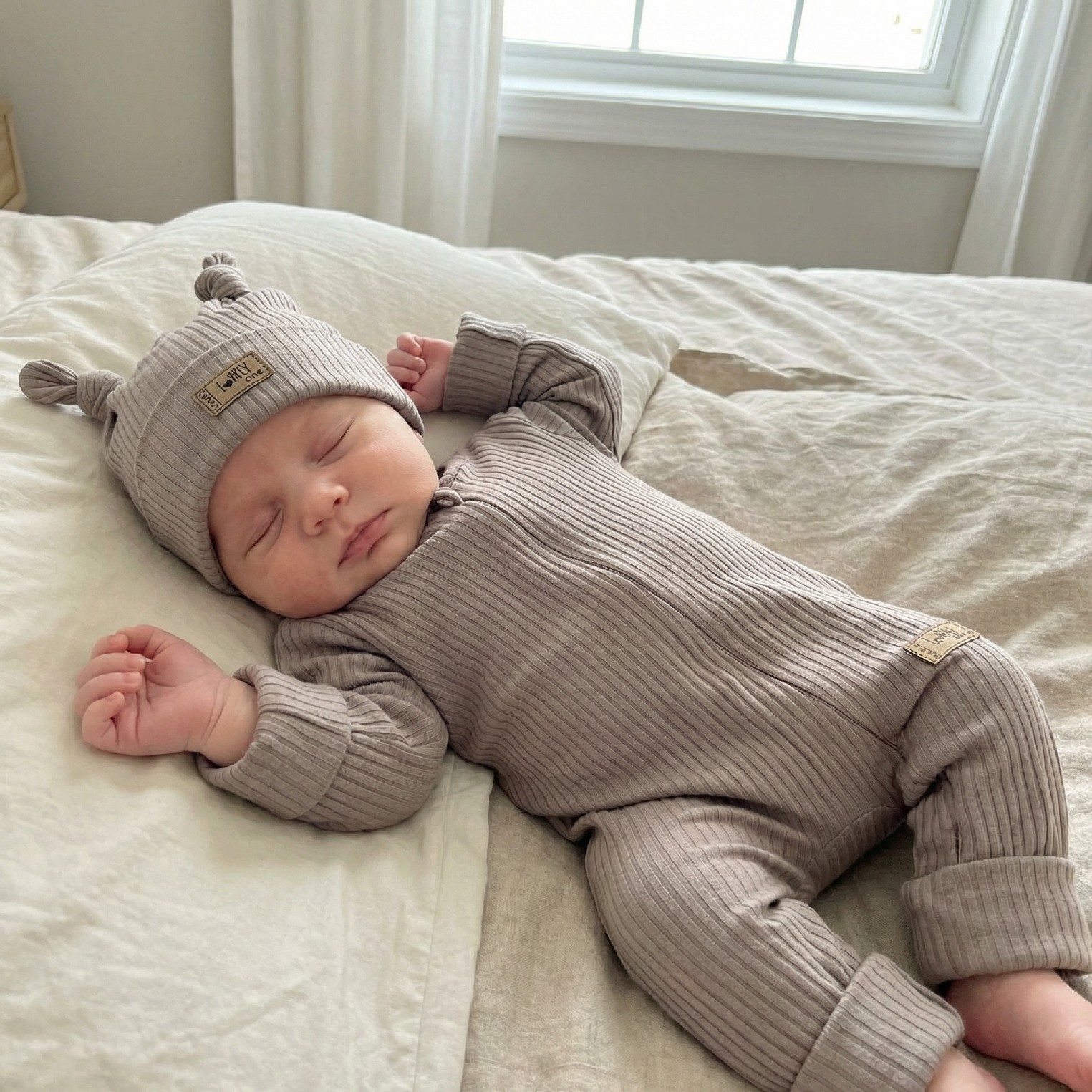Zarówno czapeczka jak i pajacyk są elastyczne i wygodne dla dziecka.