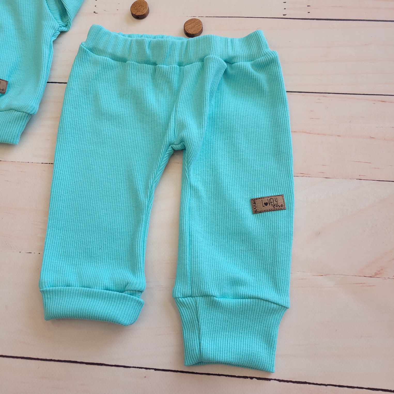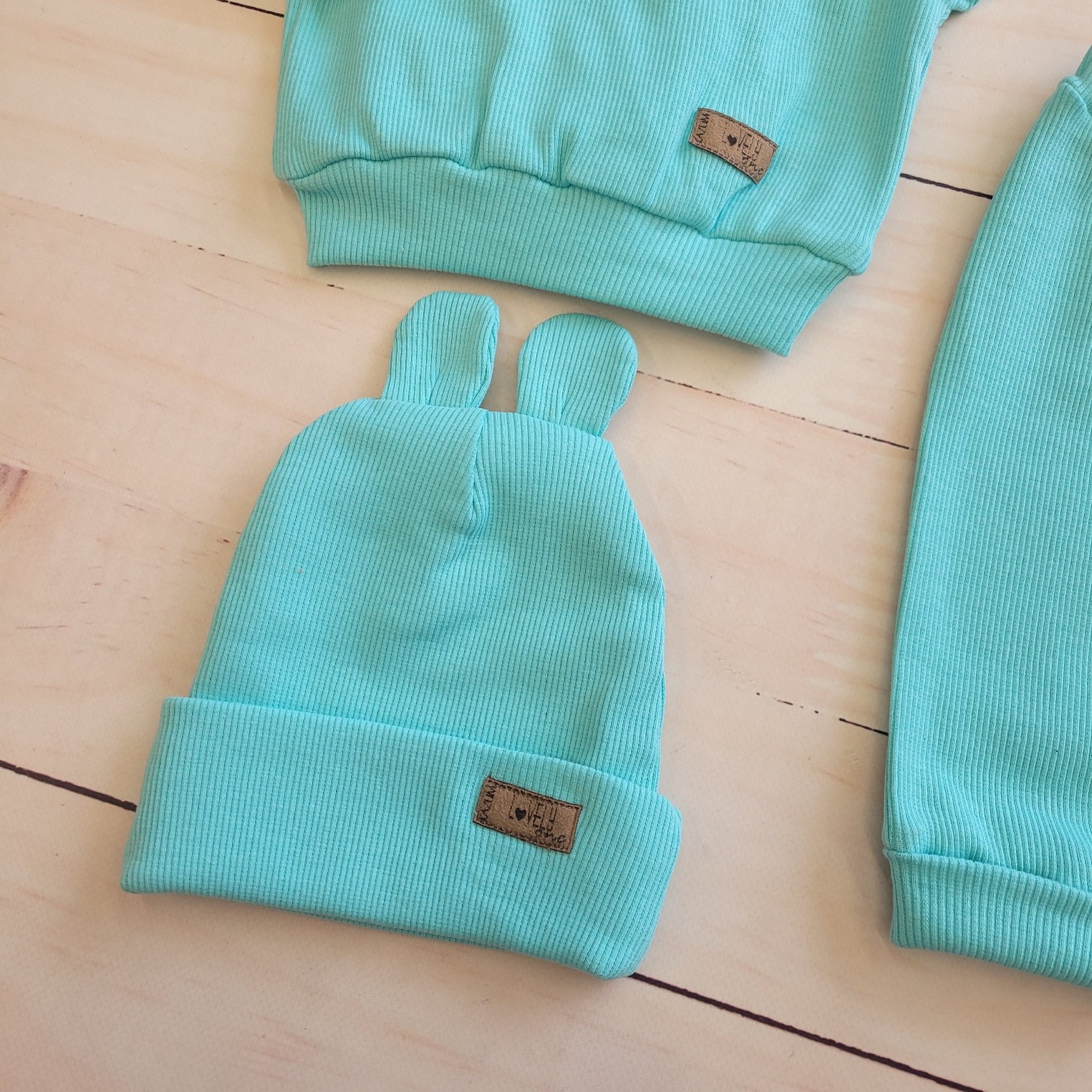 Unikalny prążkowany komplet niemowlęcy, dziecięcy bluza rozpinana przy szyi + spodnie + czapeczka w kolorze minty green