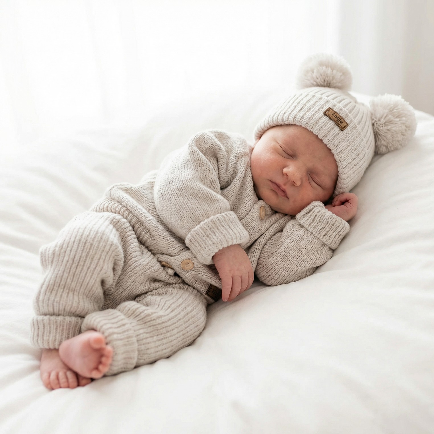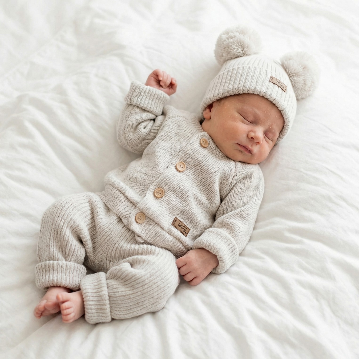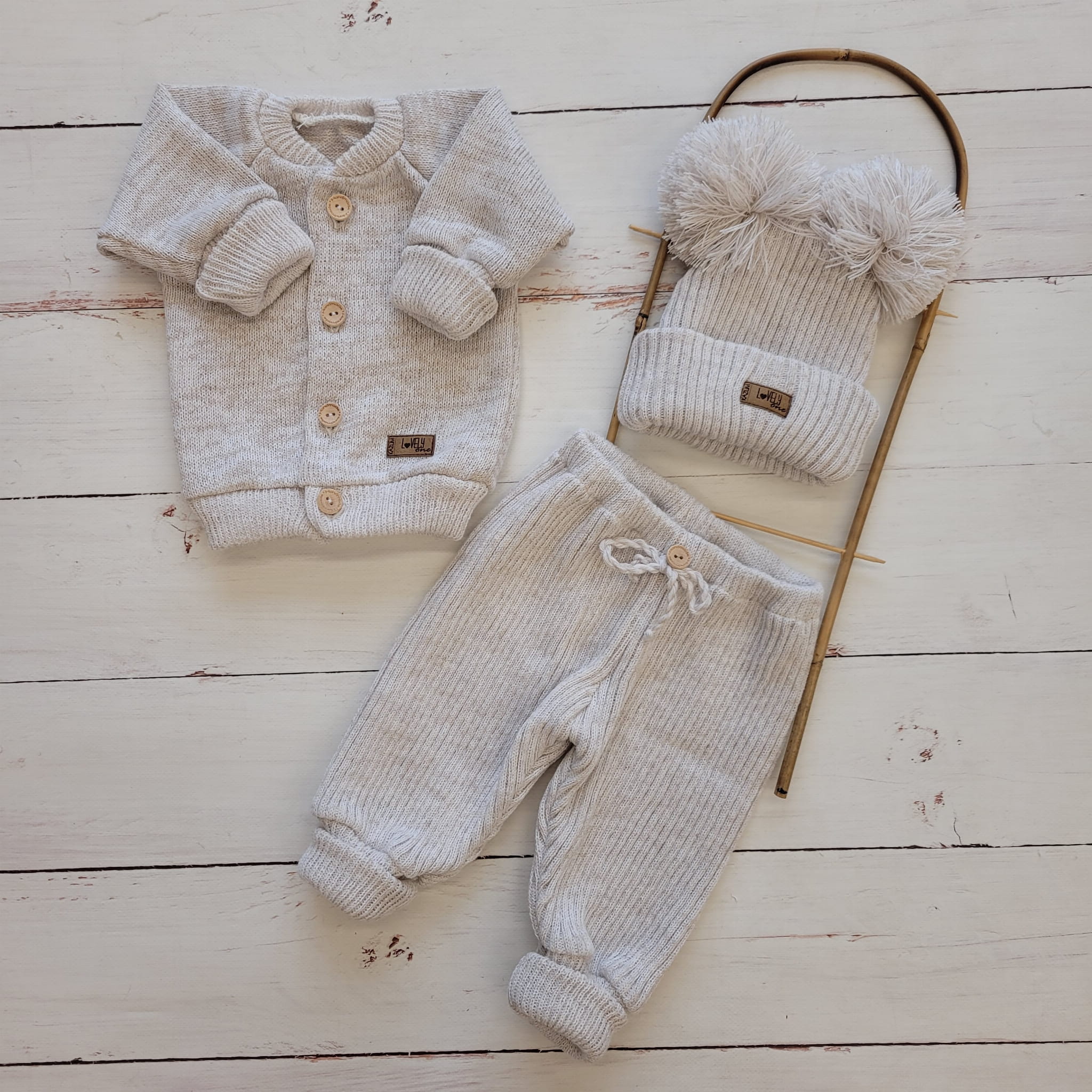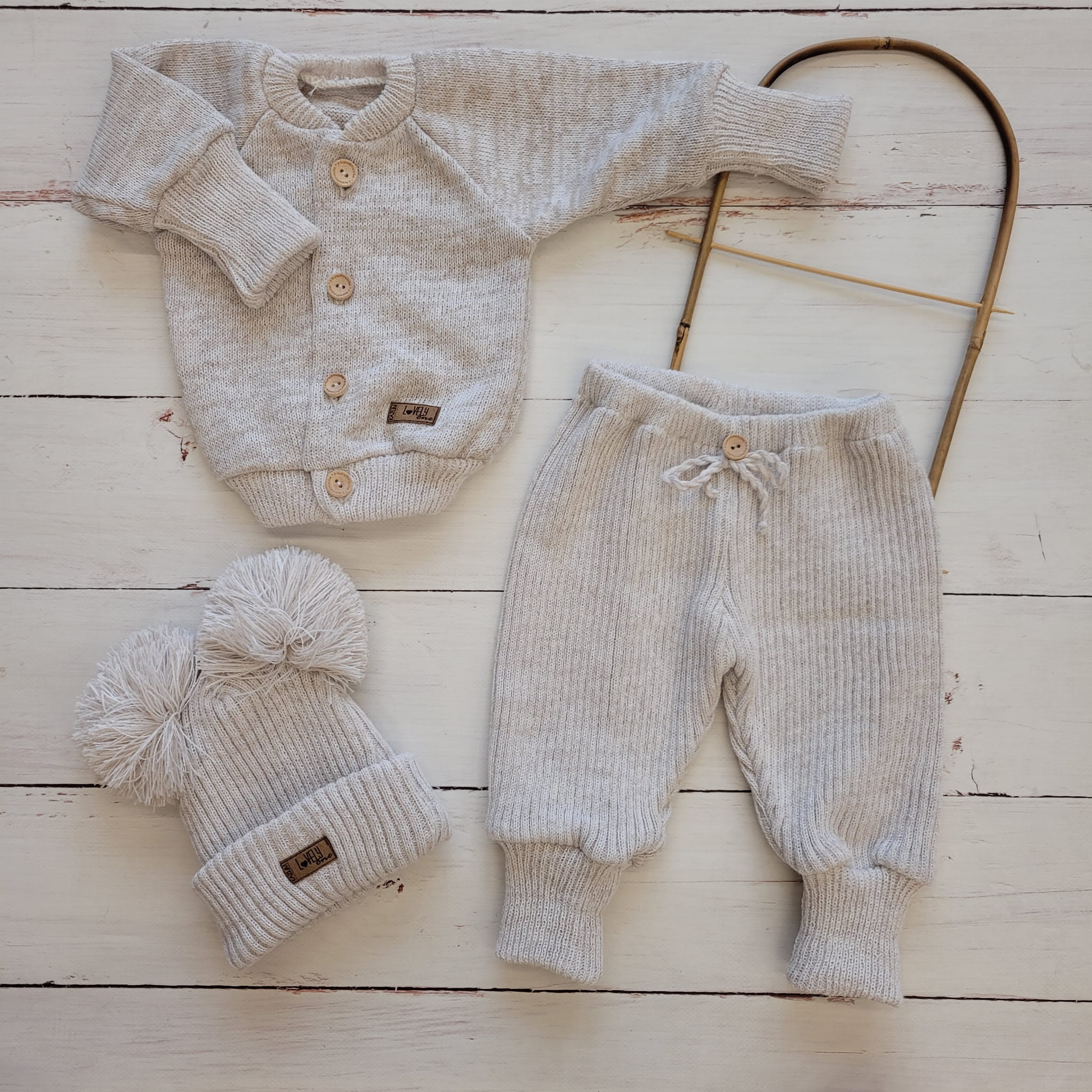 Przepiękny, modny 3 częściowy włóczkowy komplecik, rosnący wraz z dzieckiem.