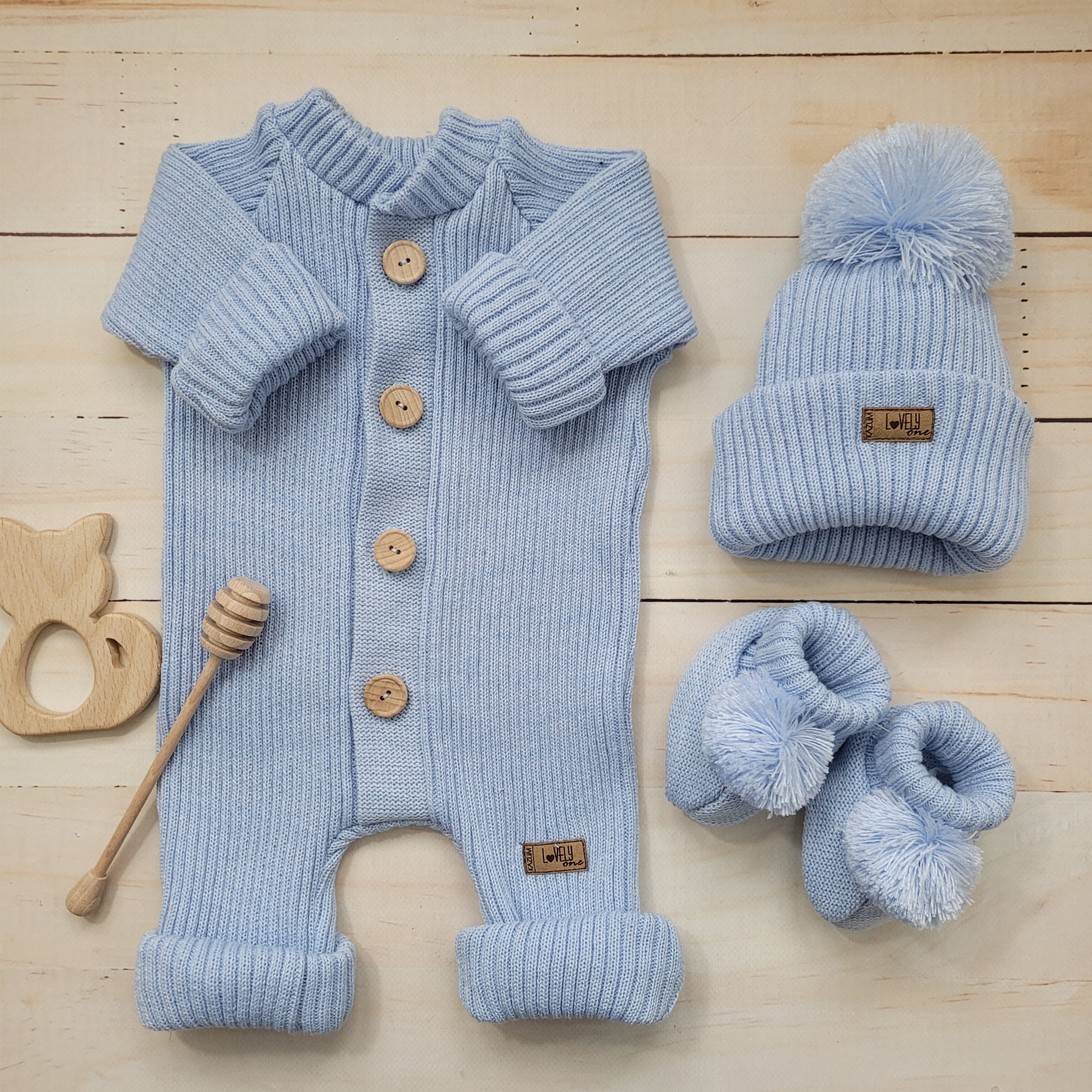KAZUM 3 cz komplet włóczkowy pajacyk+czapka+buciki 56-86 baby blue