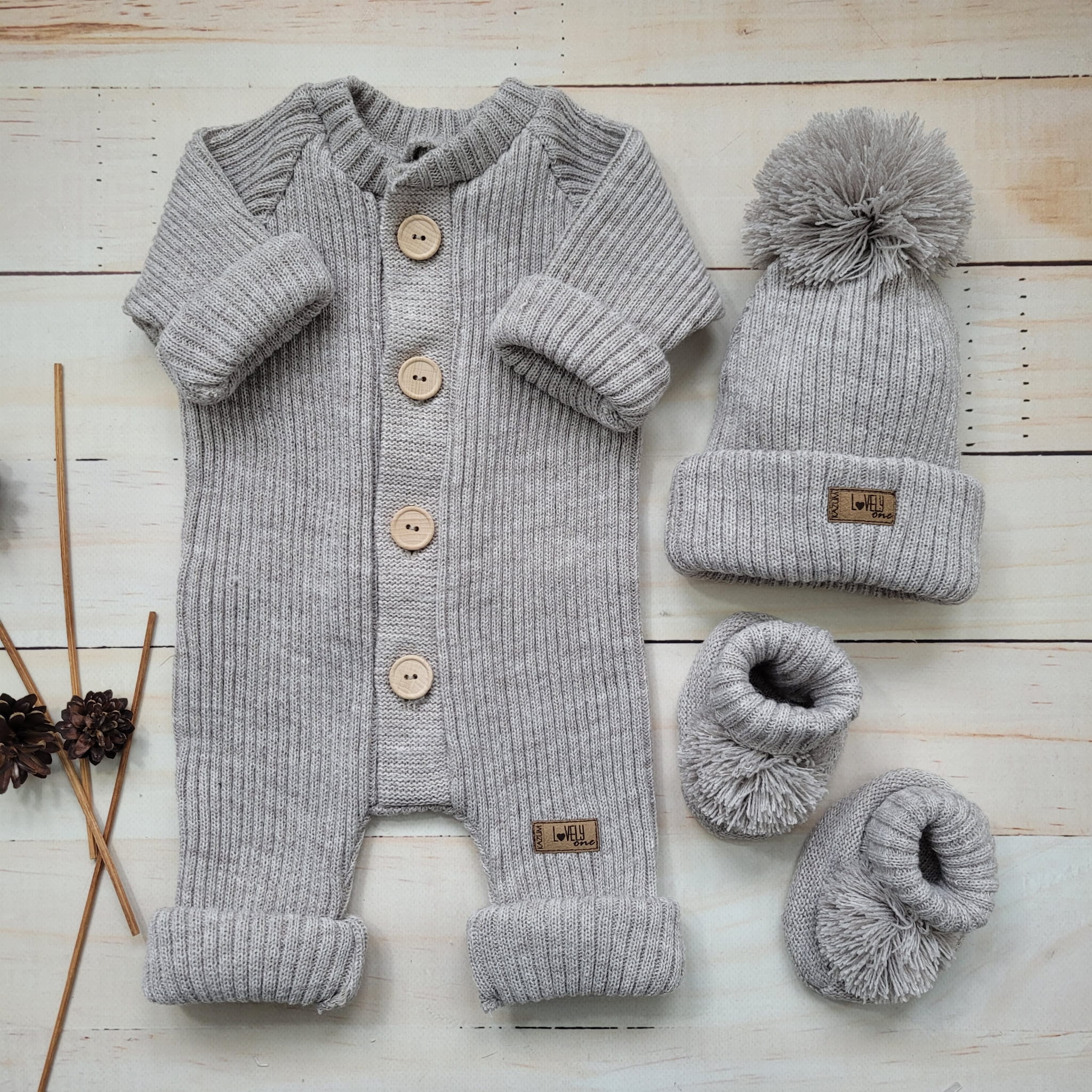 KAZUM 3 cz komplet włóczkowy pajacyk+czapka+buciki 56-86 hazelnut