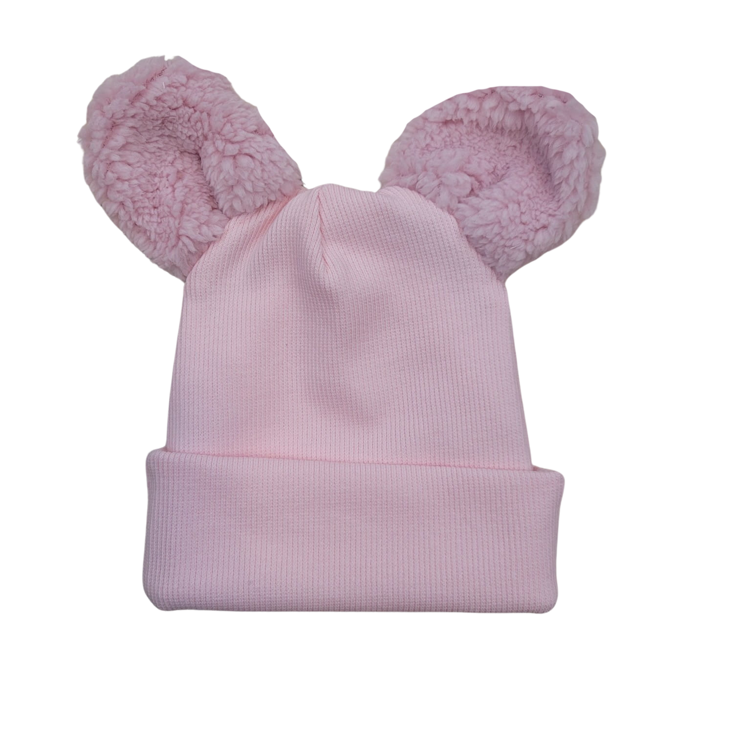 KAZUM Czapka podwójna niemowlęca prążkowana z misiowymi uszkami rozmiar 56-86 pinky rose