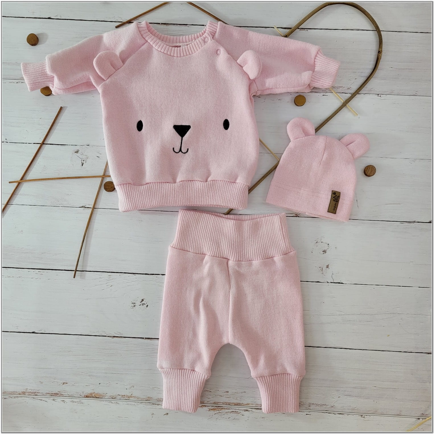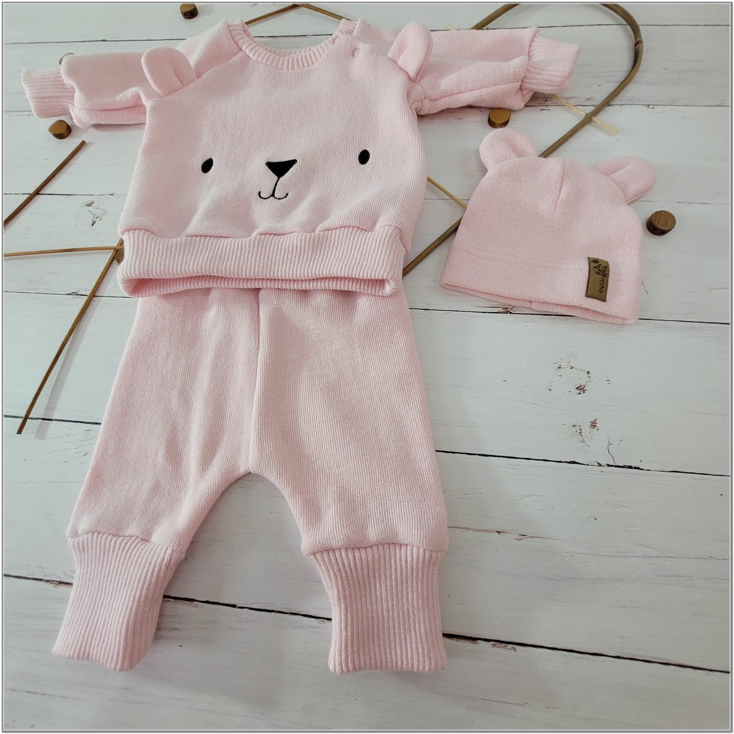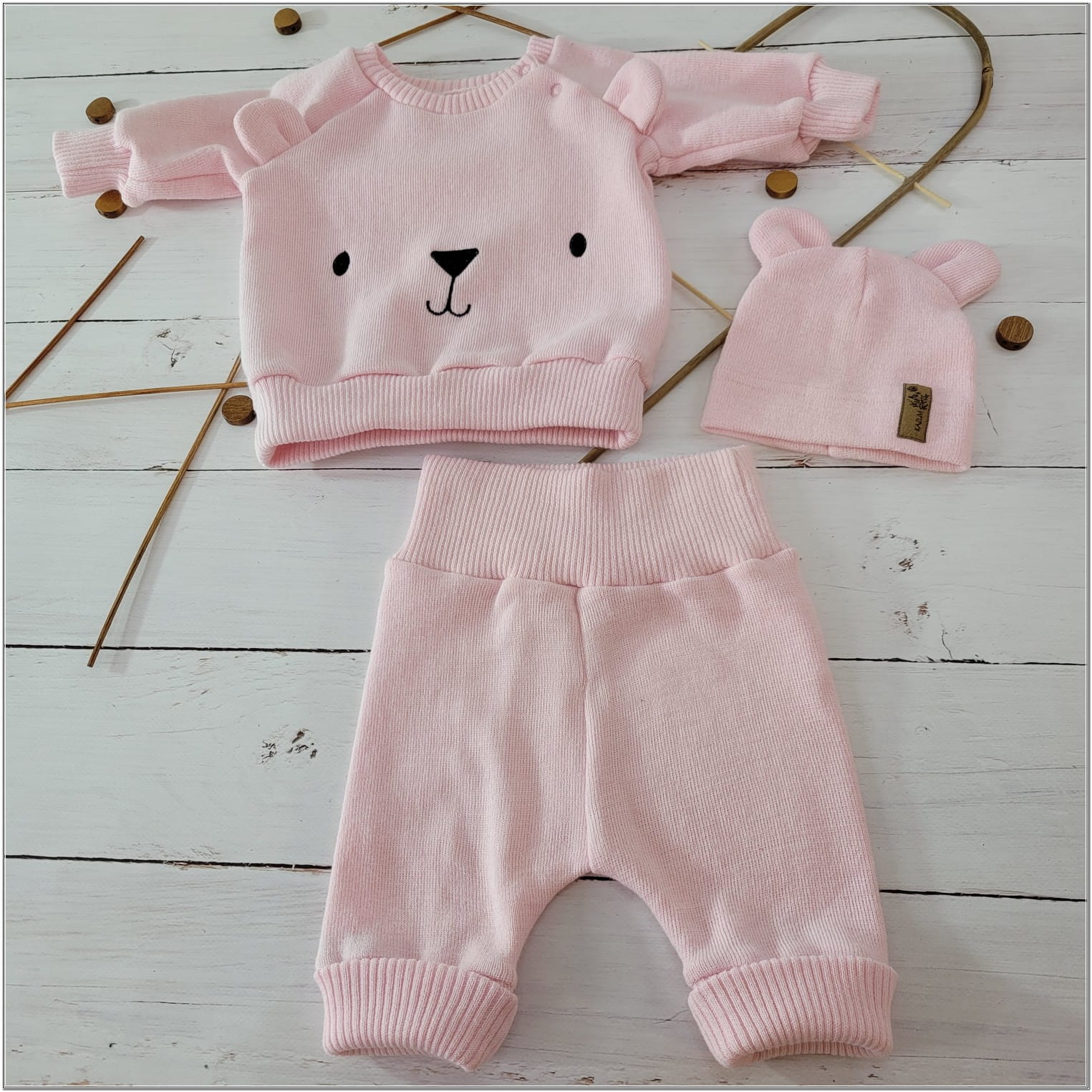 KAZUM Dres bluza oversize + spodnie + czapka z włóczki 56-86 baby rose