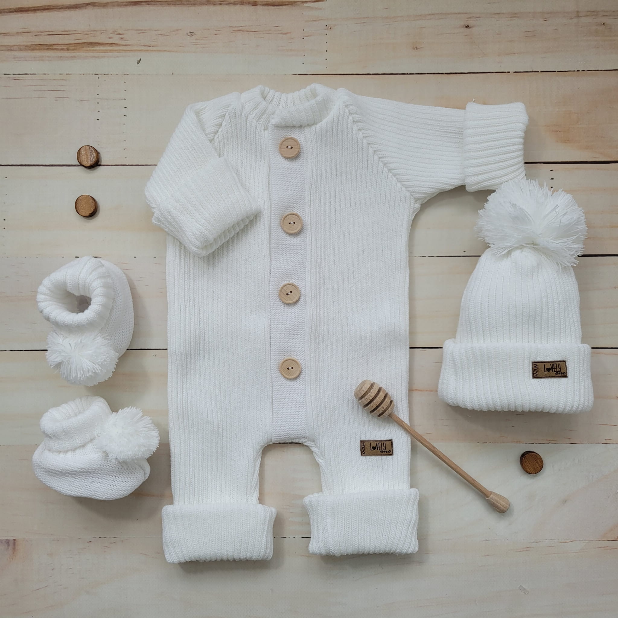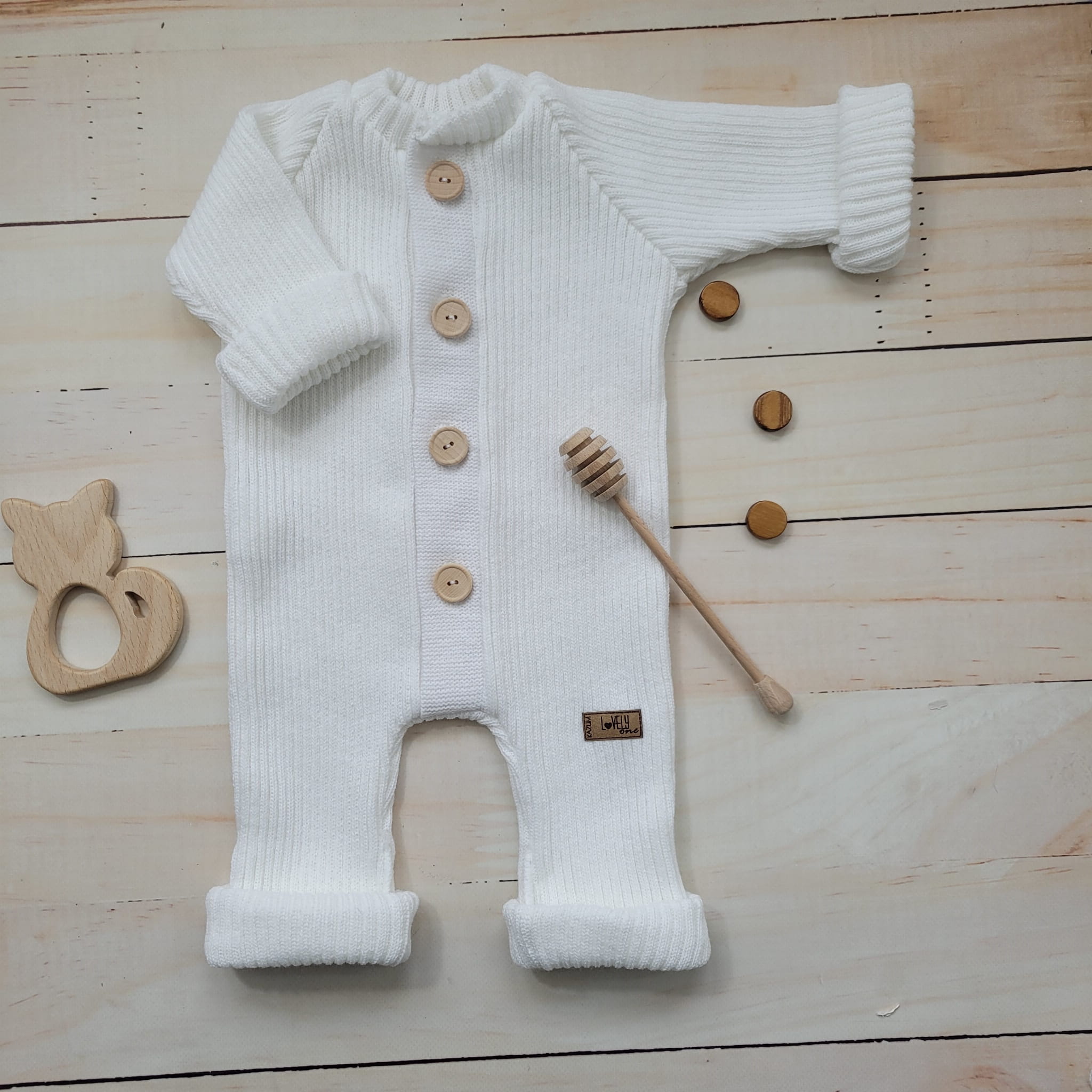Unikalny kombinezon pajac rozpinany dziergany włóczkowy bez kaptura. Kombinezon który rośnie z dzieckiem.