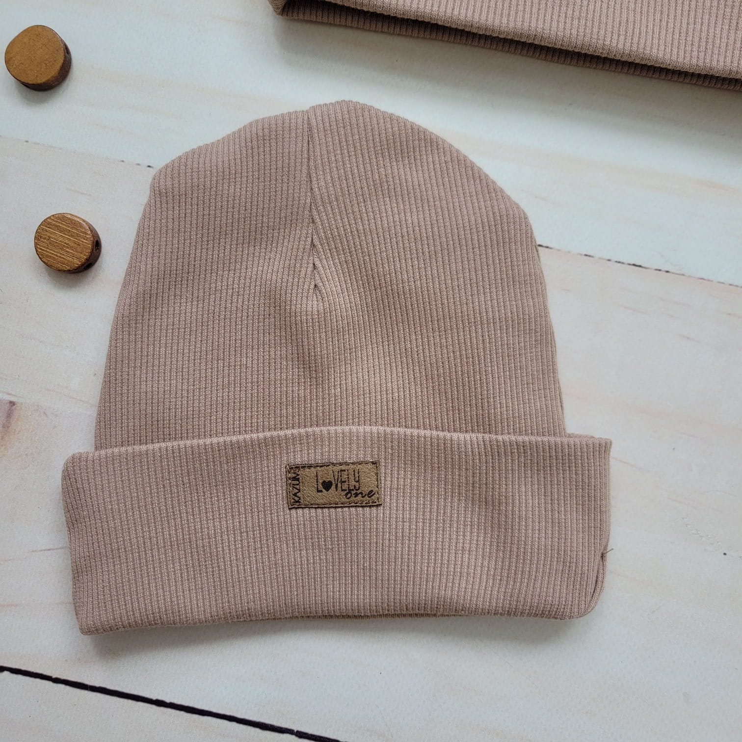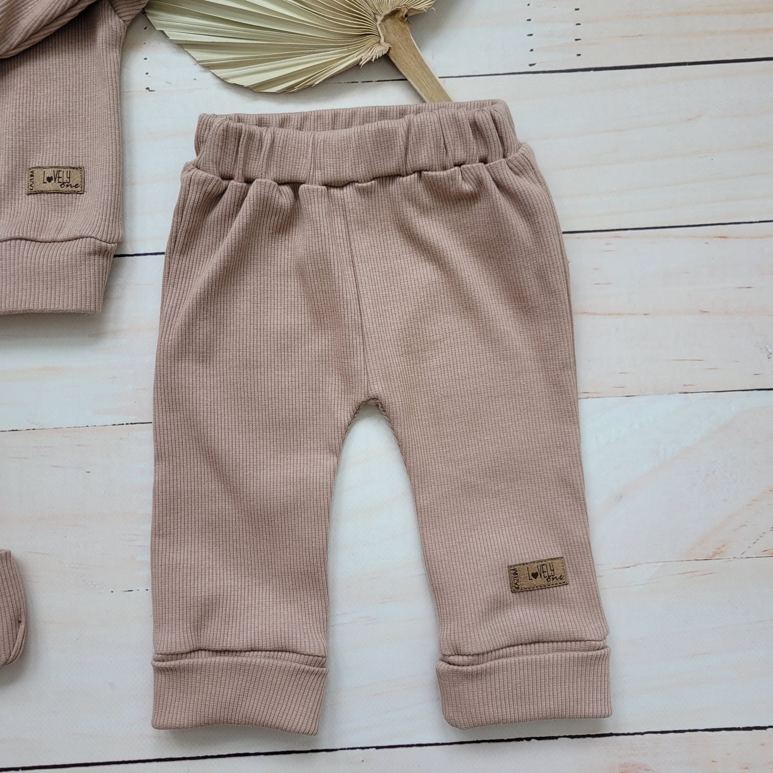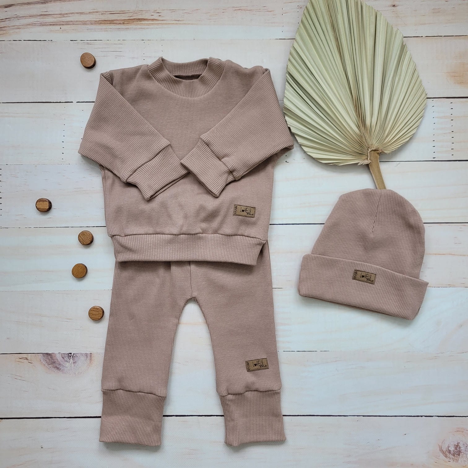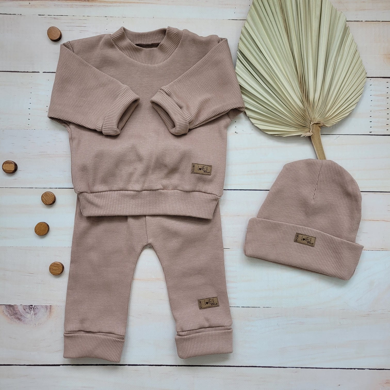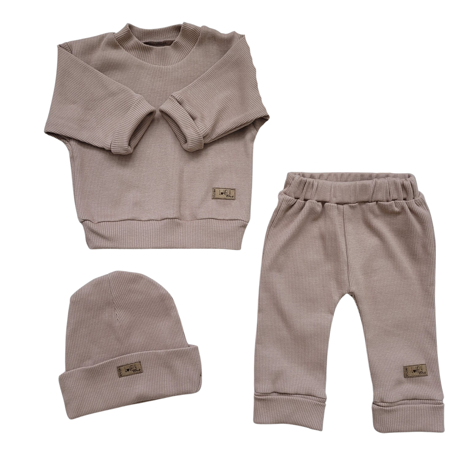 Unikalny prążkowany komplet niemowlęcy, dziecięcy bluza rozpinana przy szyi + spodnie + czapeczka w kolorze caffe mokka.