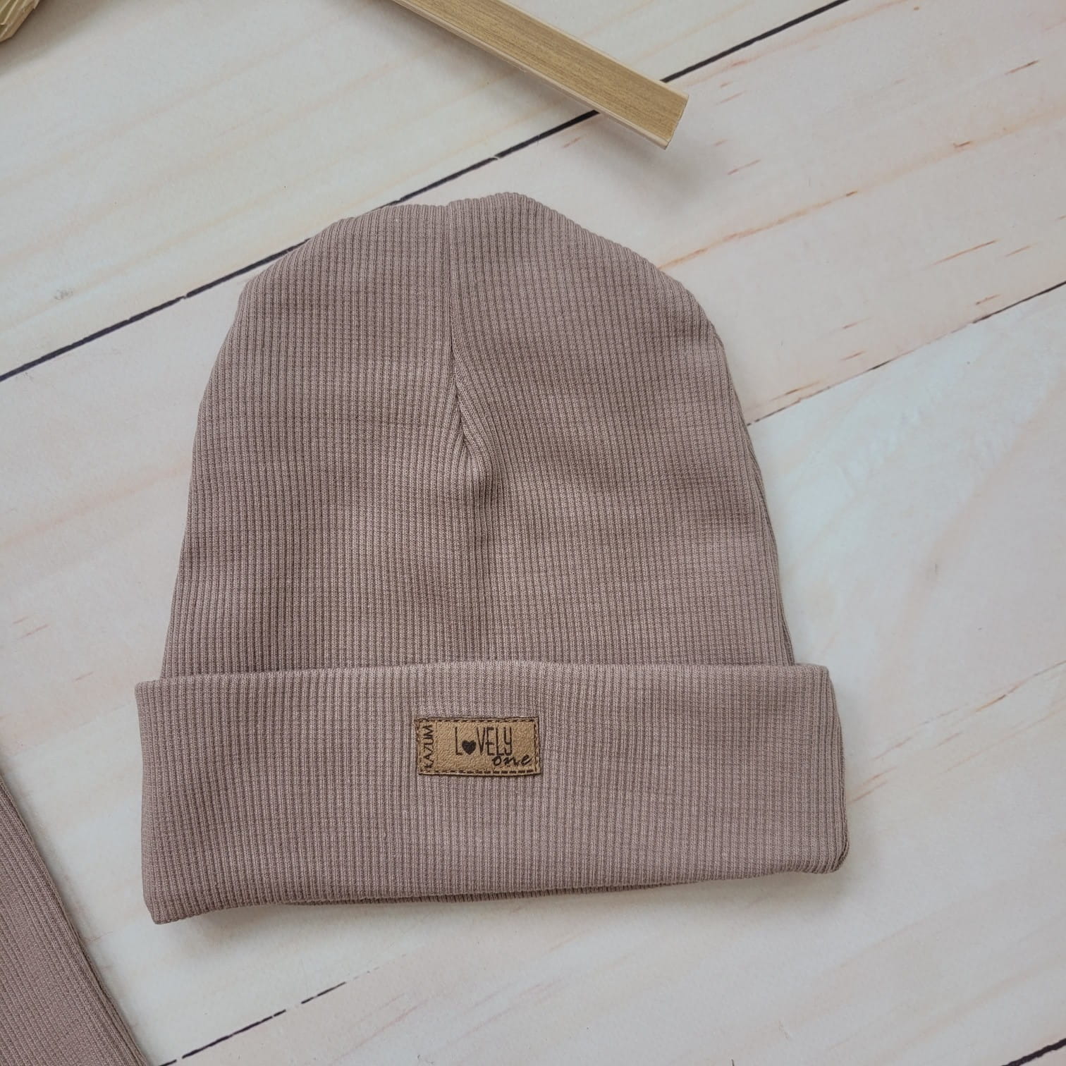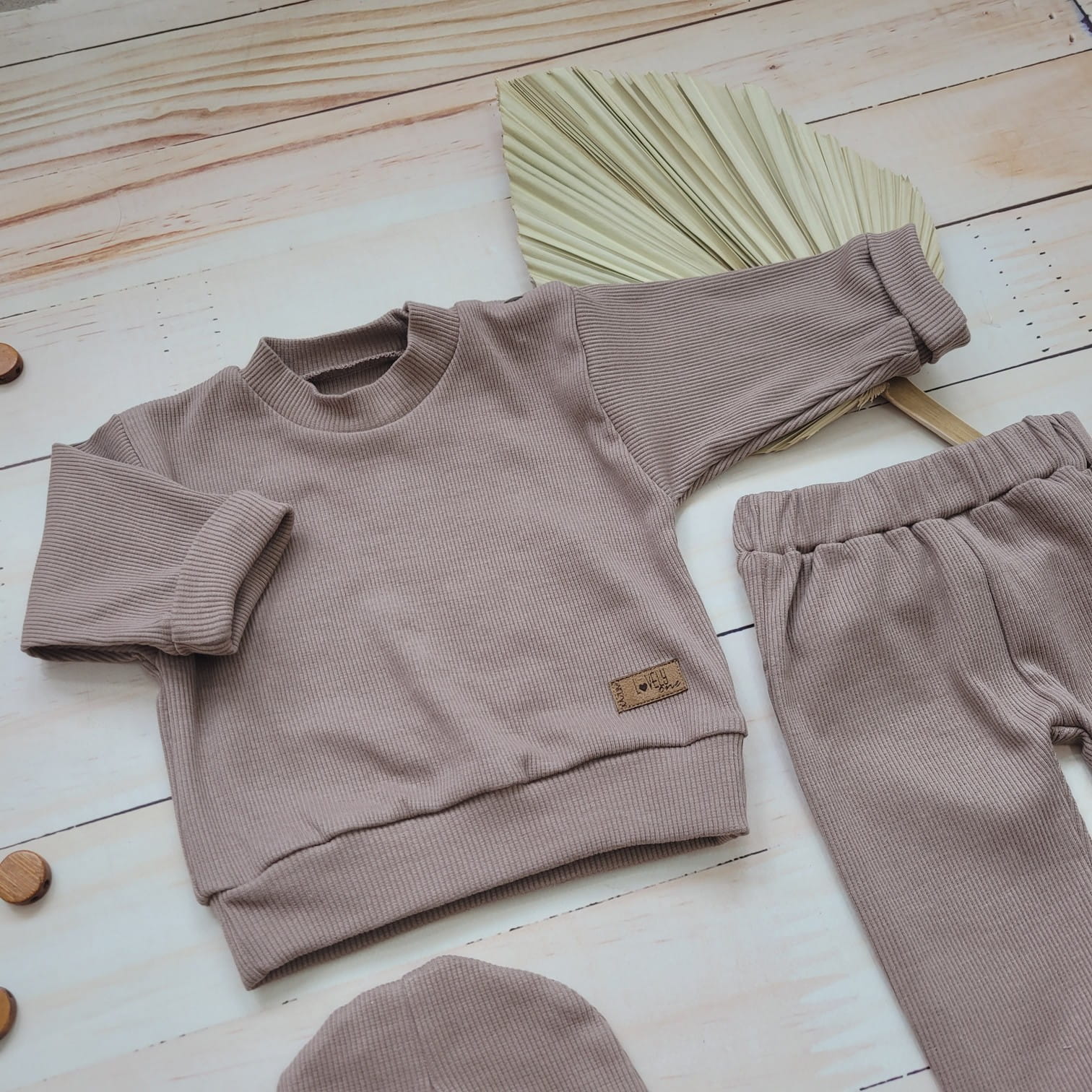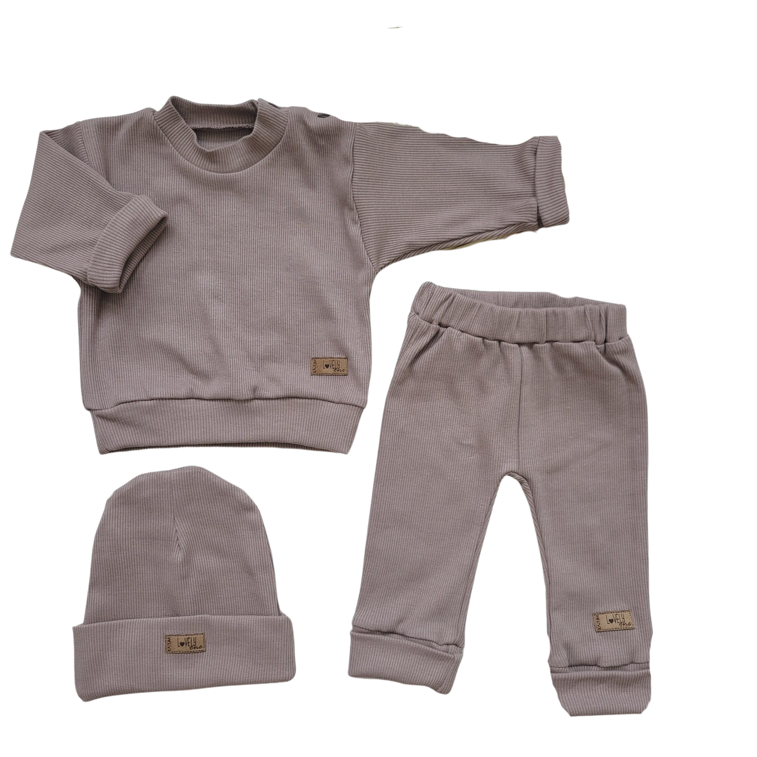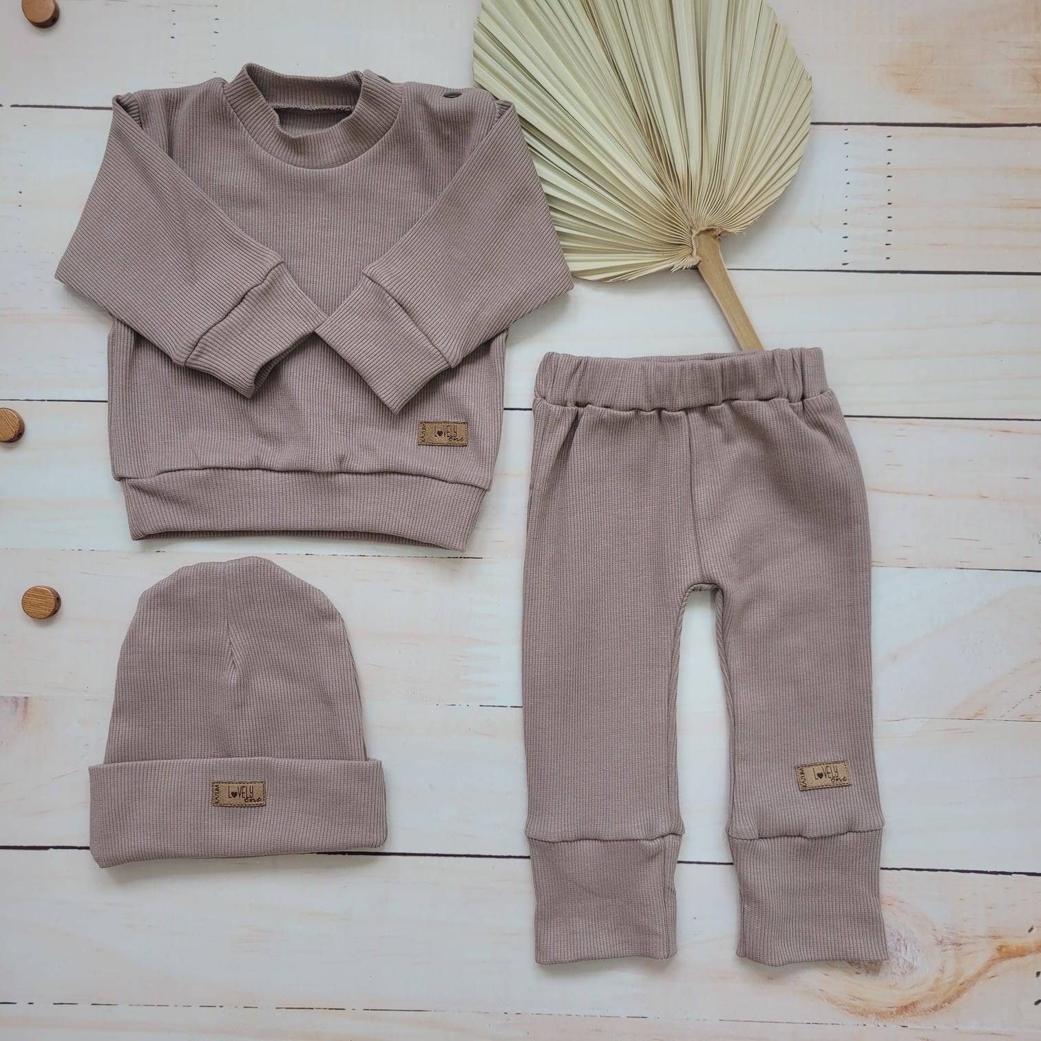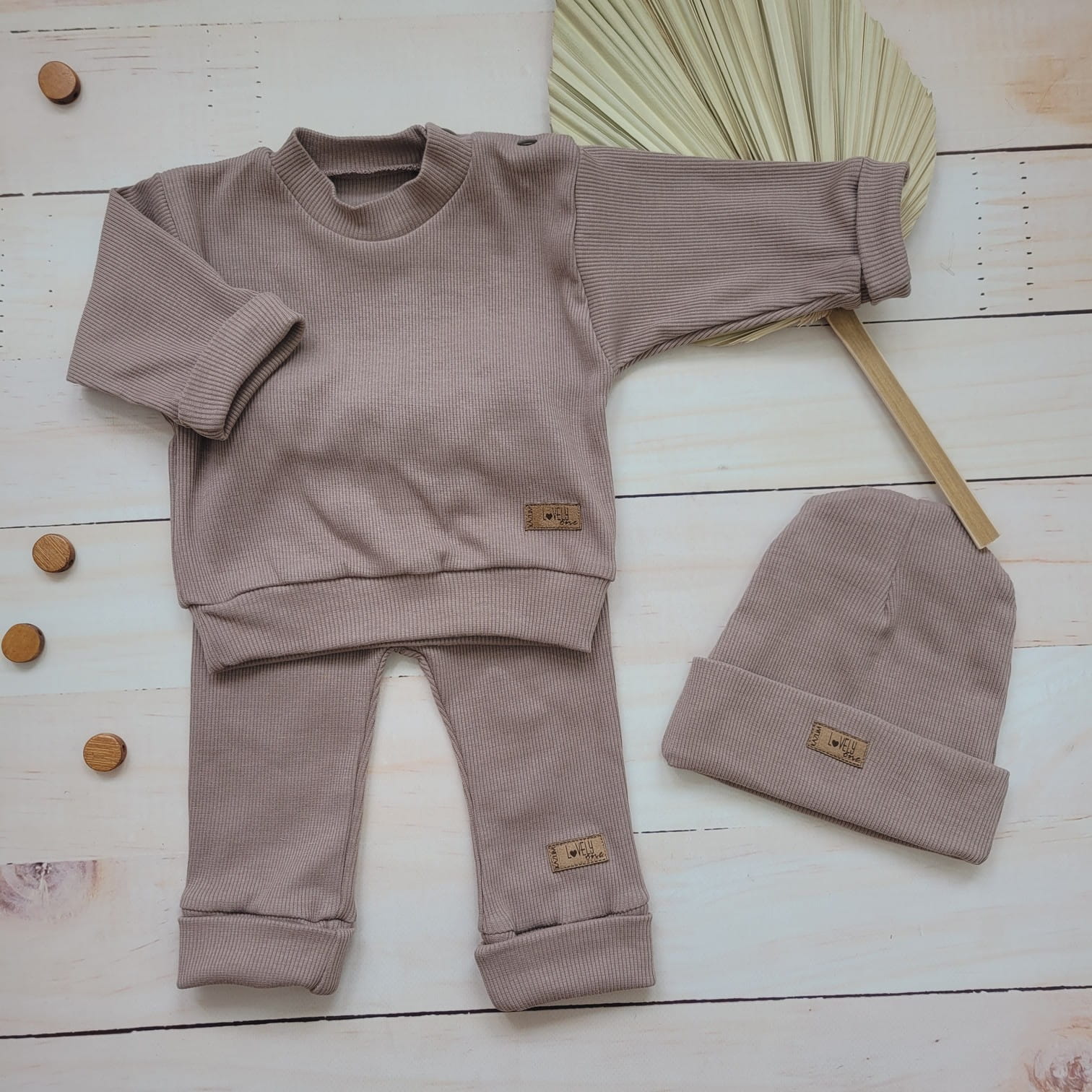Unikalny prążkowany komplet niemowlęcy, dziecięcy bluza rozpinana przy szyi + spodnie + czapeczka w kolorze sweet chocco.