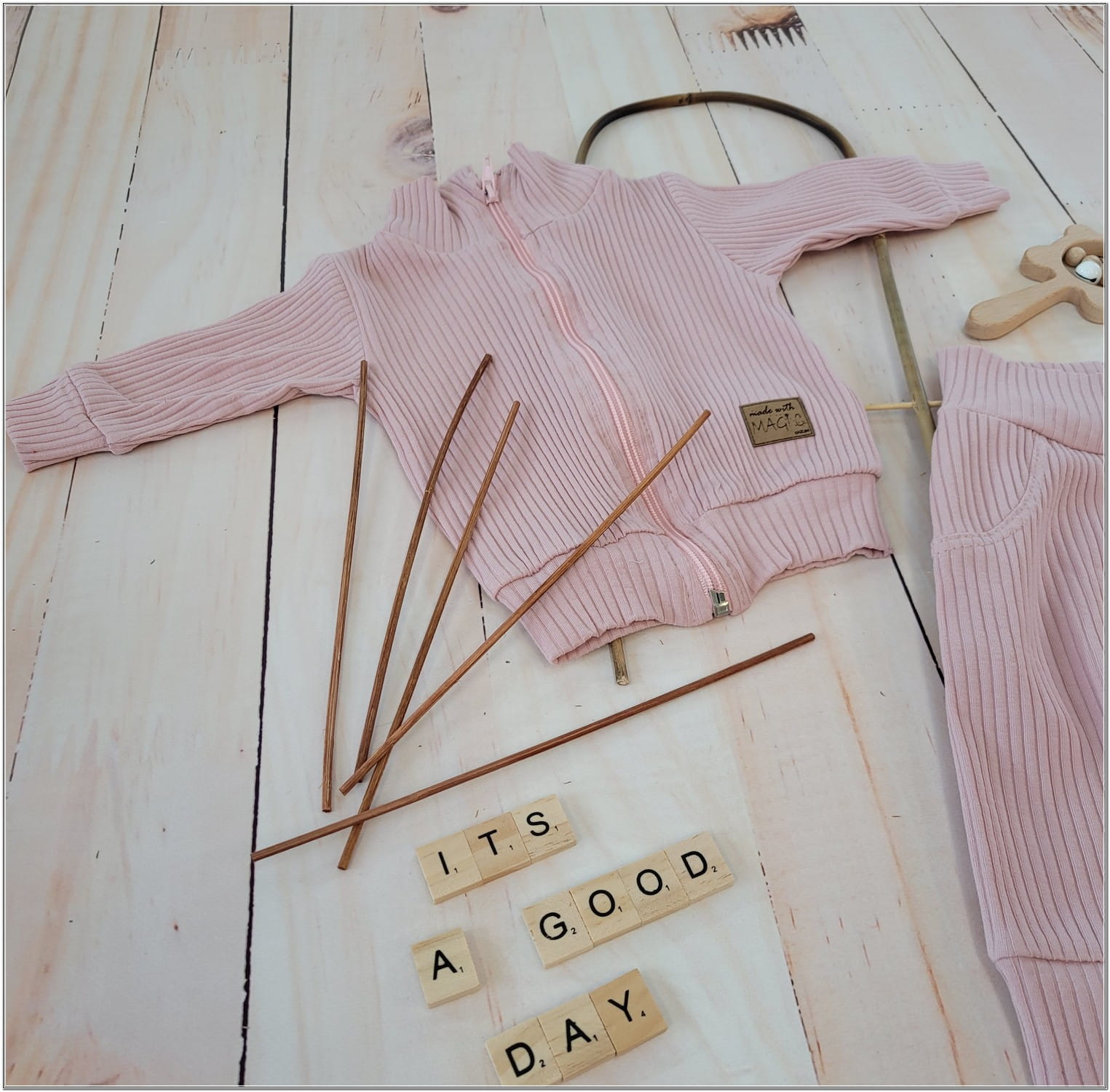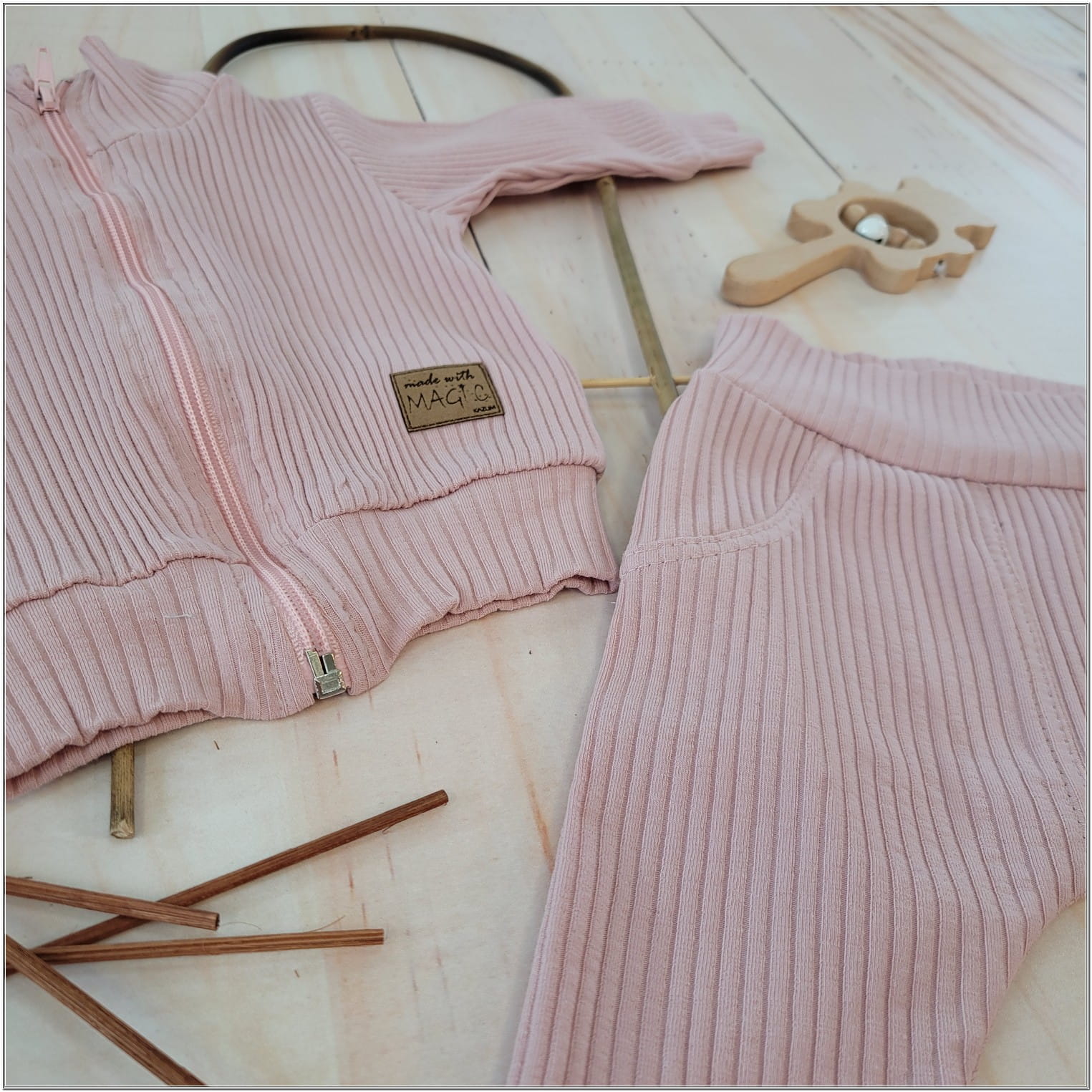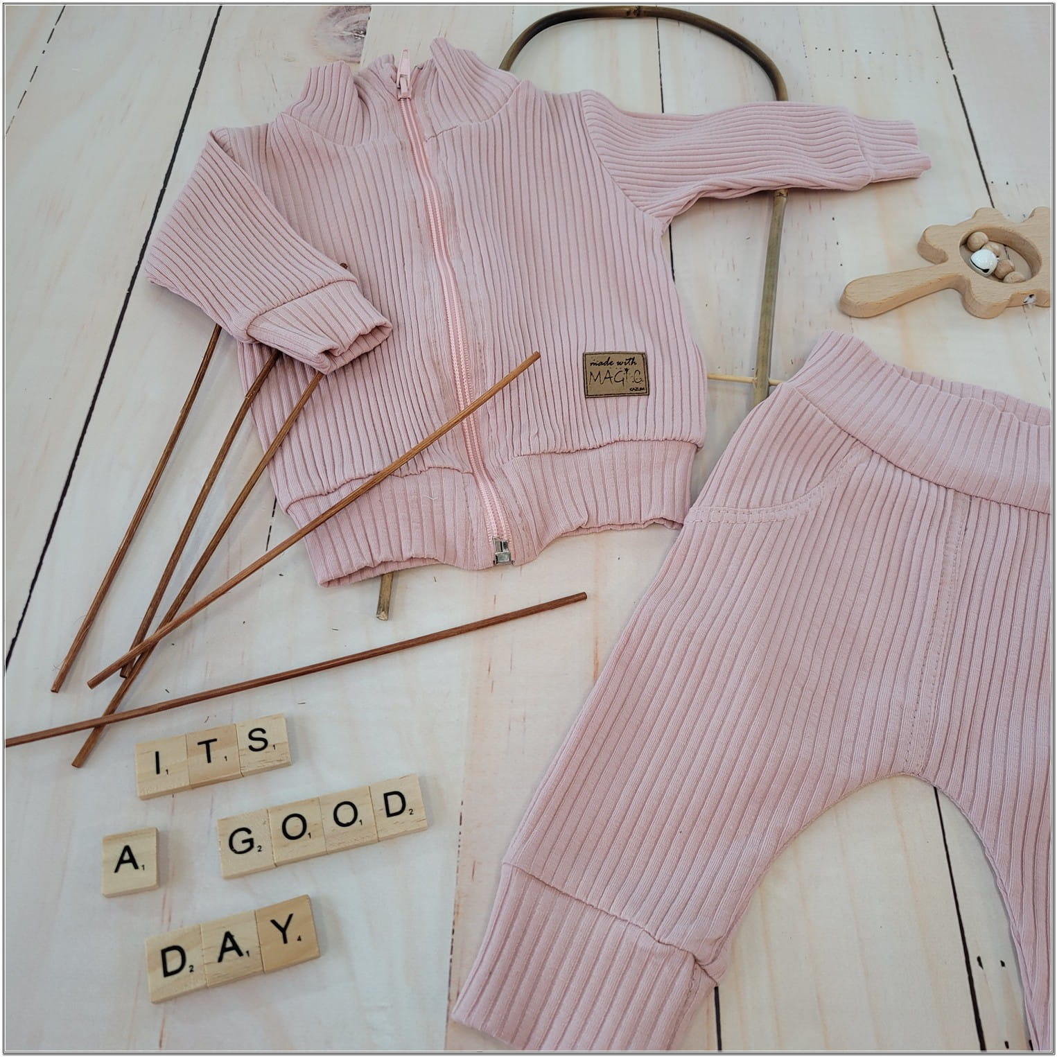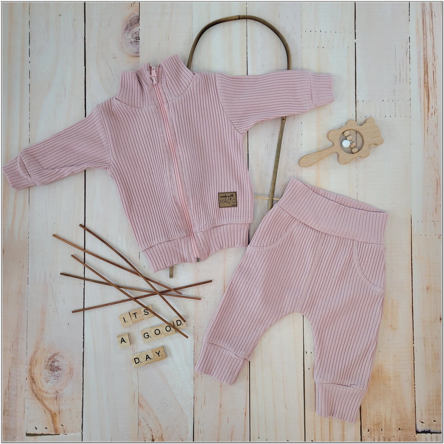Prążkowany dres niemowlęcy: Bluza rozpinana na zamek ze stójką, bez kaptura oraz spodnie z wygodnymi ściągaczami. Unikalna struktura prążka nadaje charakteru. Jest to cienki dres, idealny na cieplejsze miesiące. Brak kaptura jest zaletą, gdy chcemy ubrać dziecko na codzień w domu