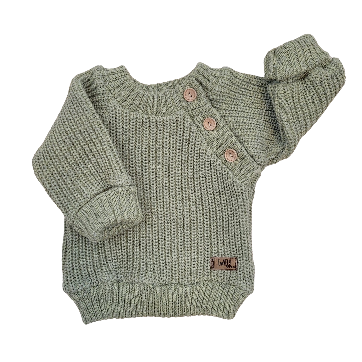Sweterek jest zapinany przy szyi na guziki. Jest bardzo elastyczny, dzięki czemu łatwo założysz go dziecku, nie krępując jego ruchów.
