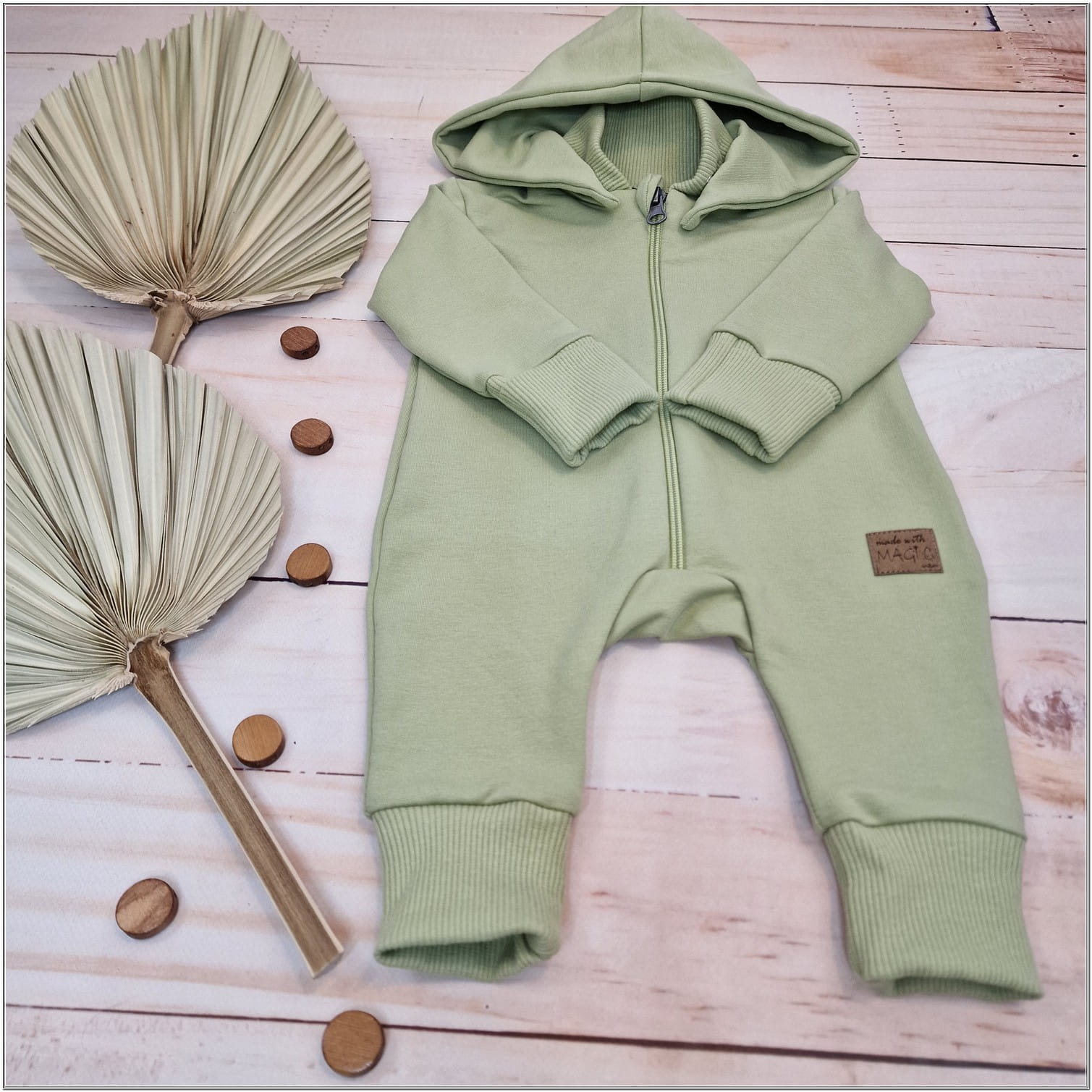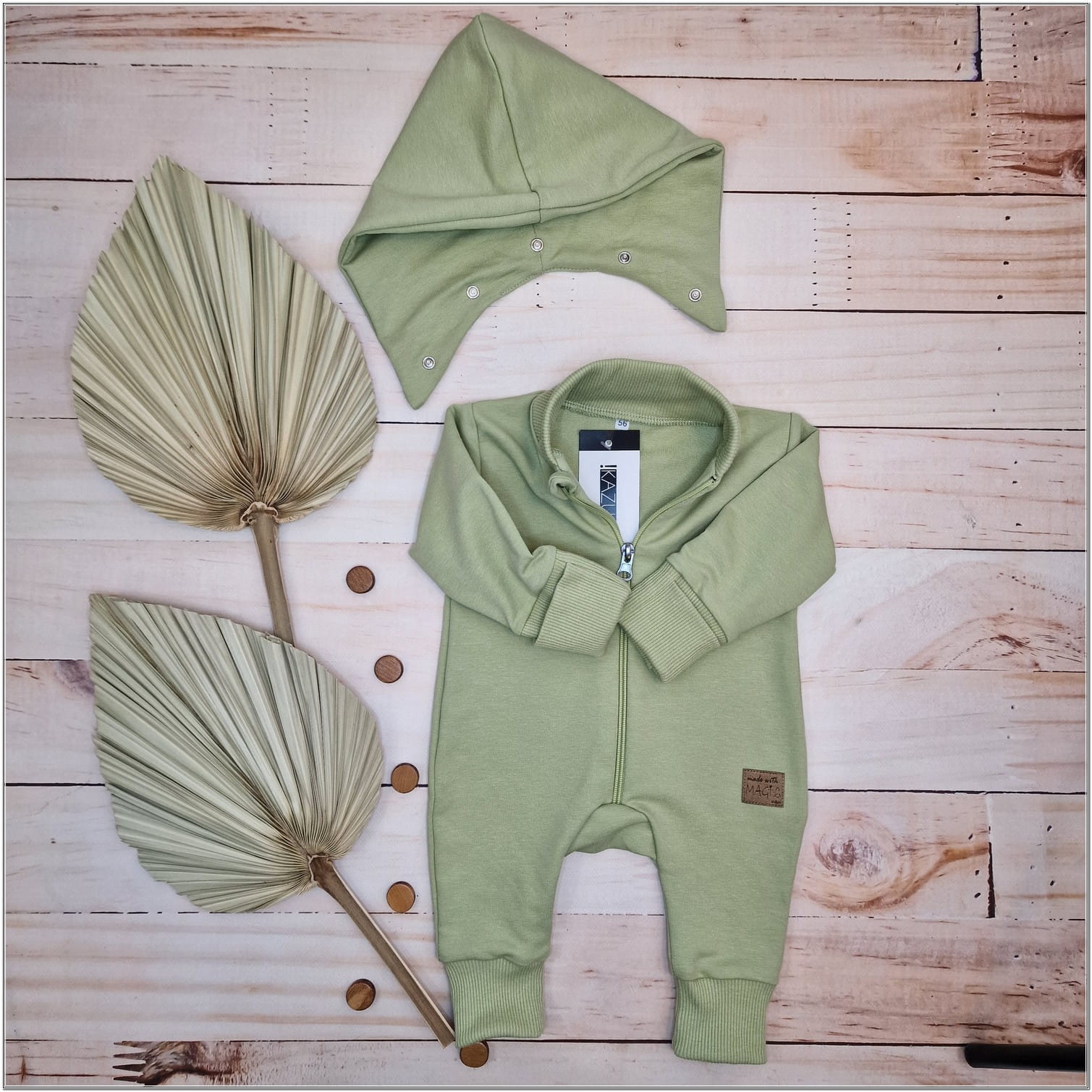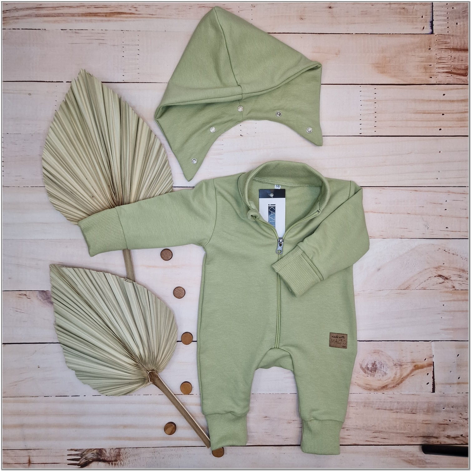 Kombinezon, pojedynczy- pajac dzienny z odpinanym kapturkiem. W każdej chwili, np. do snu czy do fotelika możemy dziecku odpiąć kaptur.