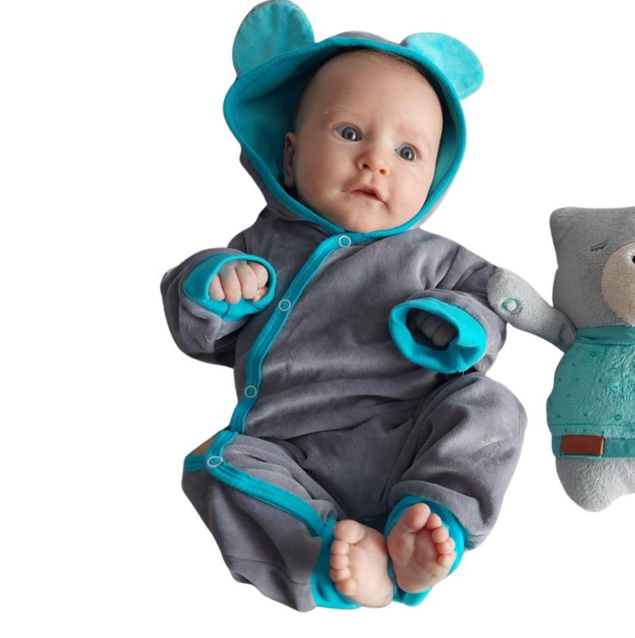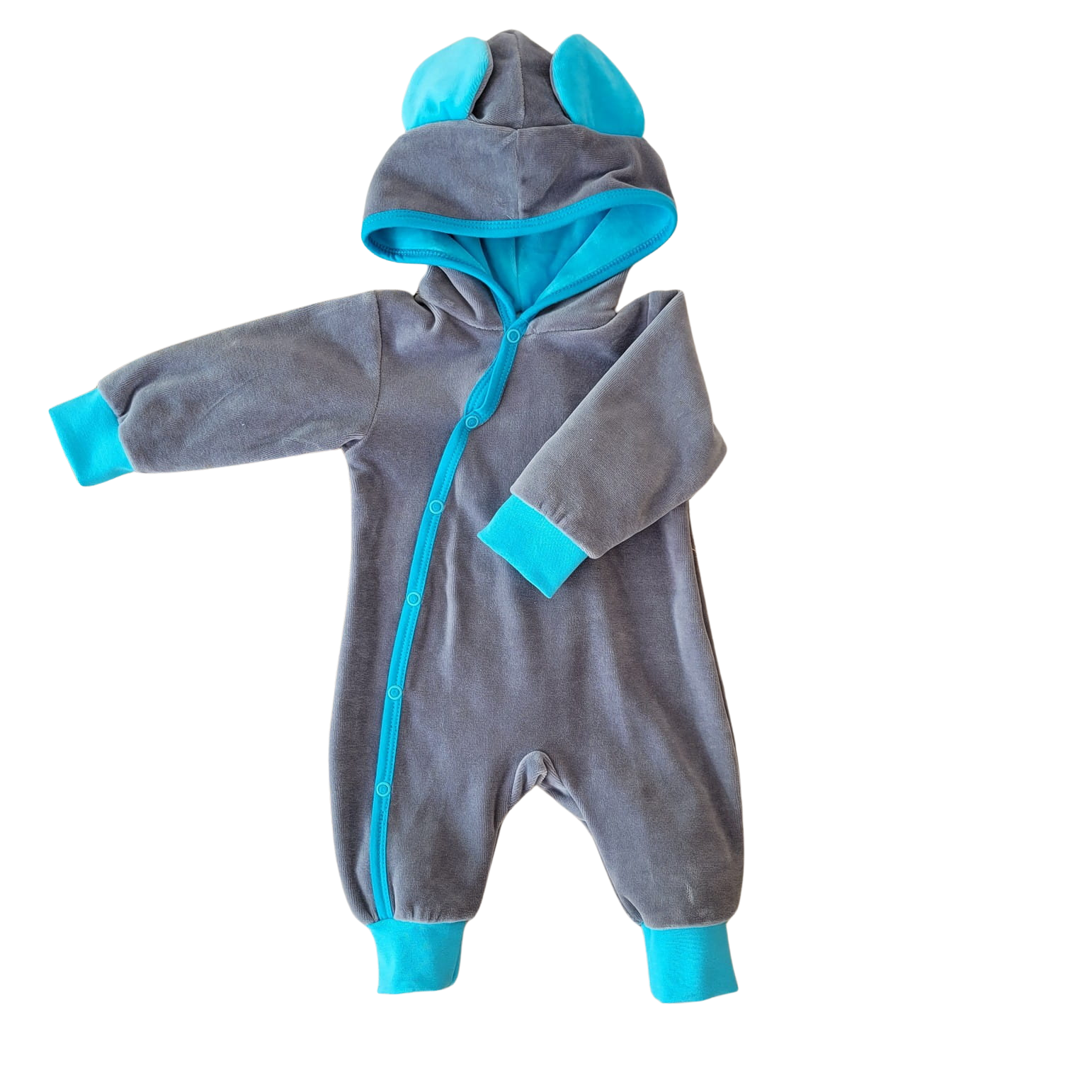 Welurowy pojedyńczy pajacyk, kombinezon z kapturem z uszami .