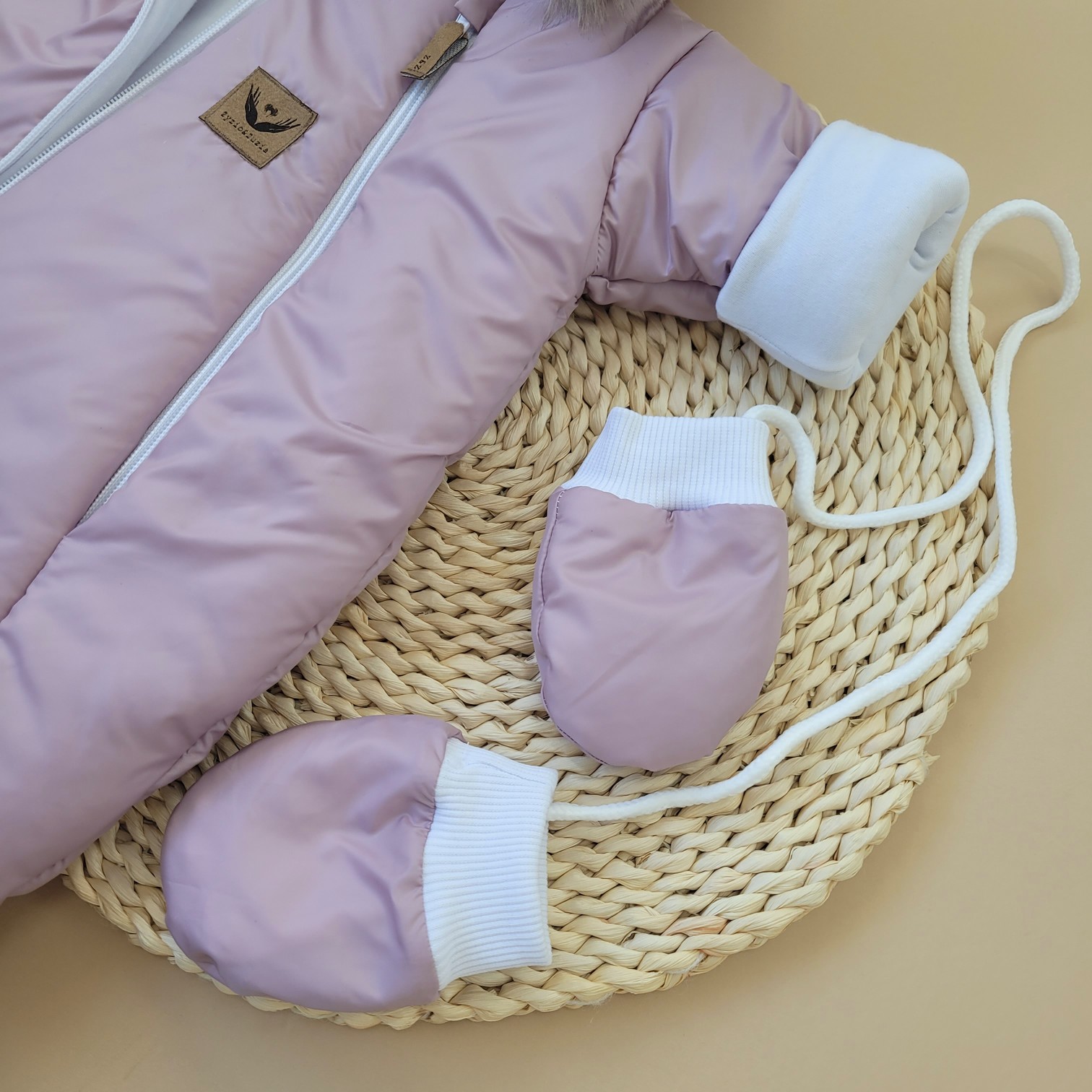 Kurtkowy kombinezon na zimę. Do kombinezonu załączone są rękawiczki. Kaptur posiada urokliwe sztuczne futerko.