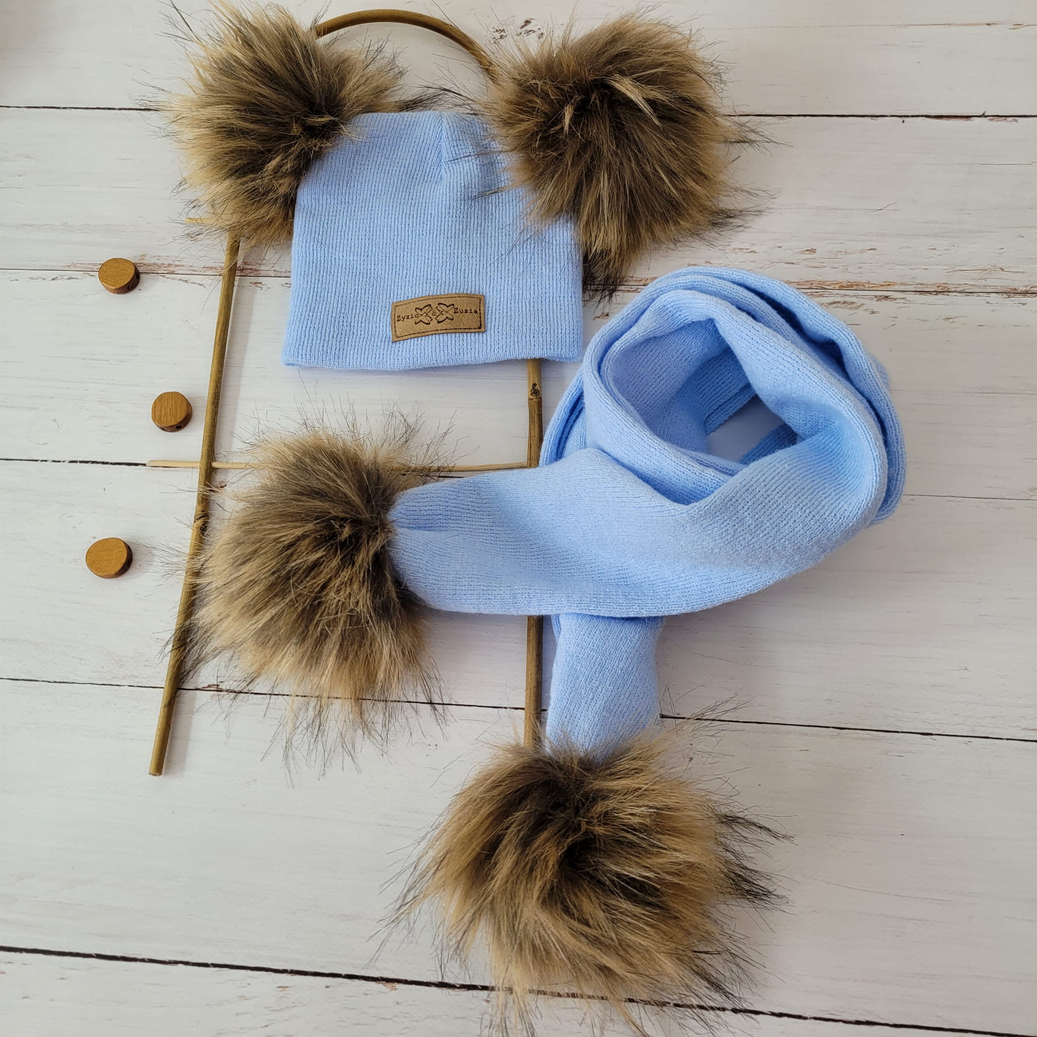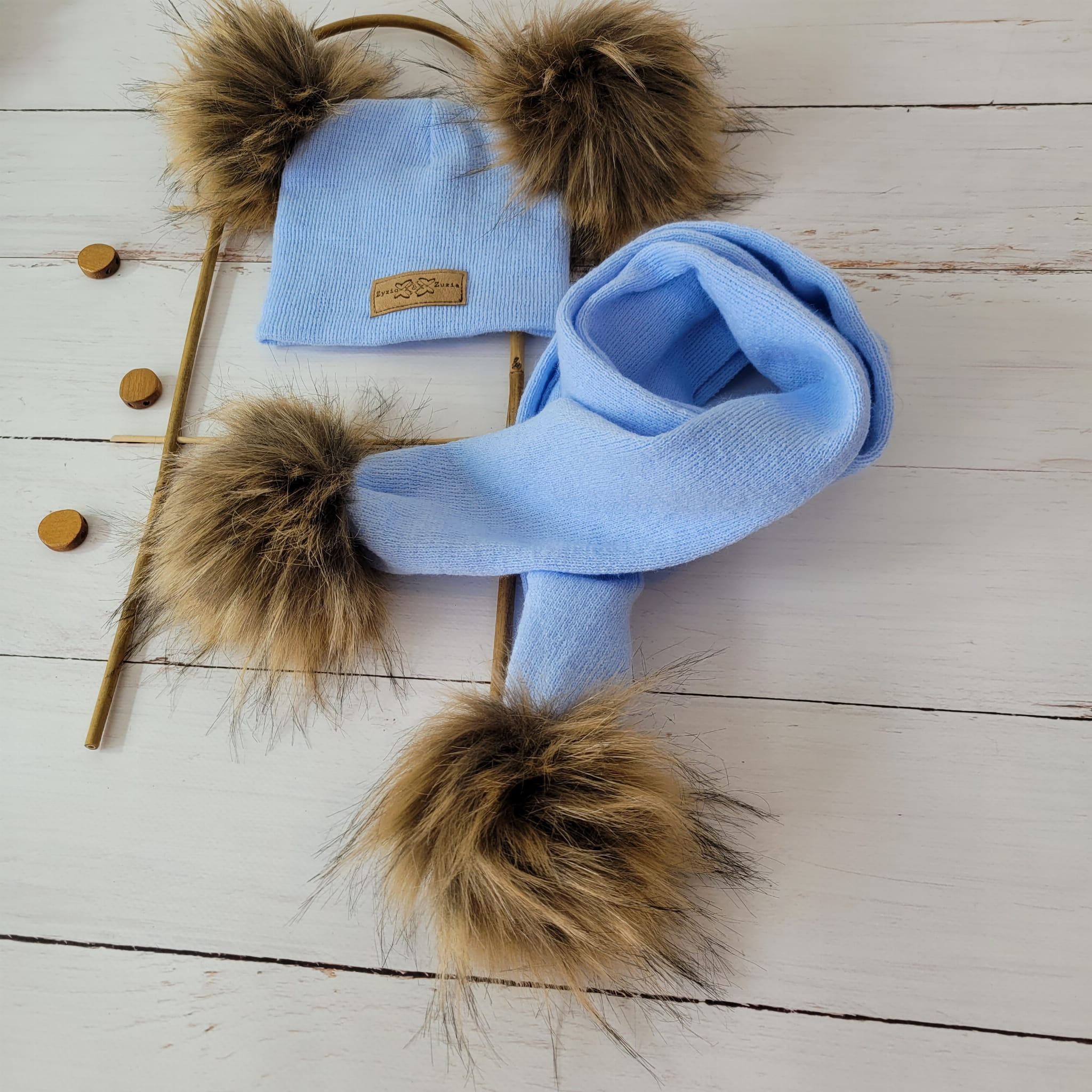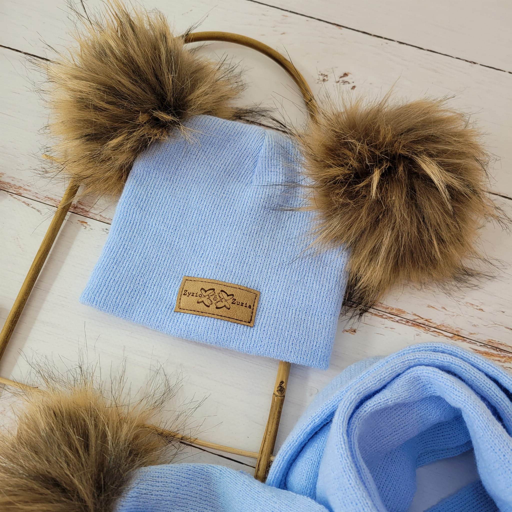 Komplet Czapka+szalik z pomponami różne rozmiary od 0 do 5lat z futerkiem niebieski