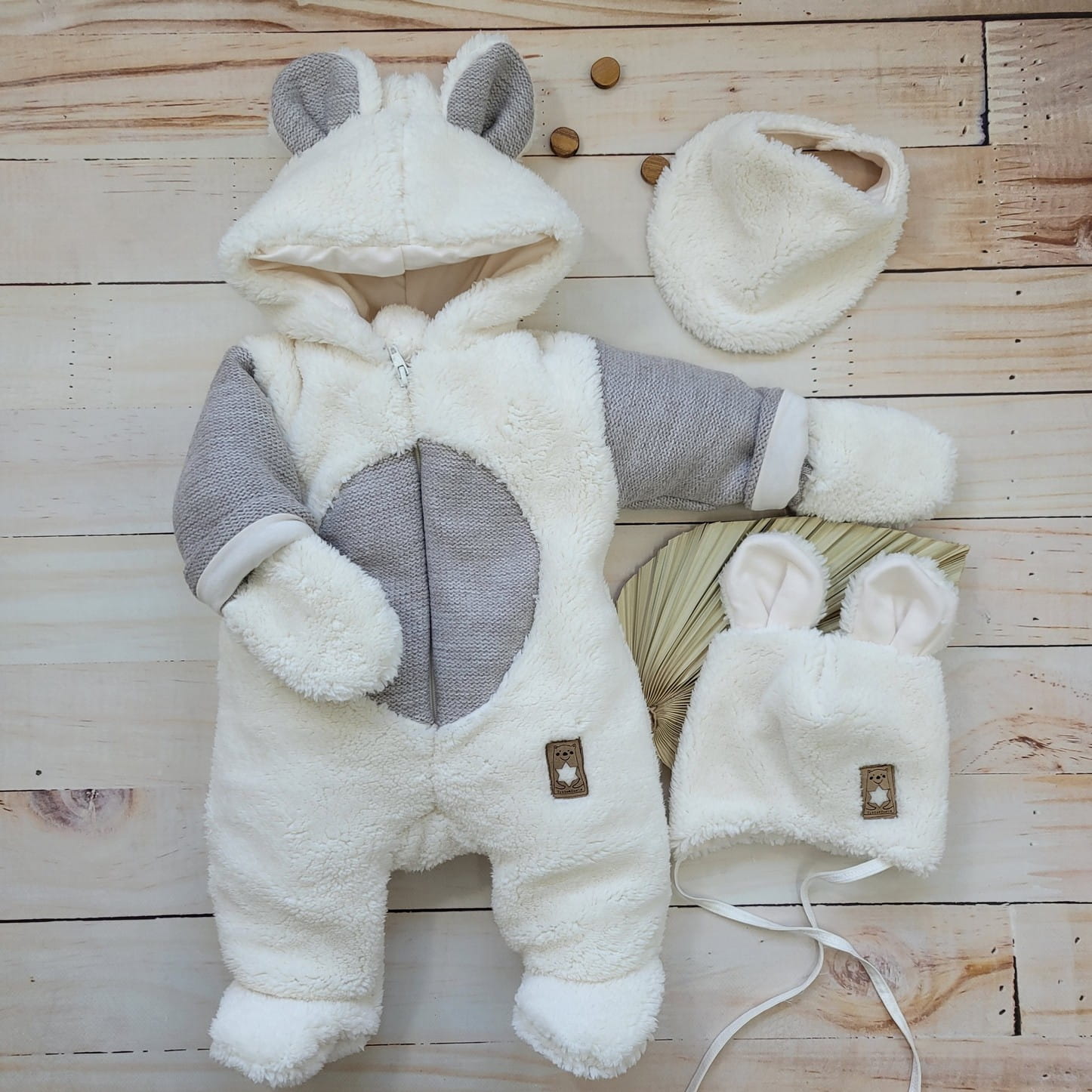 Komplet misiowy kombinezon + czapka + apaszka 56-86 ecru