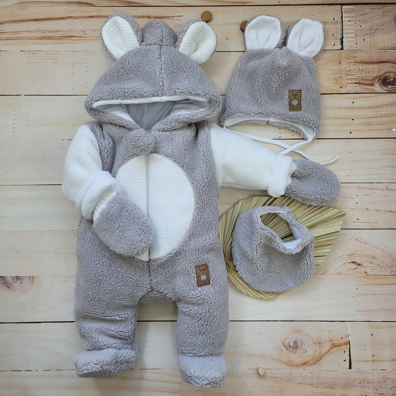 Komplet misiowy kombinezon + czapka + apaszka 56-86 szary