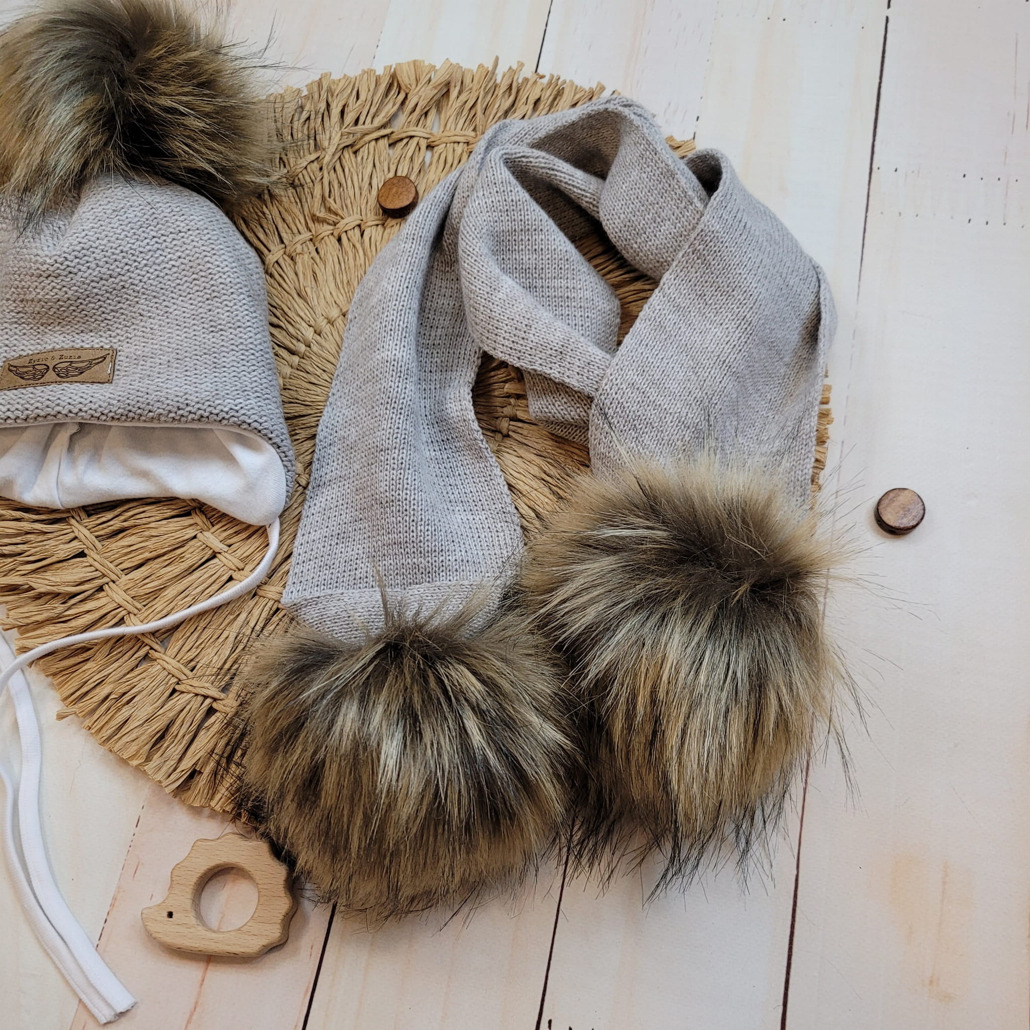 Komplet włóczkowy czapka wiązana z pomponem + szalik, piaskowy