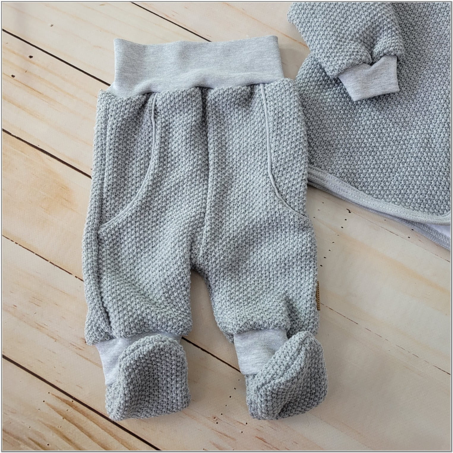 Kurtka, czapka i spodnie z wbudowanymi butkami wykonane z pięknego włóczkowego materiału.