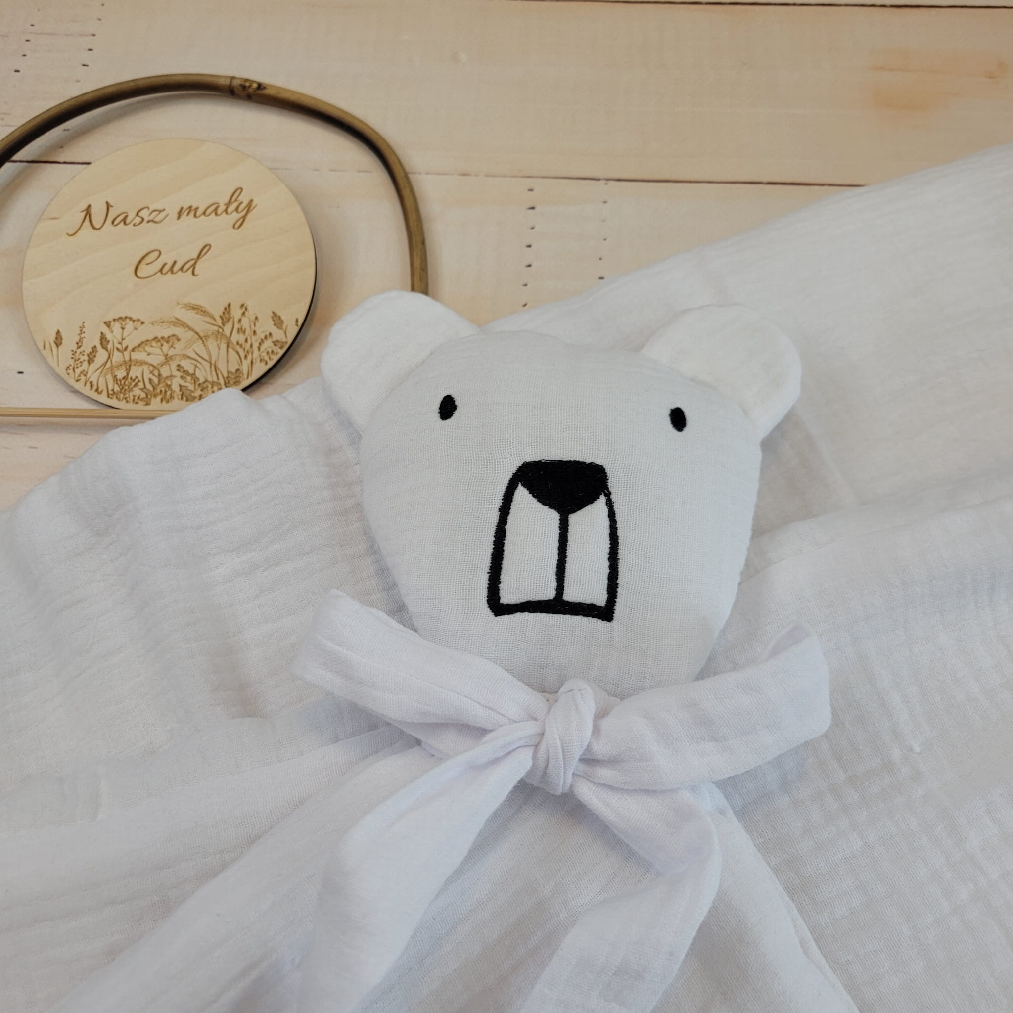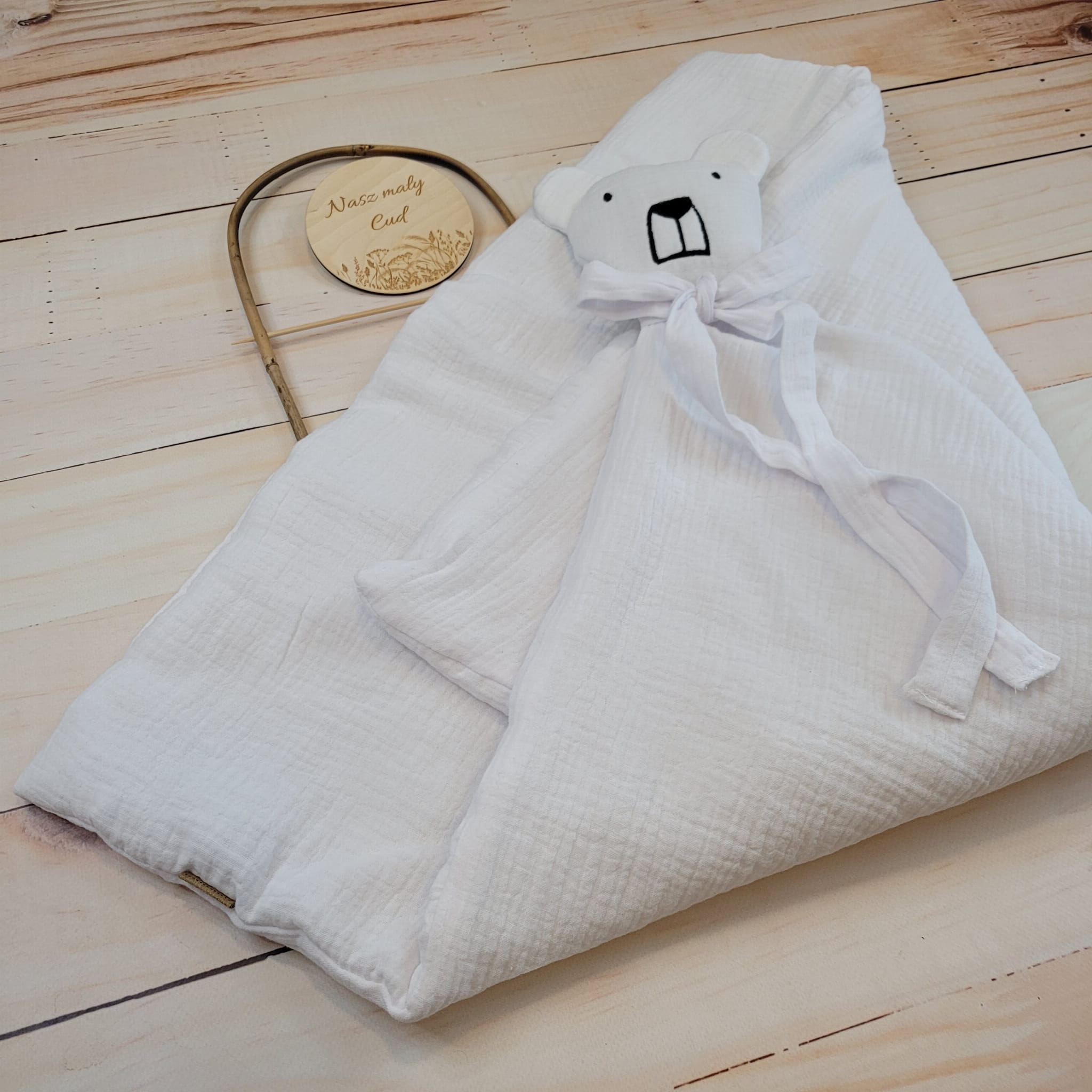 Miękki ciepły kocyk kołderka dla niemowlaka muślin biały miś