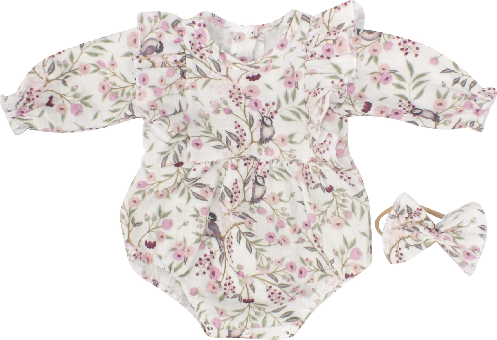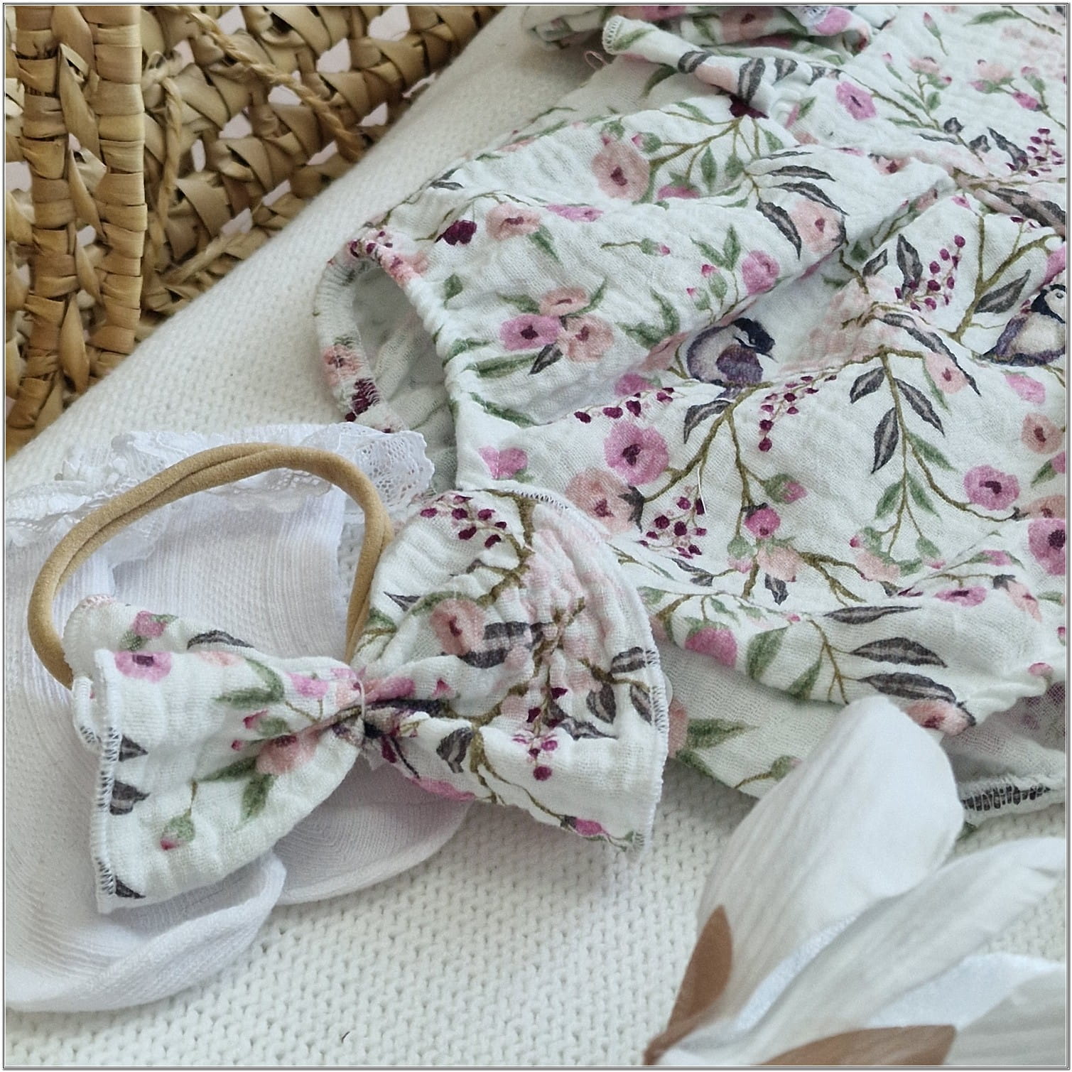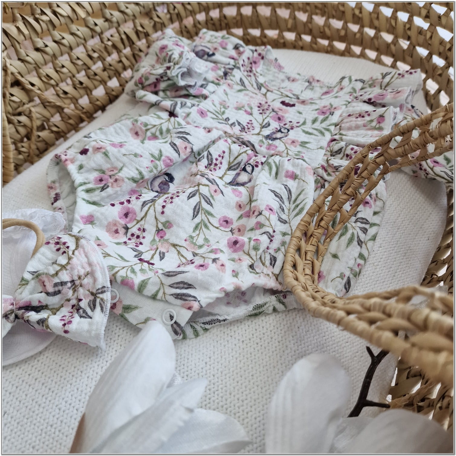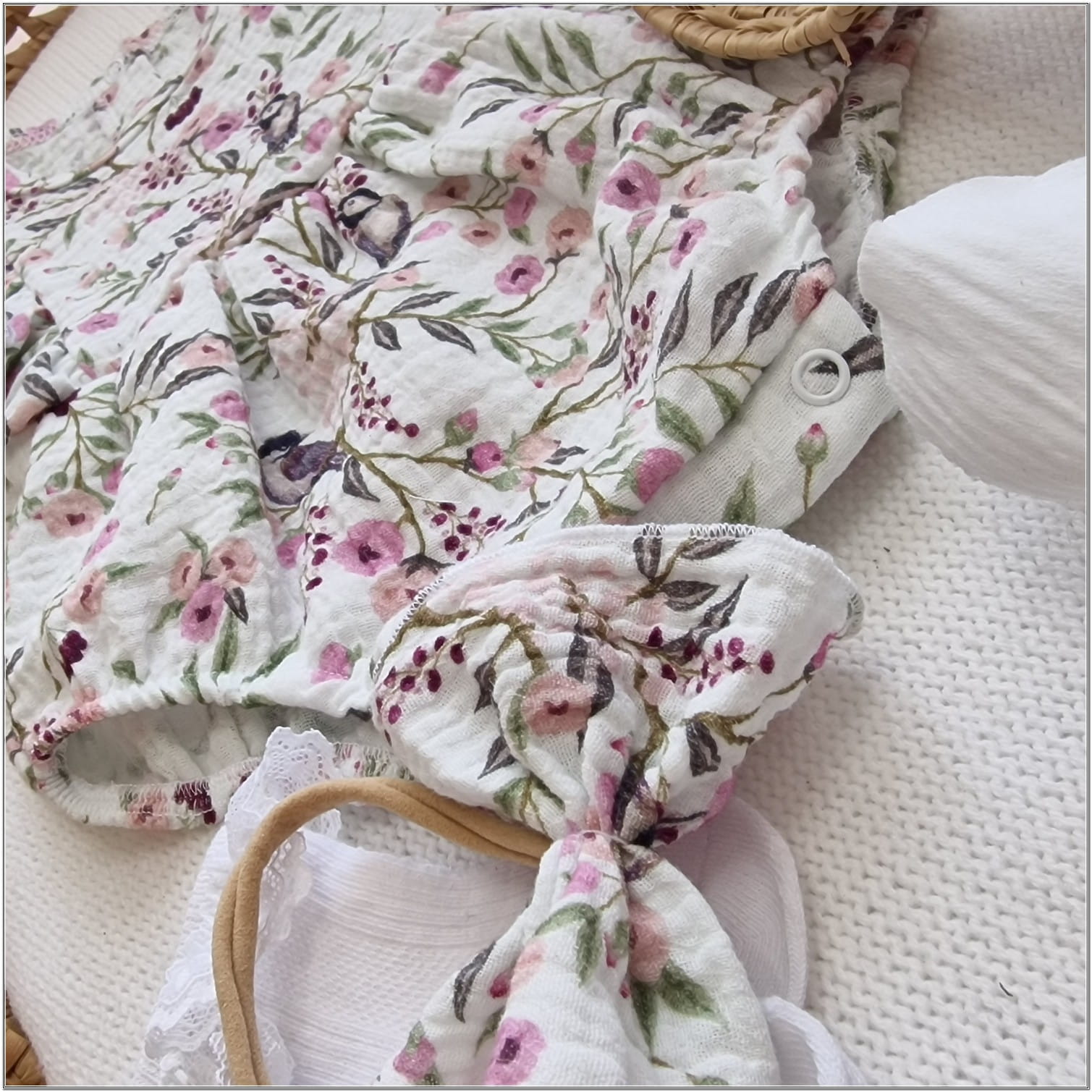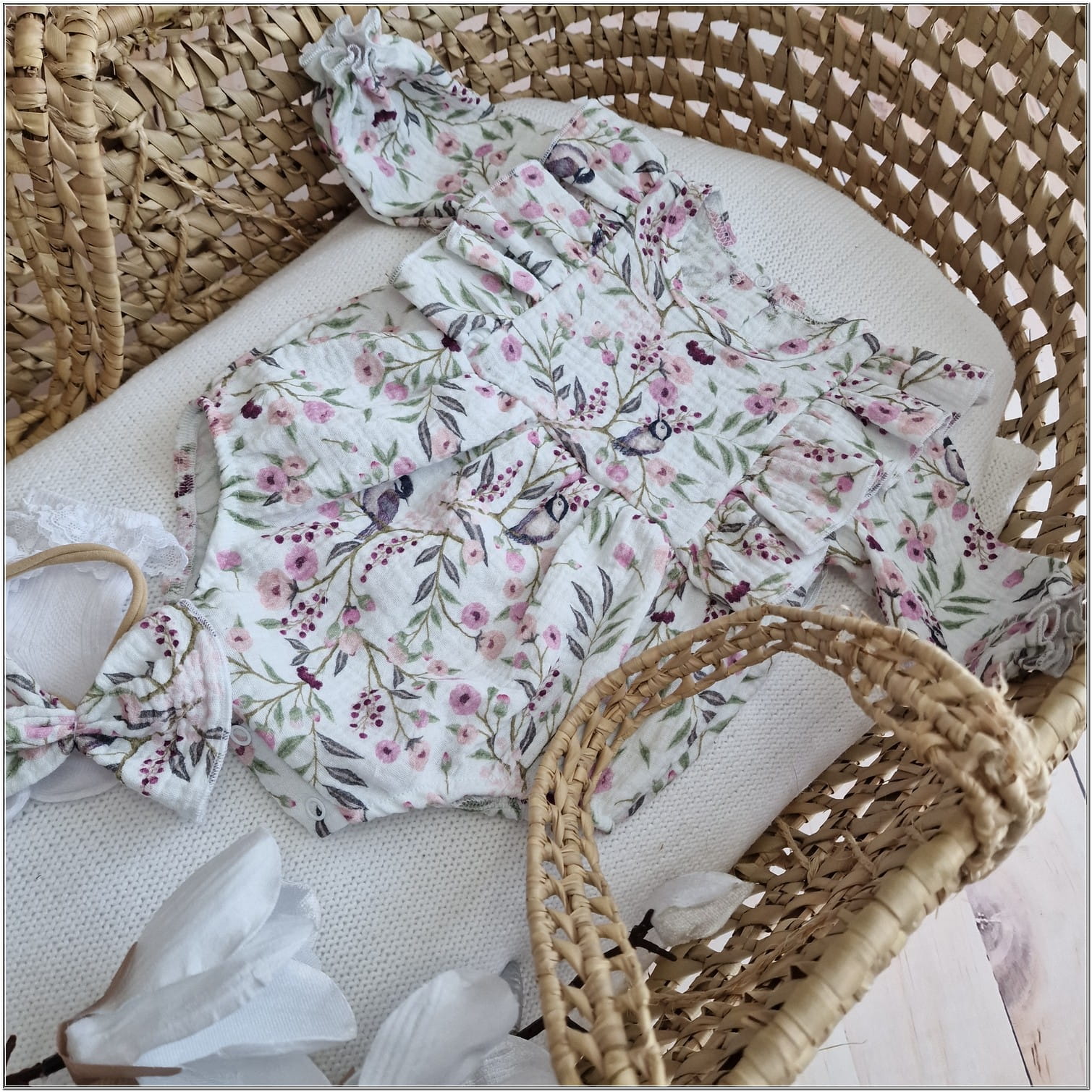 Komplet muślinowy, delikatna sukienka/bodosukienka body z falbankami z długim rękawem +opaska