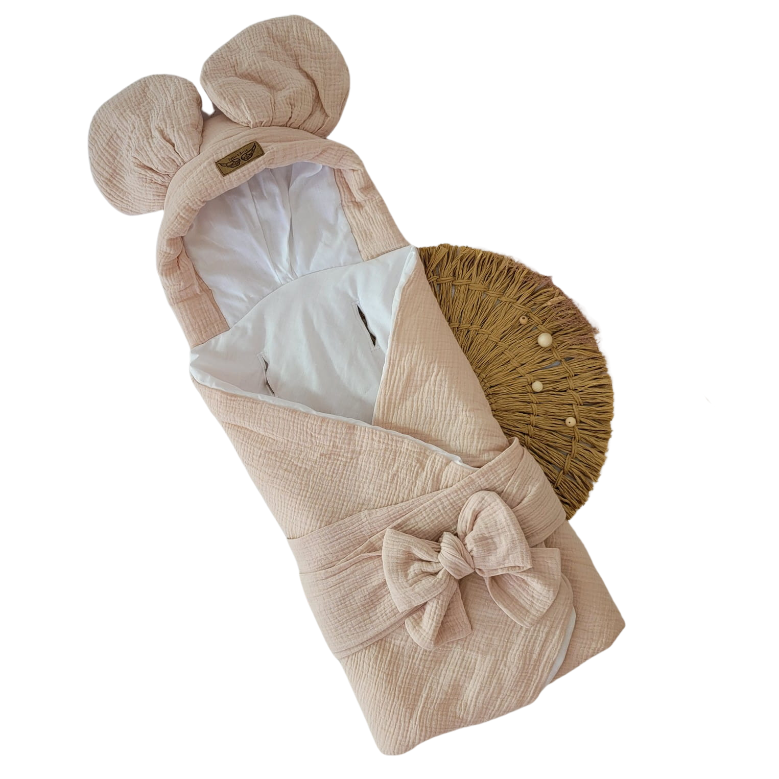 Śpiworek wykonany został z zewnątrz z muślinu 100% Bawełna. W środku mięciutka podszewka 100%Bawełna. Między warstwy zaszyty ocieplacz.