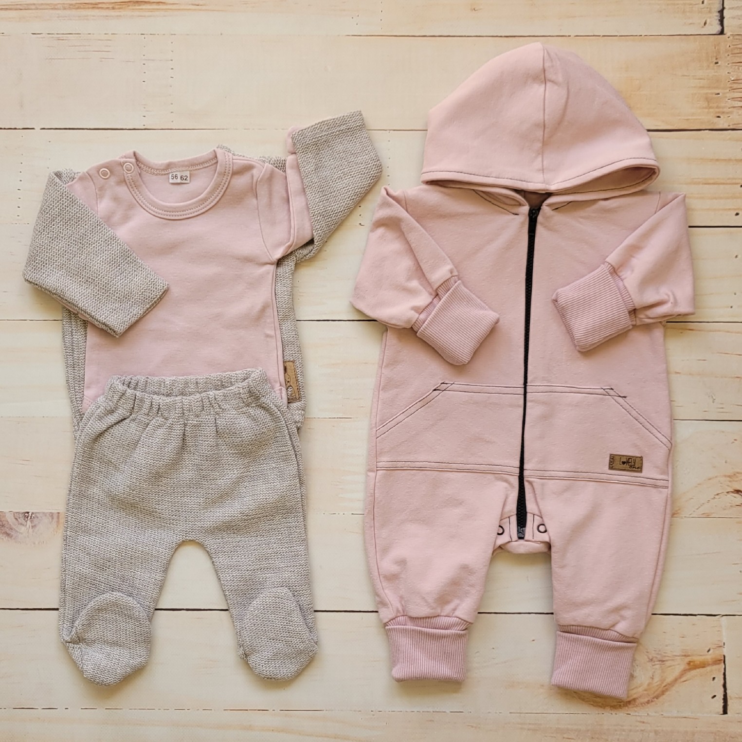 Dwuczęściowy, miękki komplecik włóczkowy wraz z pięknym pudrowym kombinezonem i body tworzą przecudną propozycję na wiosnę, jesień, czy chłodniejsze lato :)