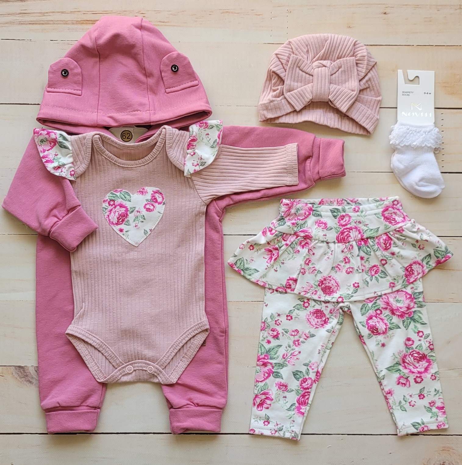 W zestawie uroczy kombinezon z guziczkami, oraz 3częściowy, piękny komplecik prążkowany komplecik- body, legginsy ze spódniczką i czapeczka.