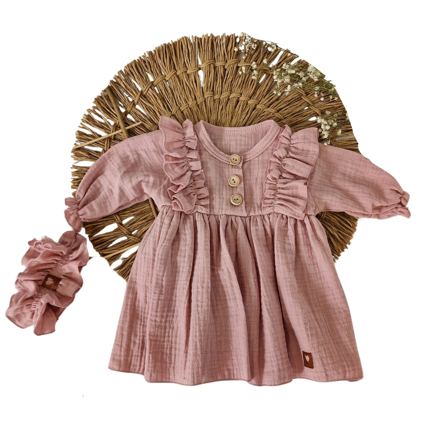 Komplet muślinowy, delikatna sukienka z falbankami z długim rękawem + opaska