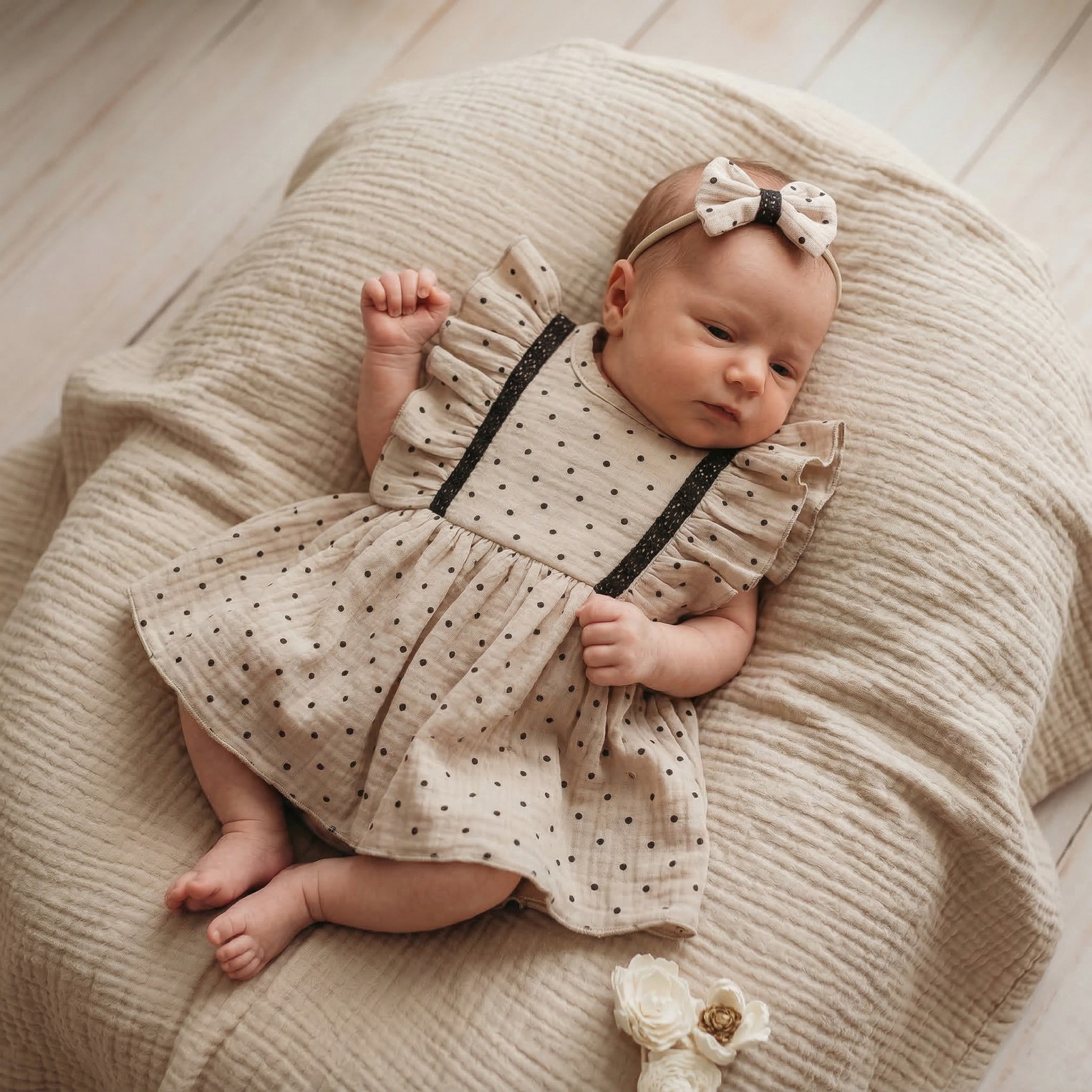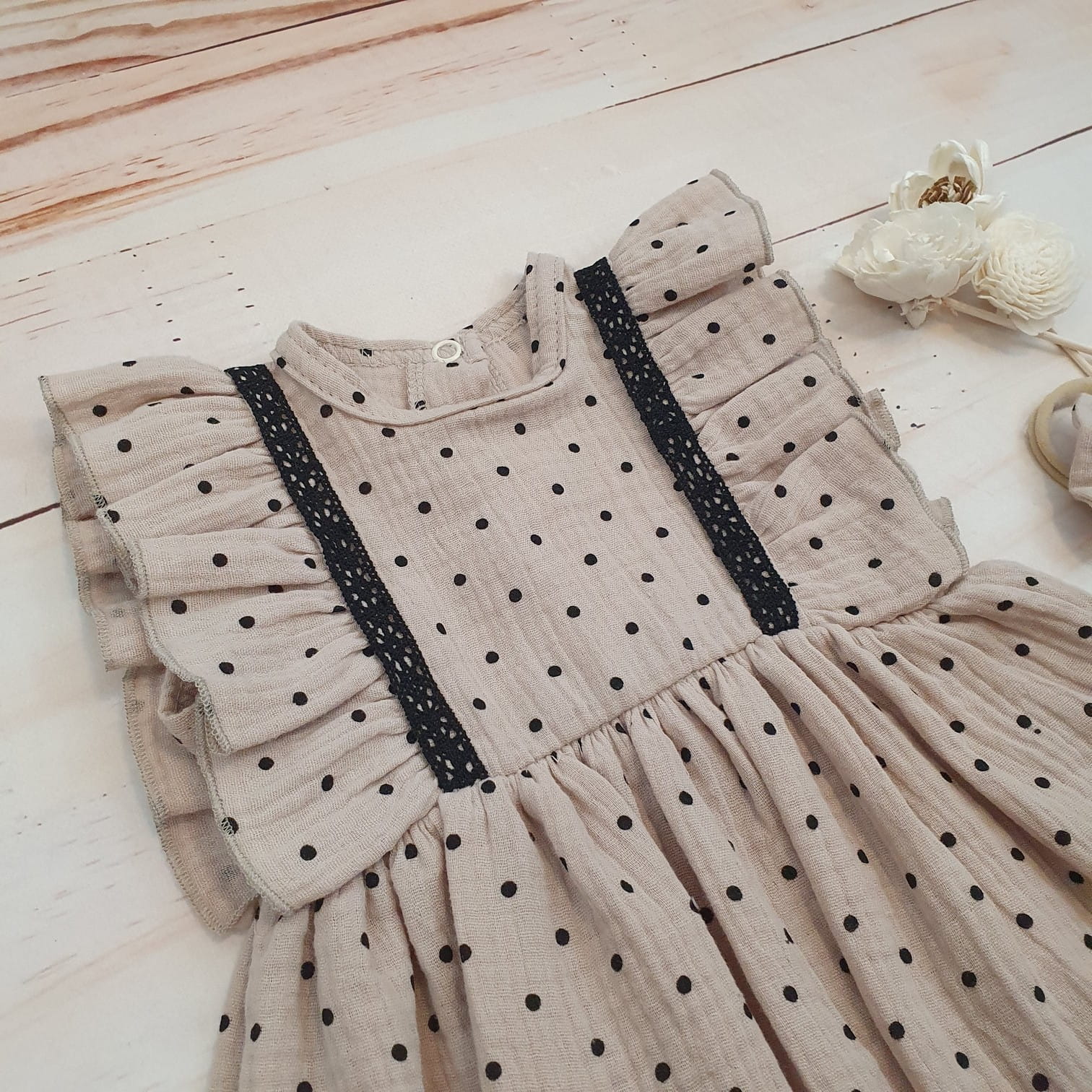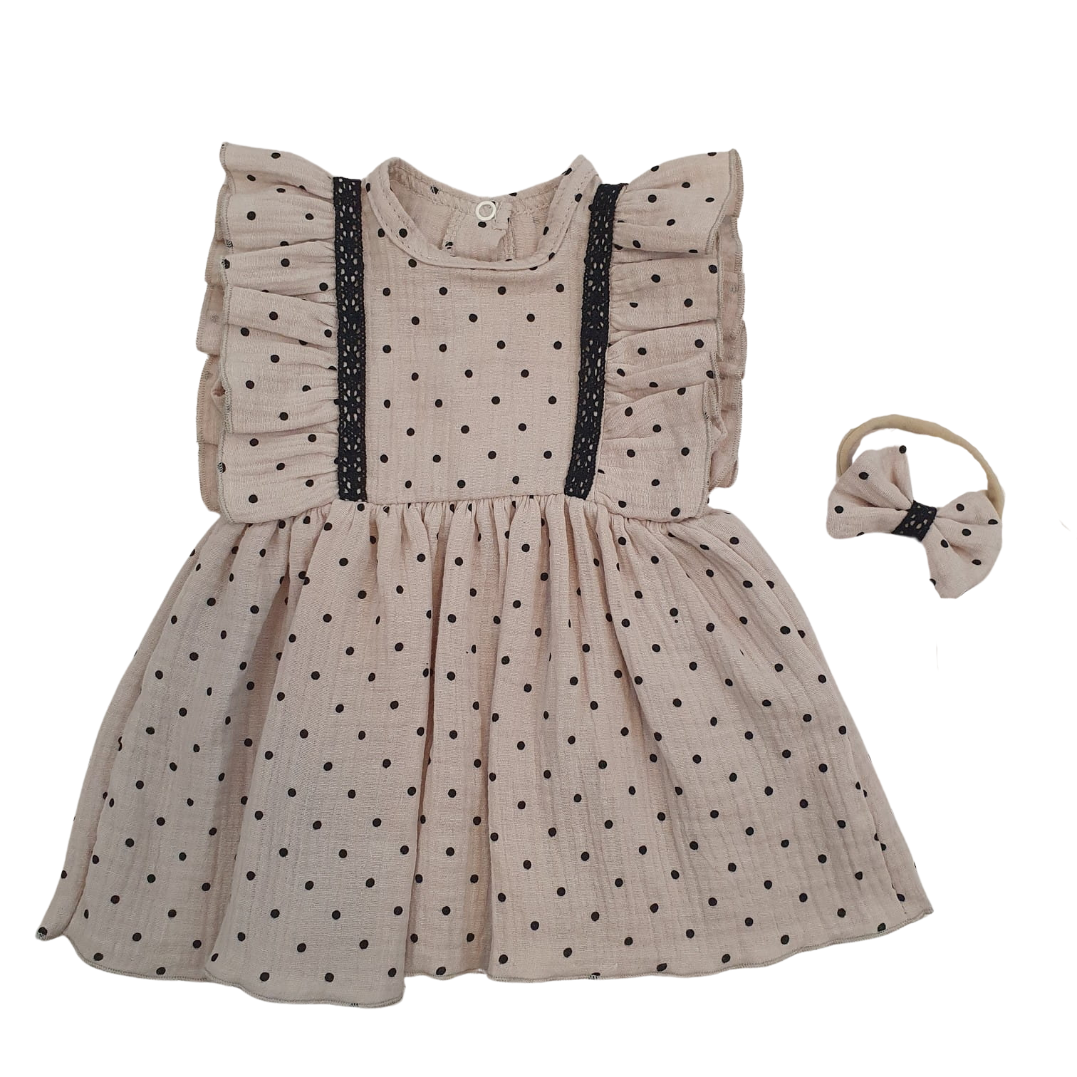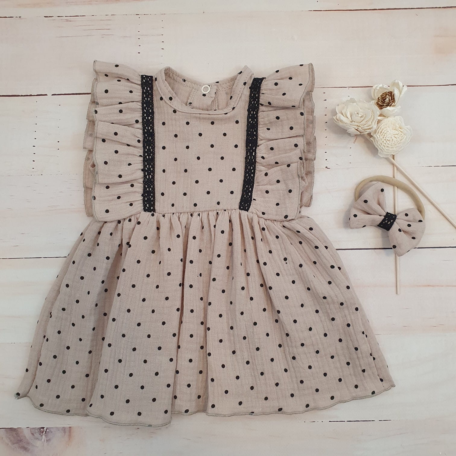 Sukienka + opaska muślinowa krótki rękaw w kropki 56-86 cloud beige