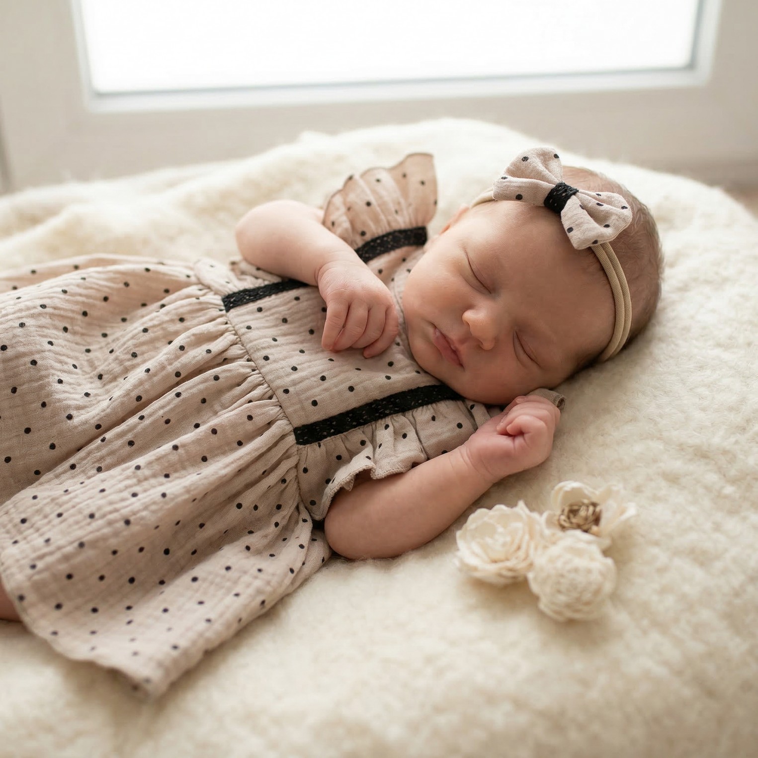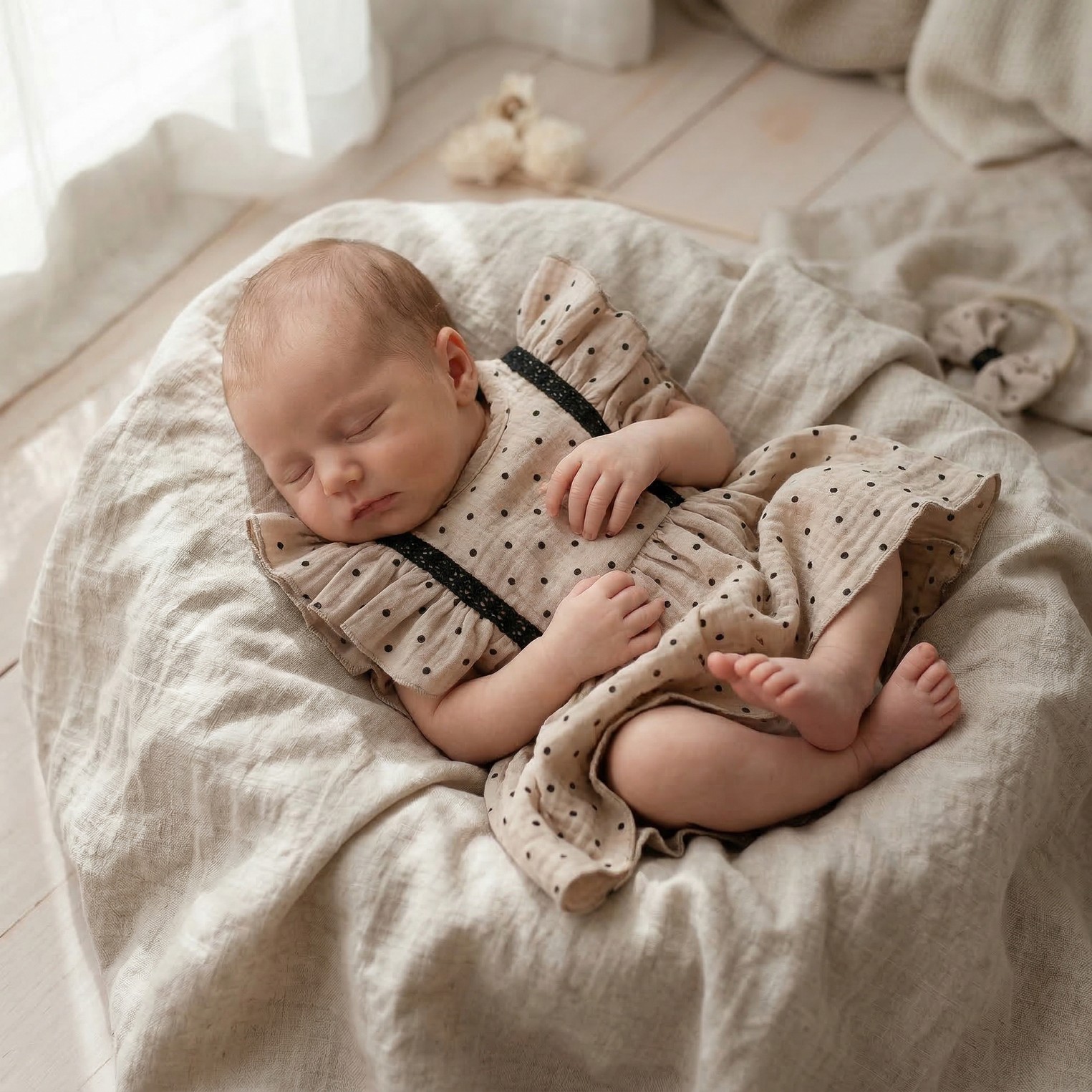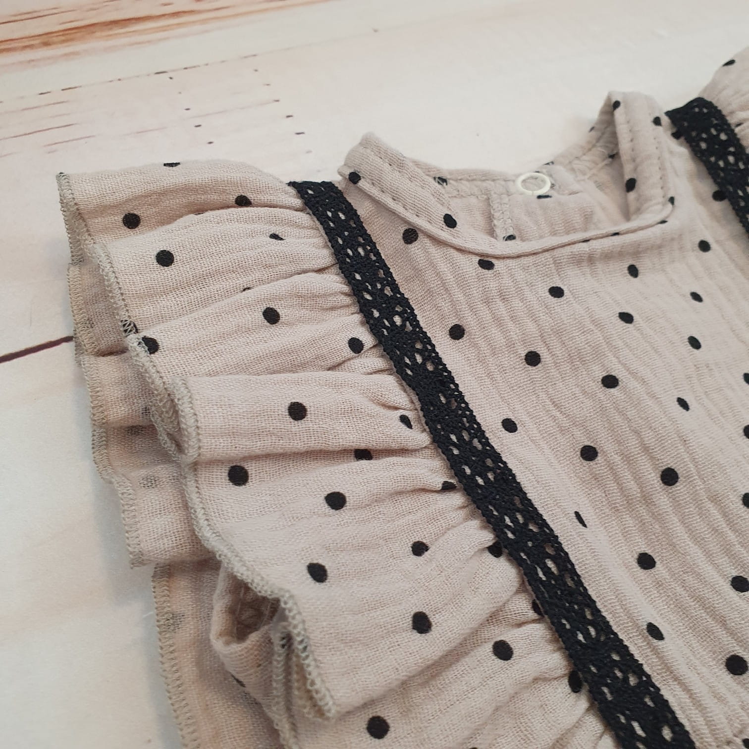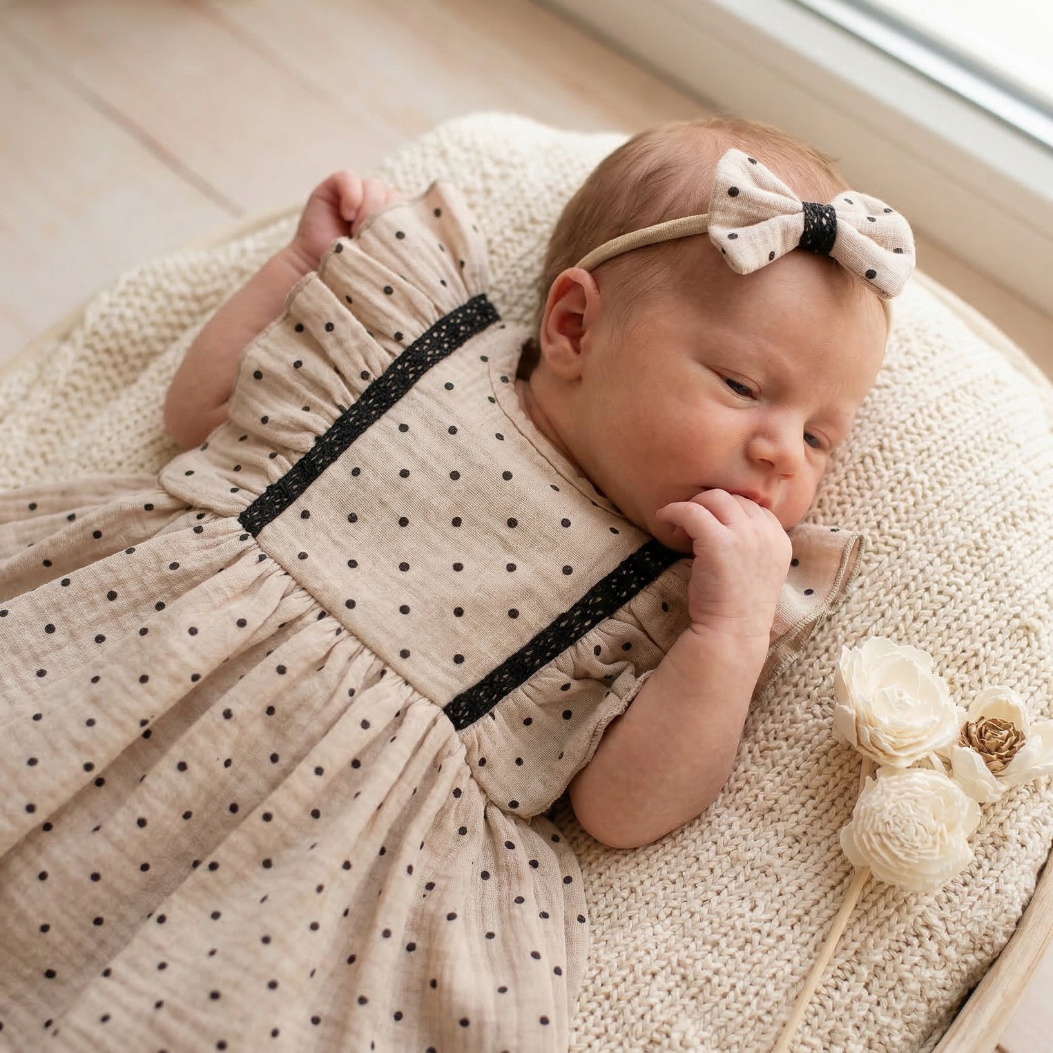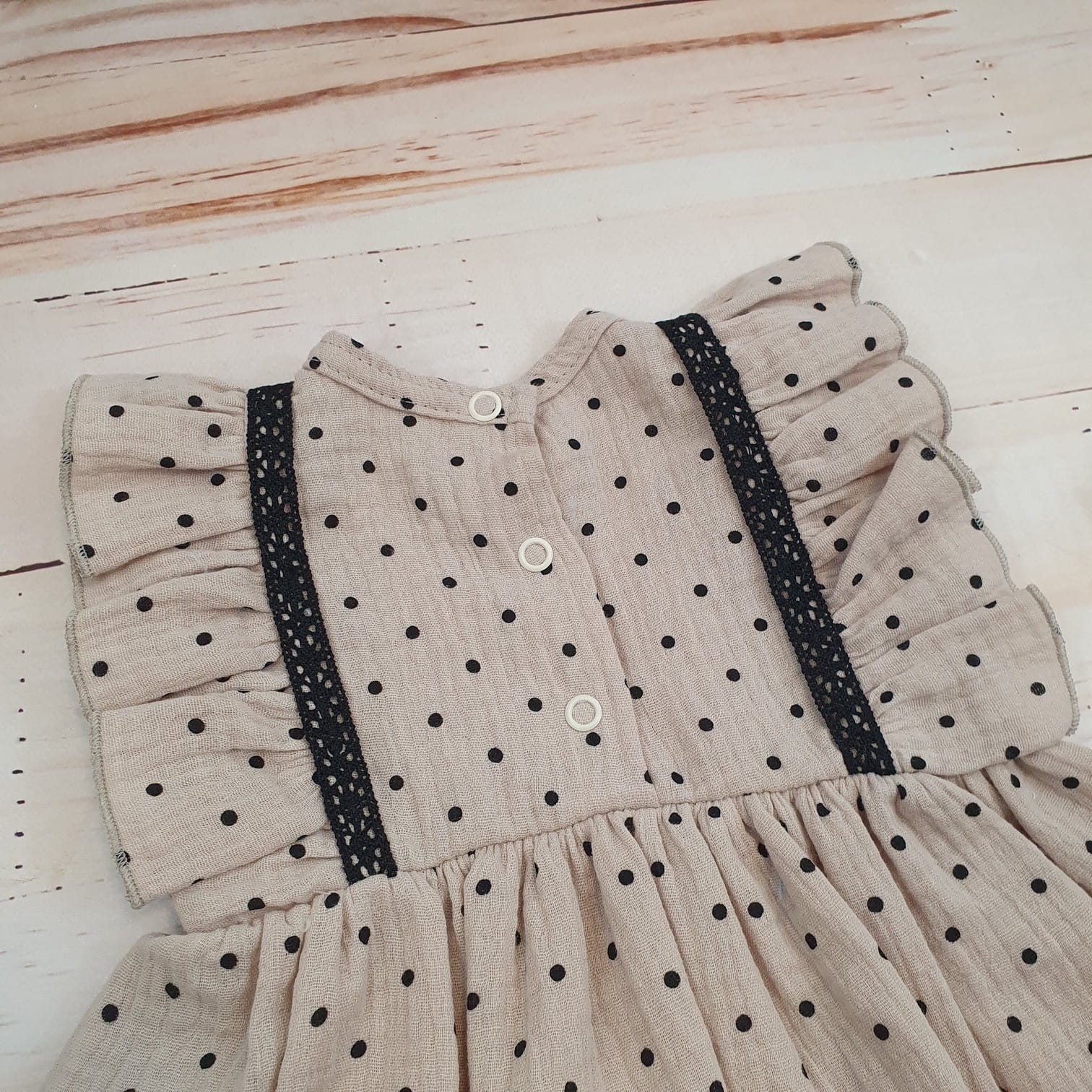 Sukienka + opaska muślinowa krótki rękaw w kropki 56-86 cloud beige