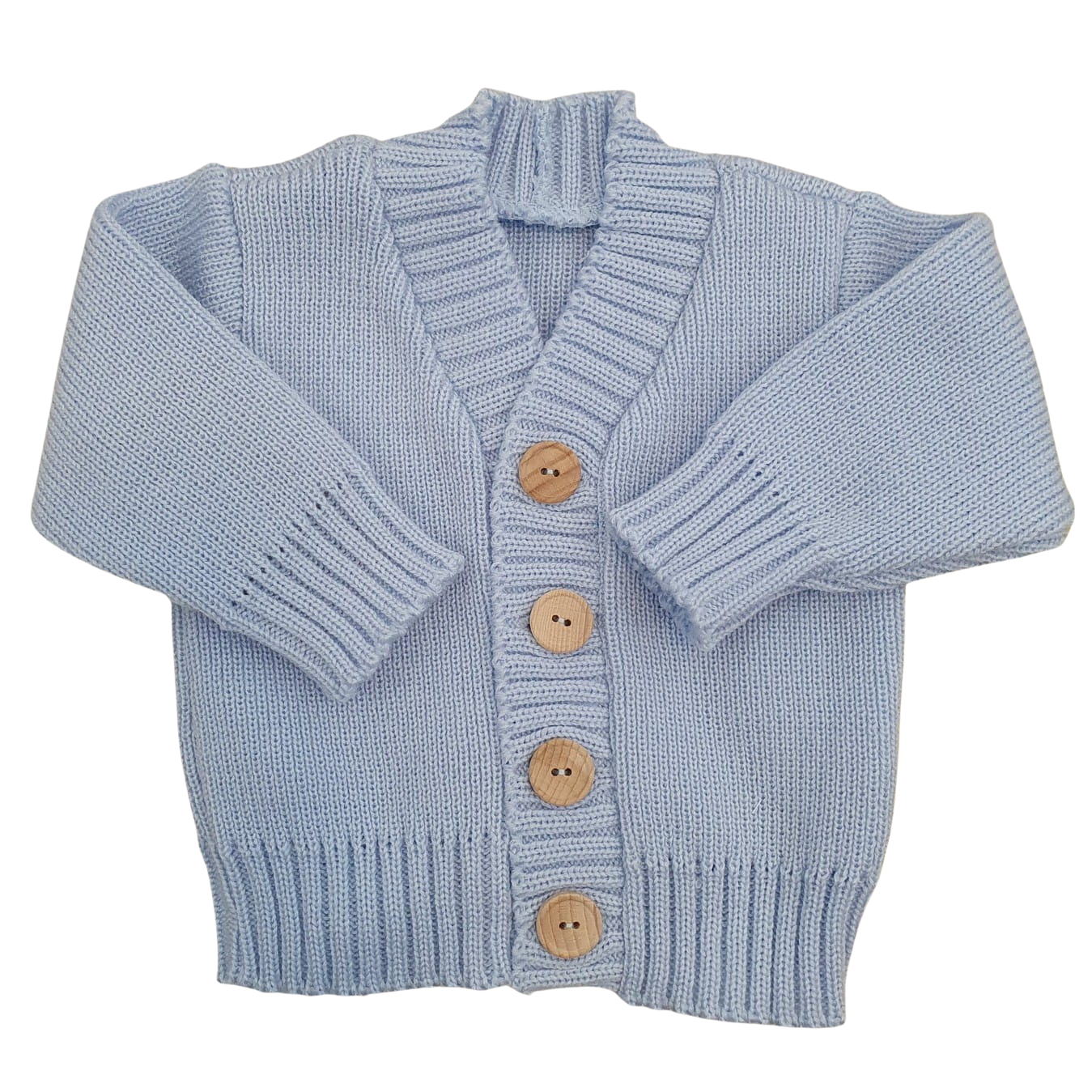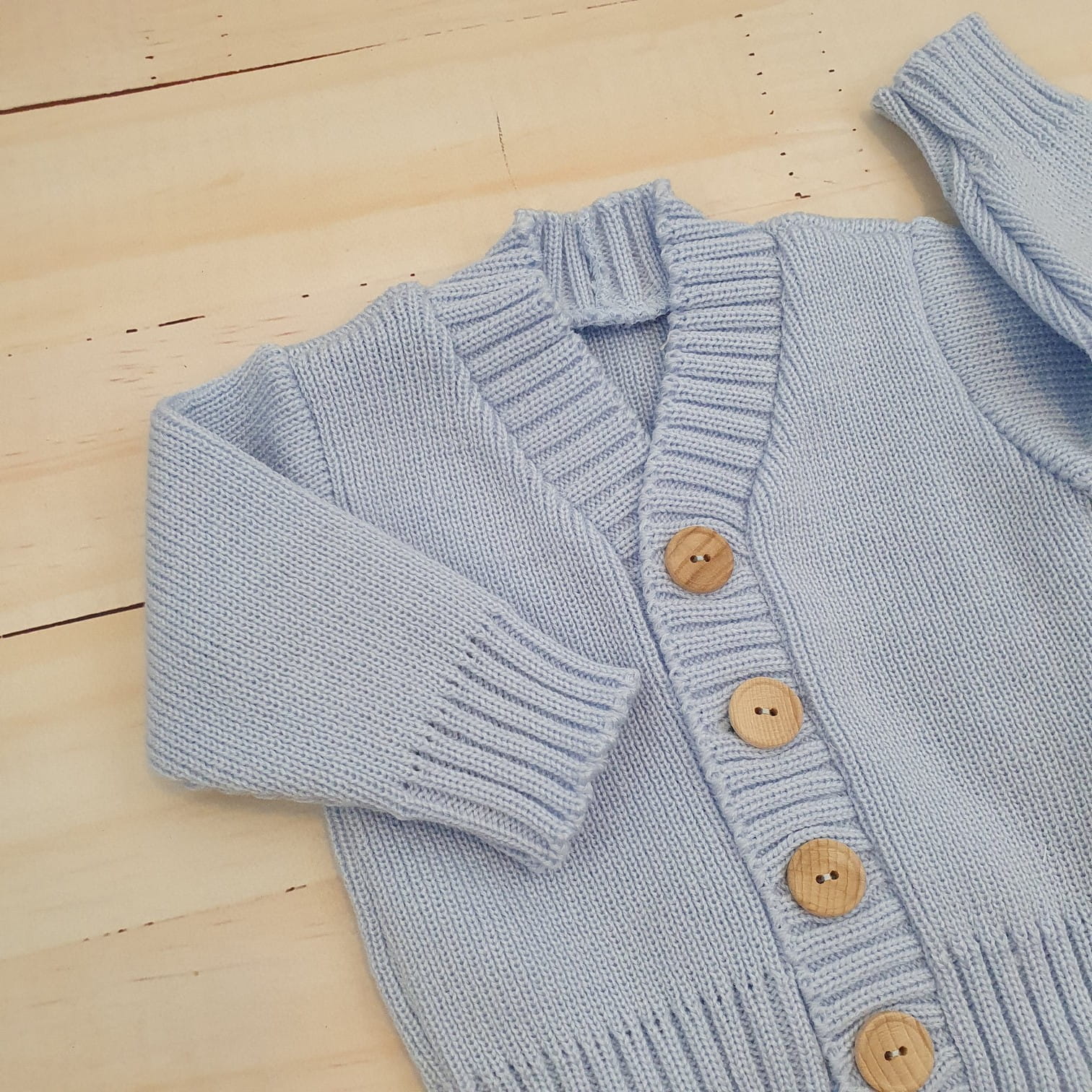 Sweterek dziergany,rozpinany, chłopięcy na chrzest z guzikami 56-86 błękitny