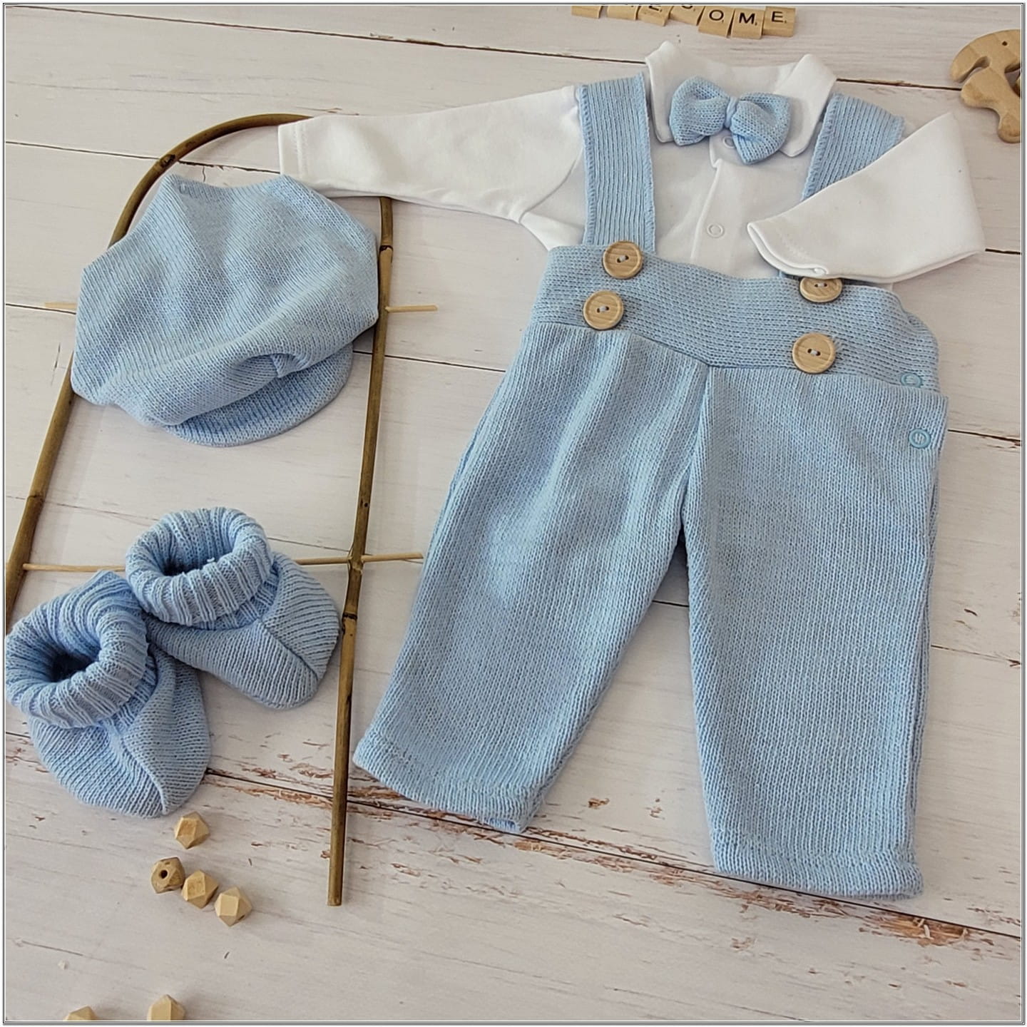 5-częściowy włóczkowy zestaw na chrzest w rozmiarach 56,62,68,74,80,86