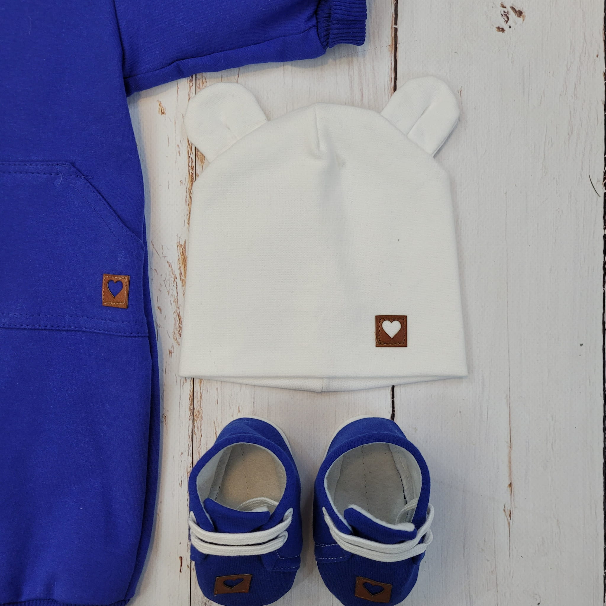Kombinezon niemowlęcy dresowy jednowarstwowy + czapeczka podwójna z uszami + buciki dresowe