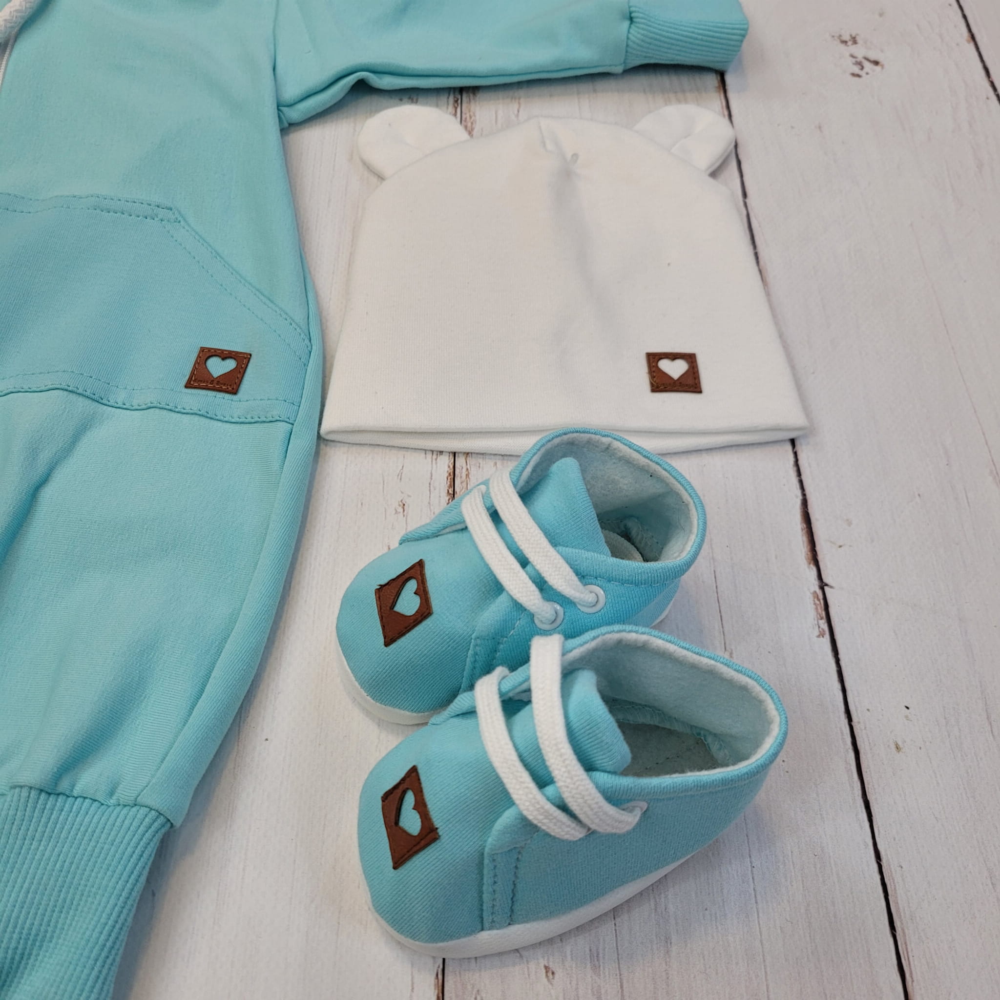 Kombinezon niemowlęcy dresowy jednowarstwowy + czapeczka podwójna z uszami + buciki dresowe
